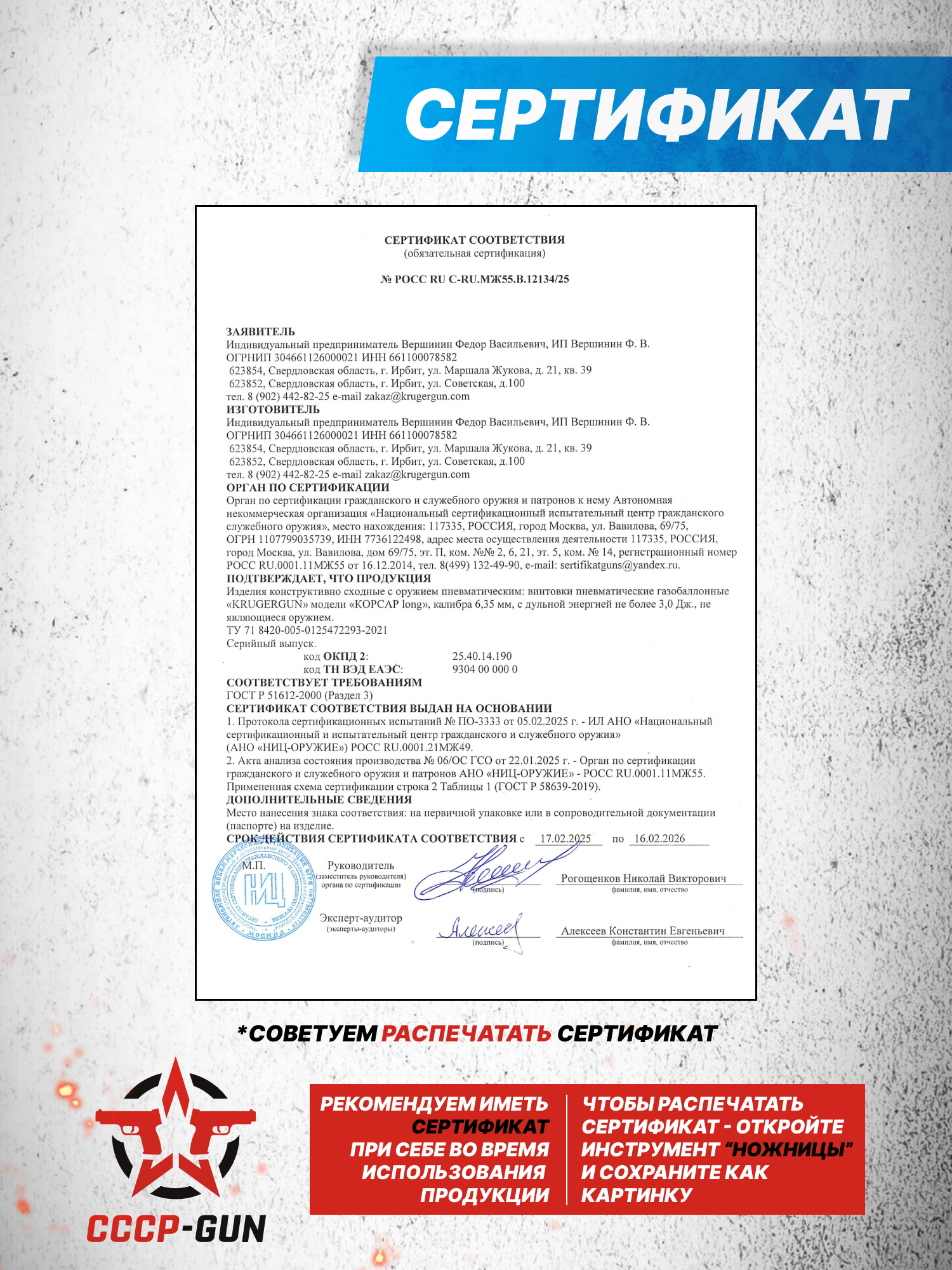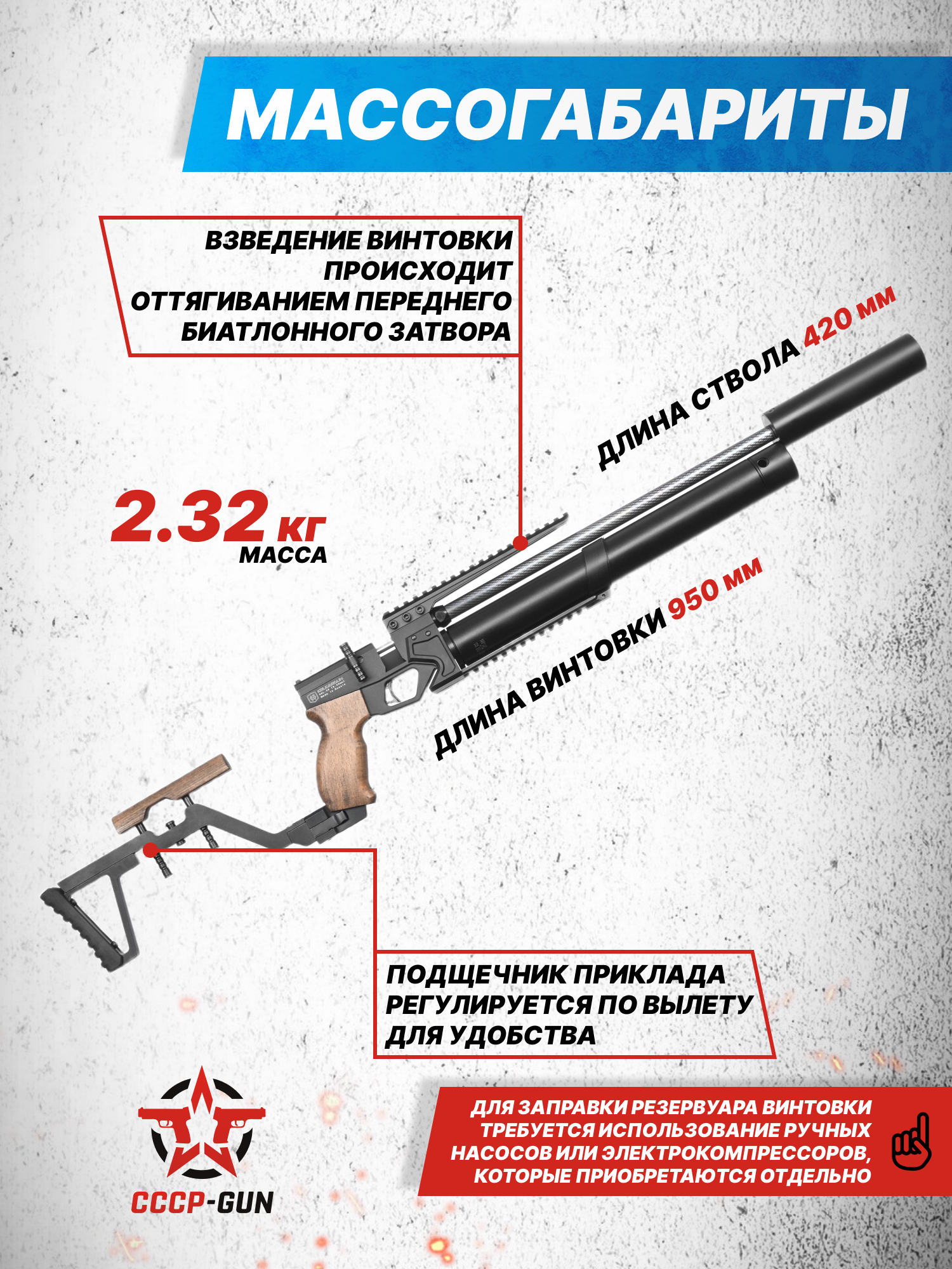 Внимание! Данная модель поставляется в разрешенной мощности для свободного приобретения на территории Российской Федерации. При этом в модели имеется возможность увеличения мощности путем замены части деталей или настройки конструкции, однако не стоит забывать о Федеральном законе «Об оружии» № 150 - ФЗ. В случае необходимости, опираясь на данный закон и руководствуясь им, возможно, потребуется получить разрешение от ЛЛР ГУ МВД России после вмешательства в конструкцию.