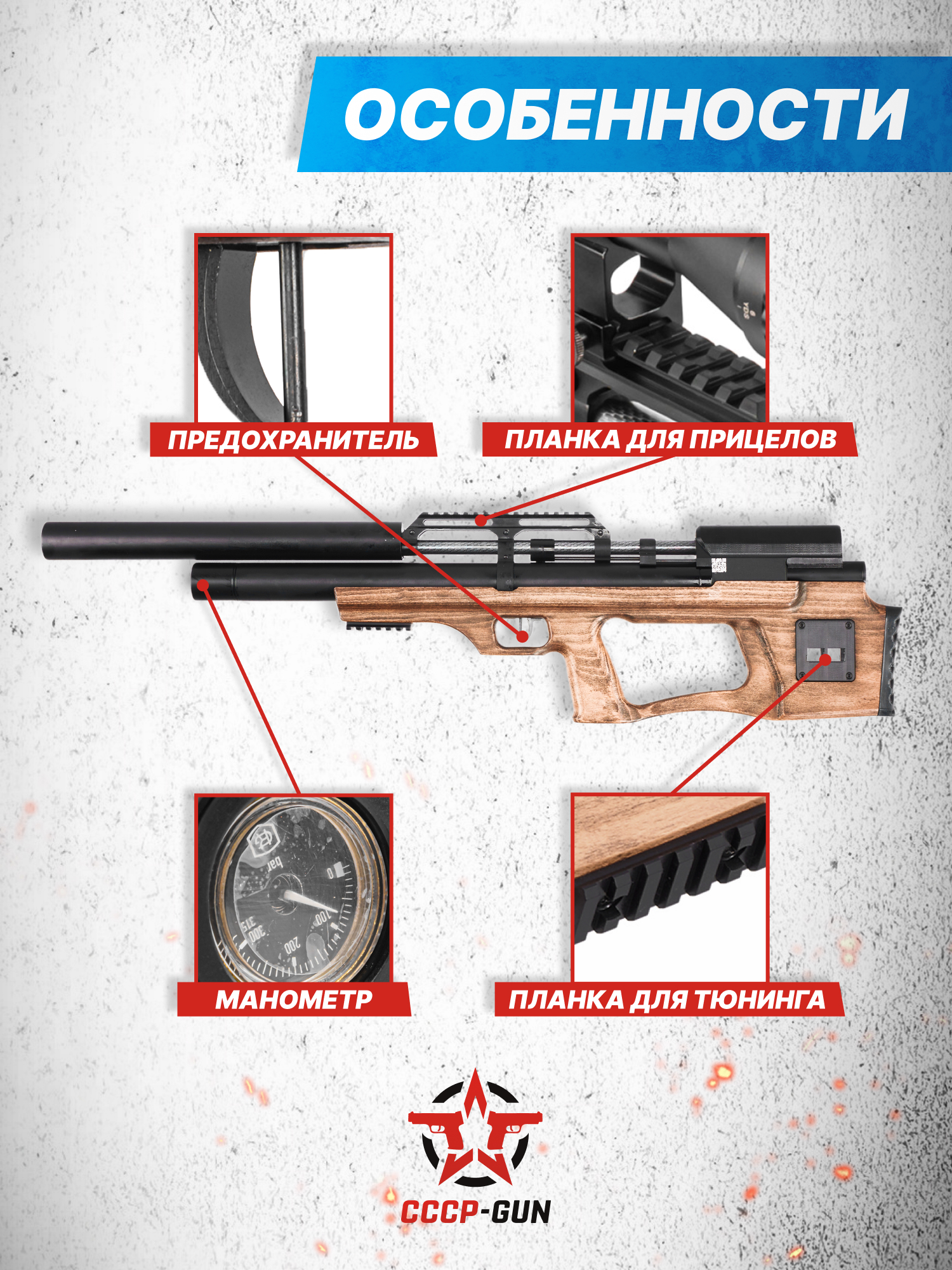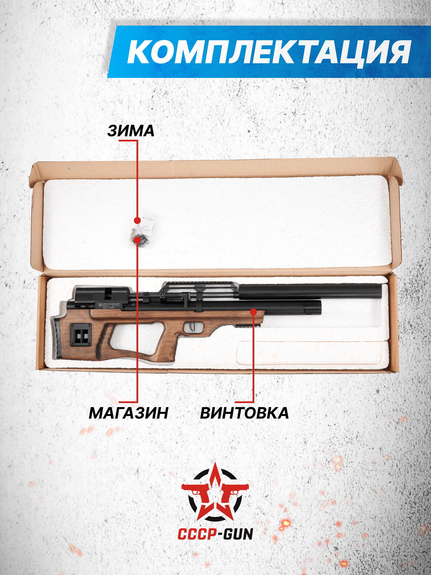 На гражданском рынке оружия большую долю занимают всевозможные типы мощных современных пневматических винтовок, которые за счет своего технического потенциала позволяют вовлекаться в разные дисциплины, не ограничиваясь развлекательной стрельбой. На выпуске продукции такого формата специализируется российский завод Kruger Gun, представляющая линейку моделей РСР пневматики Снайпер, к числу которых относится представленный товар.