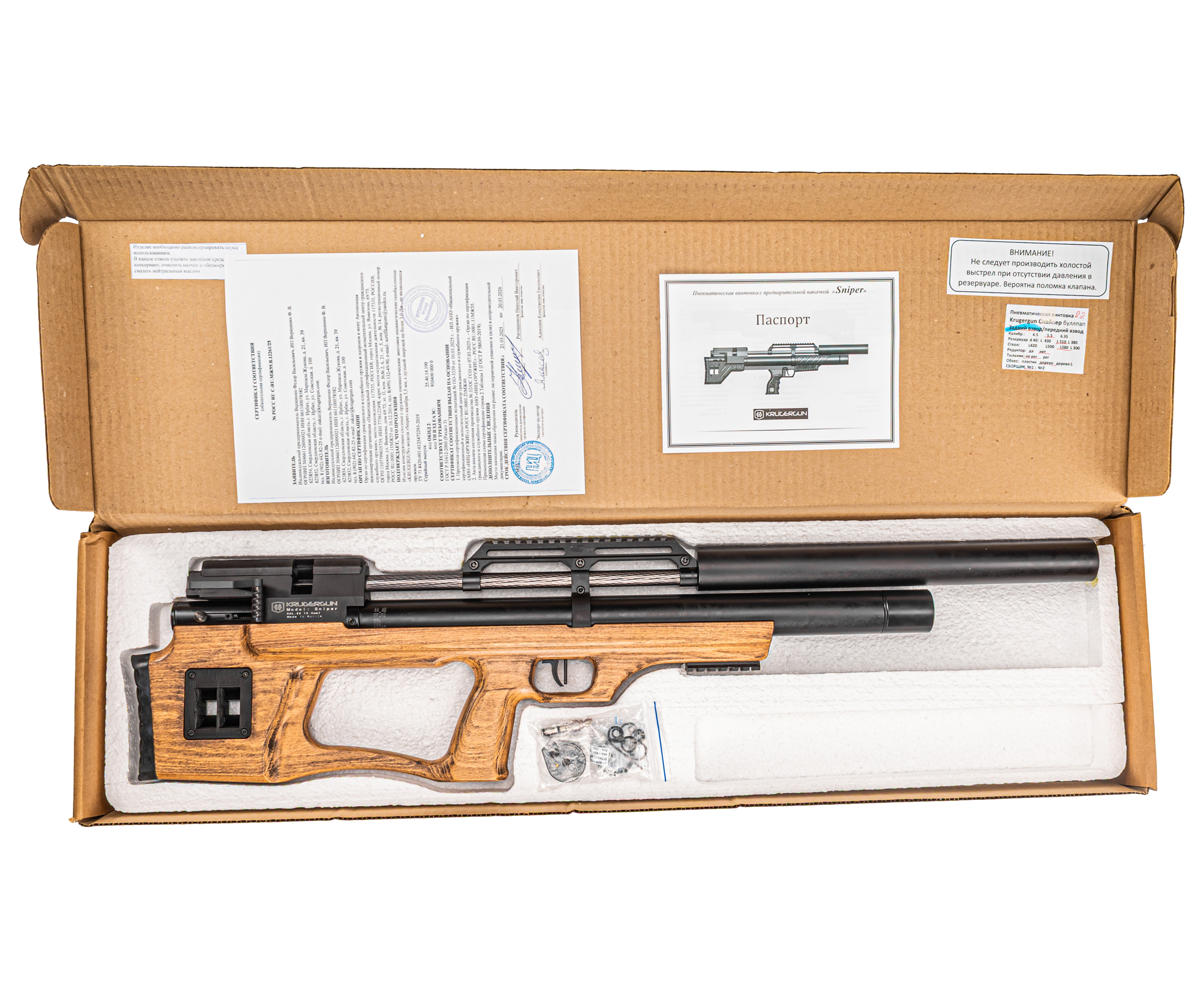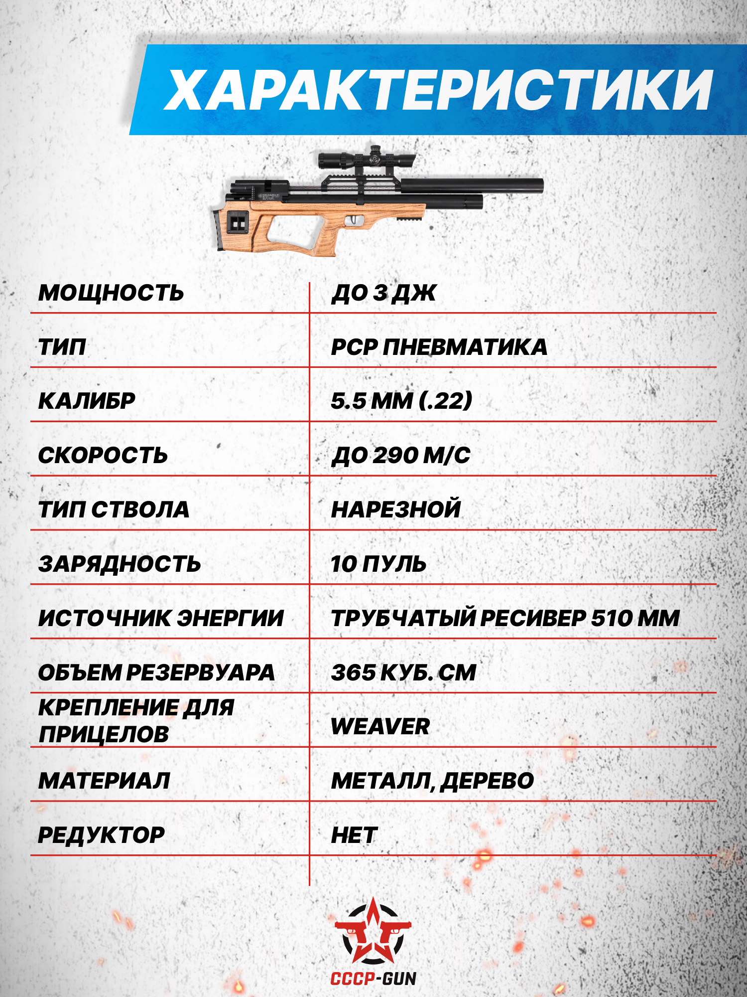 Пневматическая винтовка KrugerGun 5.5 Снайпер PCP BP по требованиям российского законодательства классифицируется как конструктивно схожее с оружием изделие, дульная энергия выстрела из которого не превышает трех Джоулей, что говорит о возможности свободного приобретения образца. Усиленные же модели способны продемонстрировать скорость полета пули, достигающую 290-300 метров в секунду.