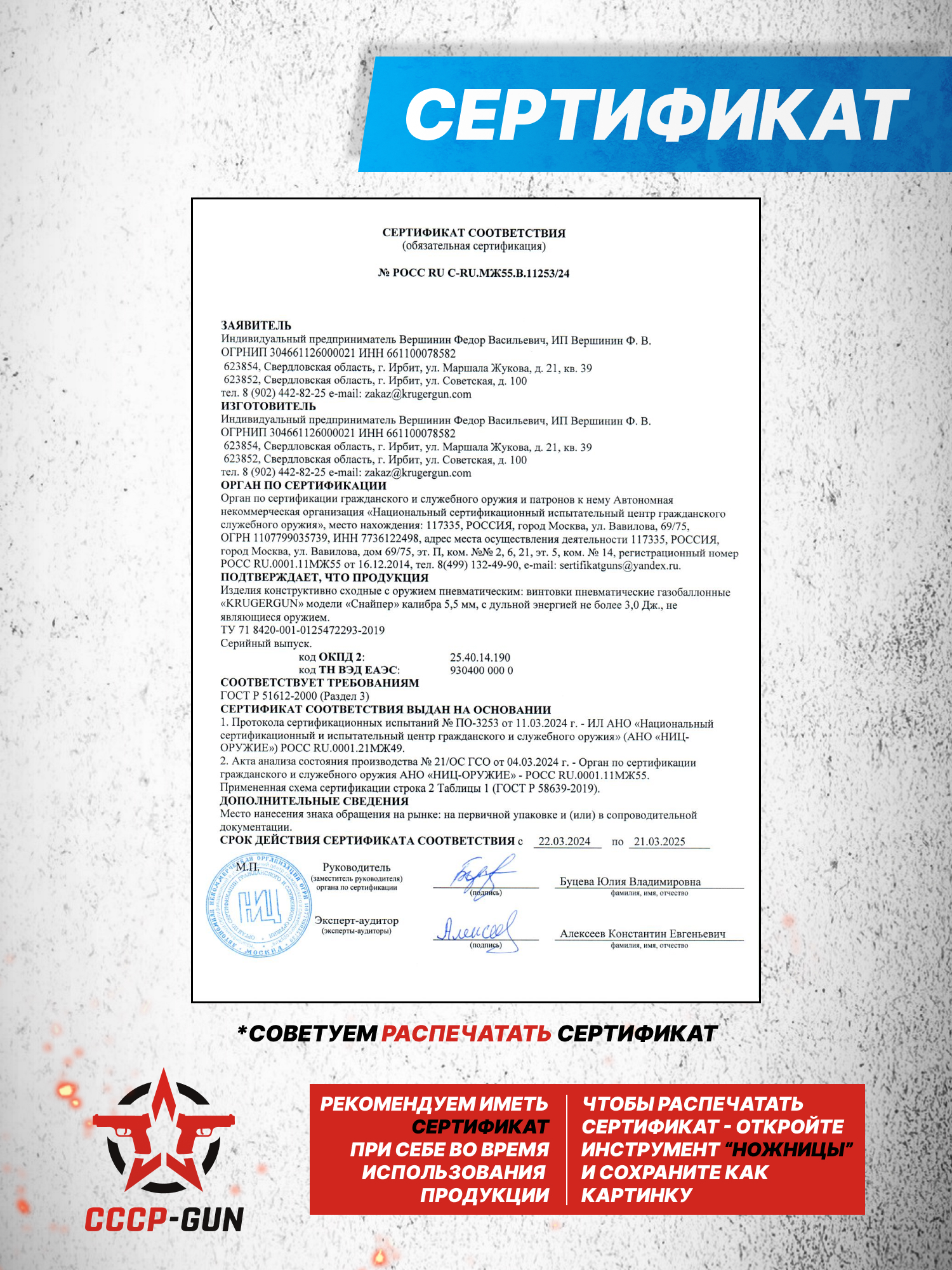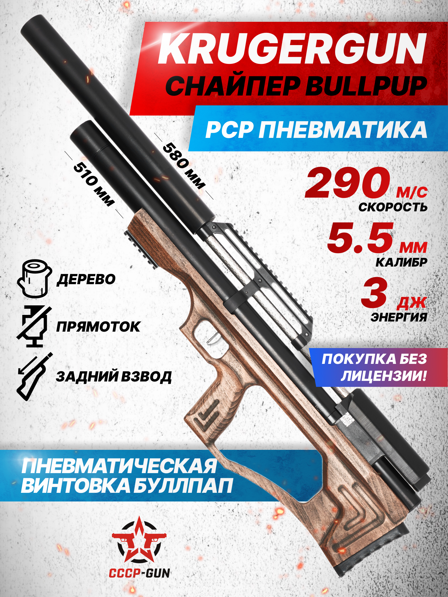 Согласно информации изготовителя, после выстрела стандартный по массе свинцовый воланчиковый снаряд способен развивать скорость полета до 300 метров в секунду, что говорит о возможности точного поражения целей не только на коротких дистанциях отдаления. Требуется упомянуть, что на российском рынке гражданского оружия представленная ПСП винтовка КрюгерГан Снайпер 5.5 мм продается свободно за счет ограничения производителем показателя дульной энергии на отметке не больше 3 Джоулей.