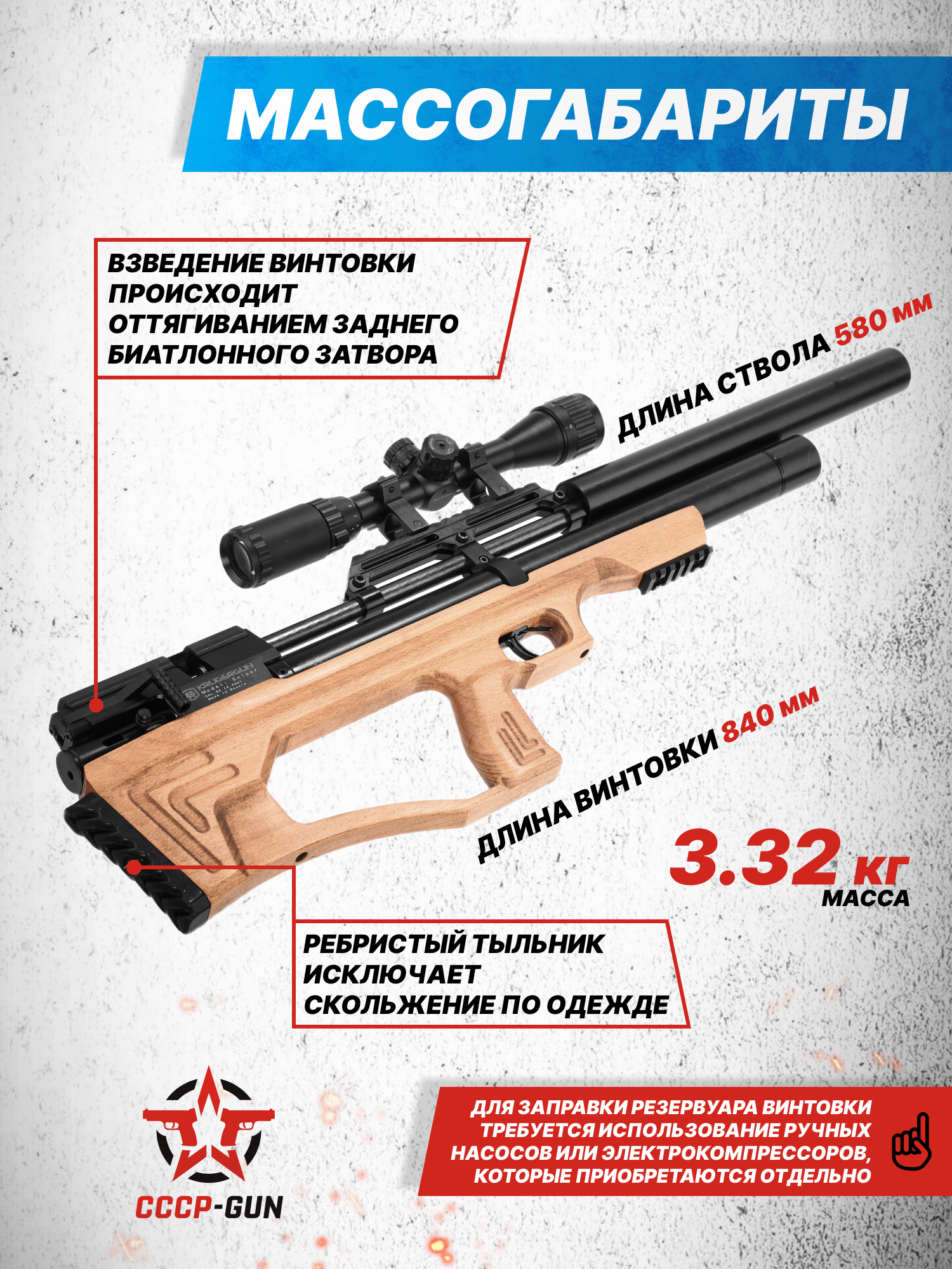 Внимание! Данная модель поставляется в разрешенной мощности для свободного приобретения на территории Российской Федерации. При этом в модели имеется возможность увеличения мощности путем замены части деталей или настройки конструкции, однако не стоит забывать о Федеральном законе «Об оружии» № 150 - ФЗ. В случае необходимости, опираясь на данный закон и руководствуясь им, возможно, потребуется получить разрешение от ЛЛР ГУ МВД России после вмешательства в конструкцию.