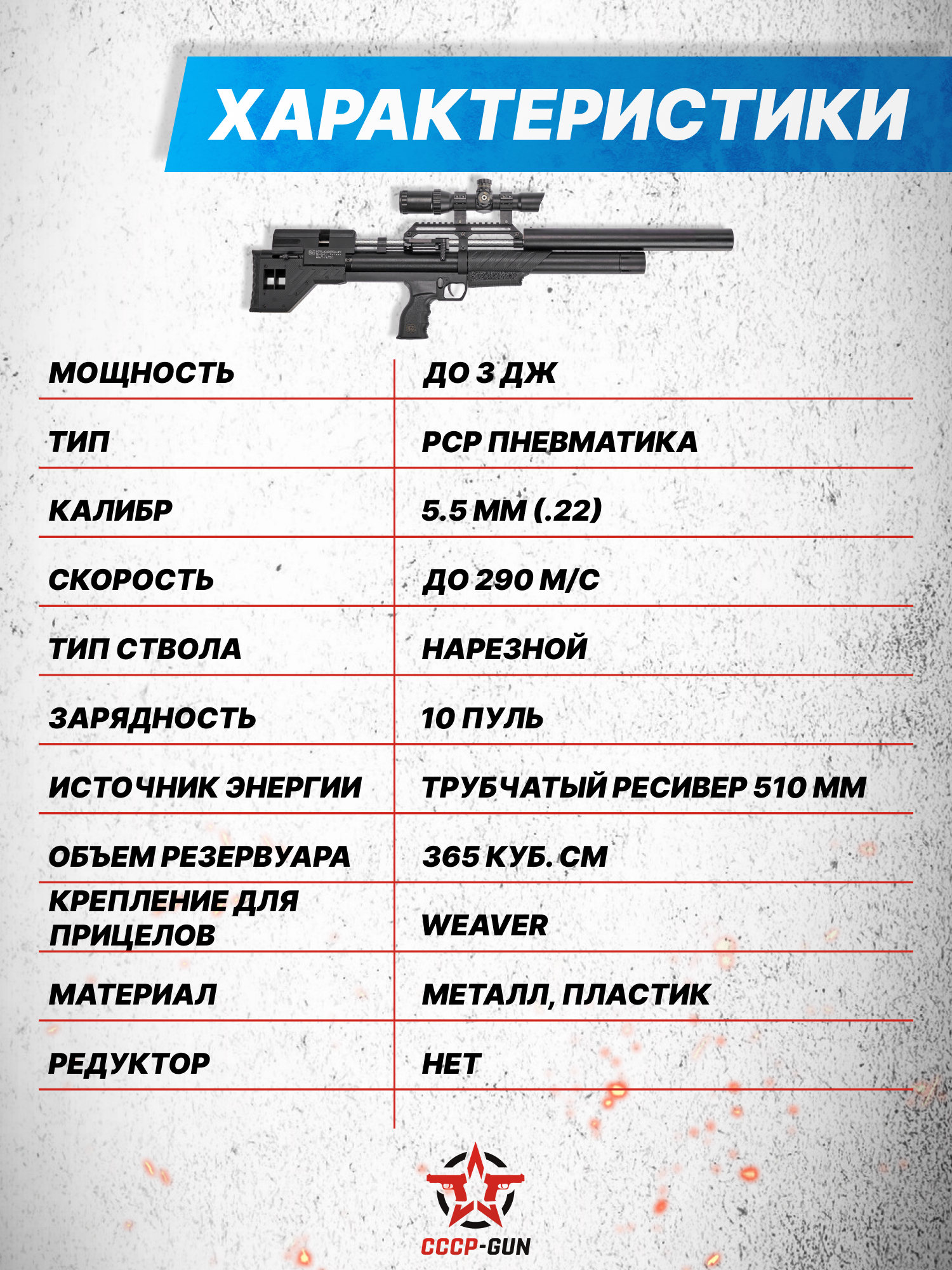 В этом исполнении винтовка способна разогнать свинцовый боеприпас до начальной скорости, равной 290 метрам в секунду - на этом фоне модель допускается использовать для отработки целей на удаленных дистанциях. Однако, относительно требований в законодательстве России, пневматика подвергается намеренному ограничению мощности до 3 Джоулей на стадии изготовления. За счет этого совершеннолетние пользователи могут приобрести это изделие без лицензии