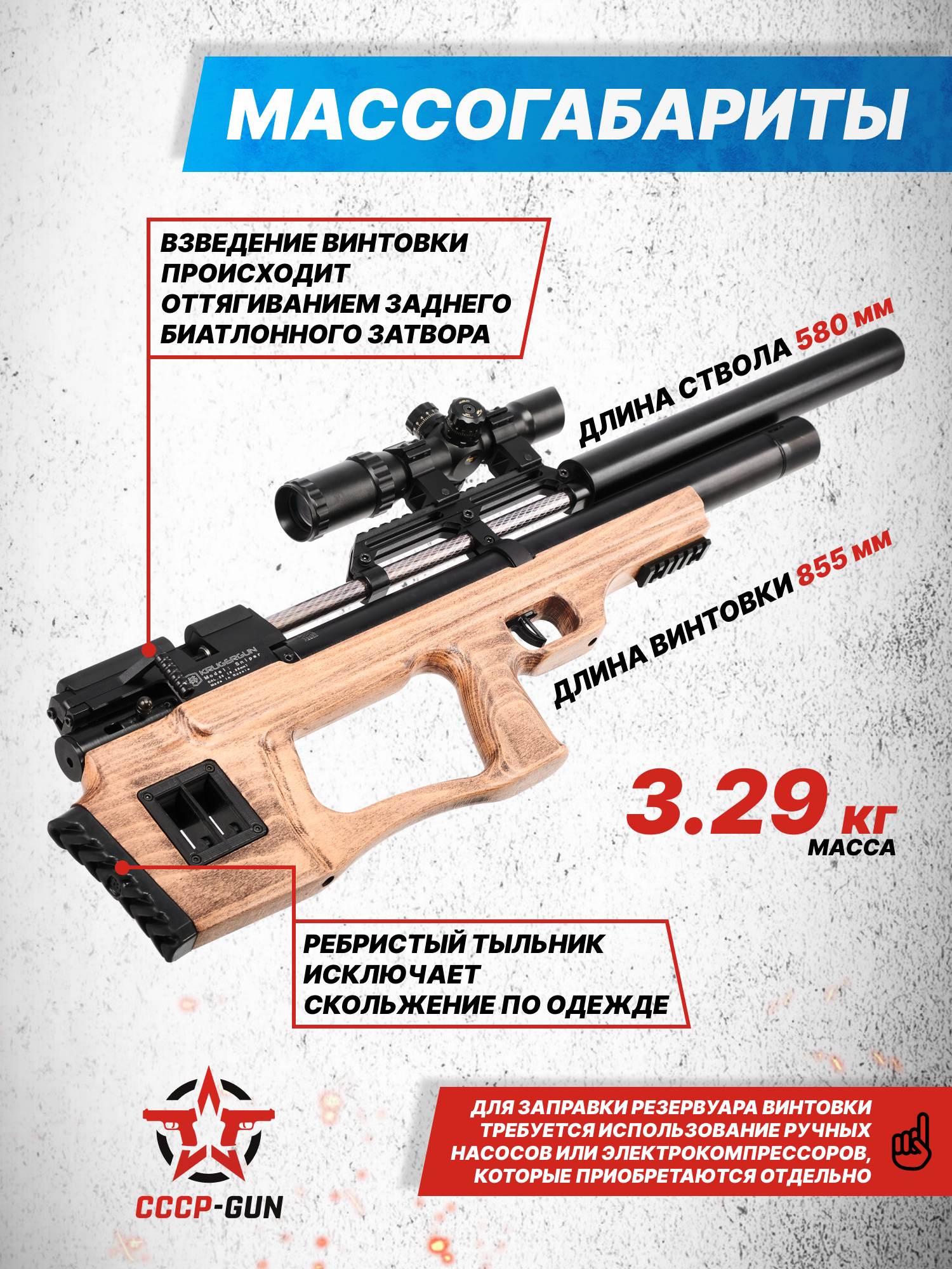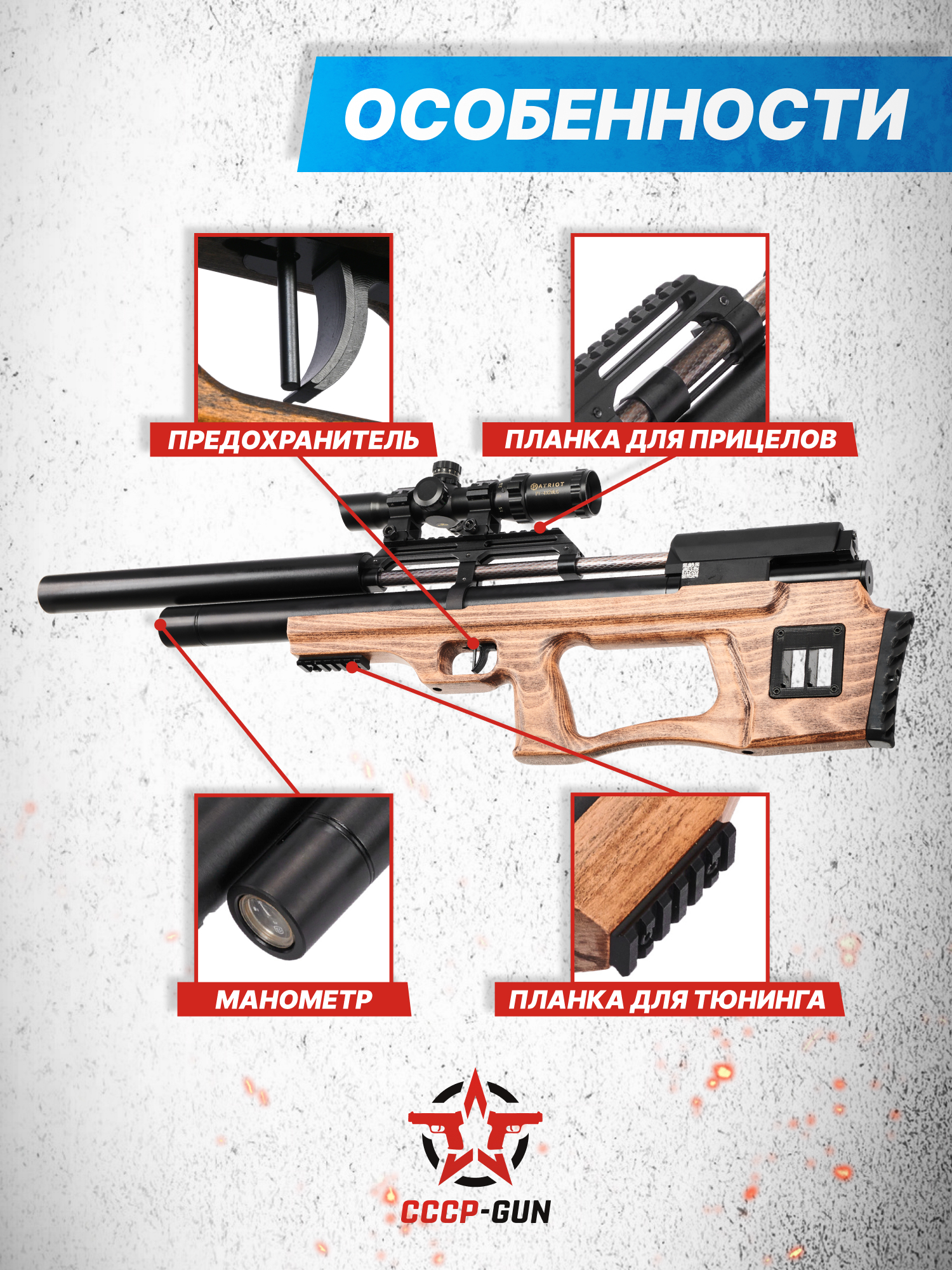 В указанный модельный ряд входит рассматриваемый образец пневматики, выделяющийся компактным габаритом в 855 миллиметров при длине бланка в 580 миллиметров. Таких показателей производителю удалось достичь за счет обращения к формату компоновки конструкции типа Bull-Pup, при которой ствольная группа смещается за спусковой механизм к прикладу винтовки.