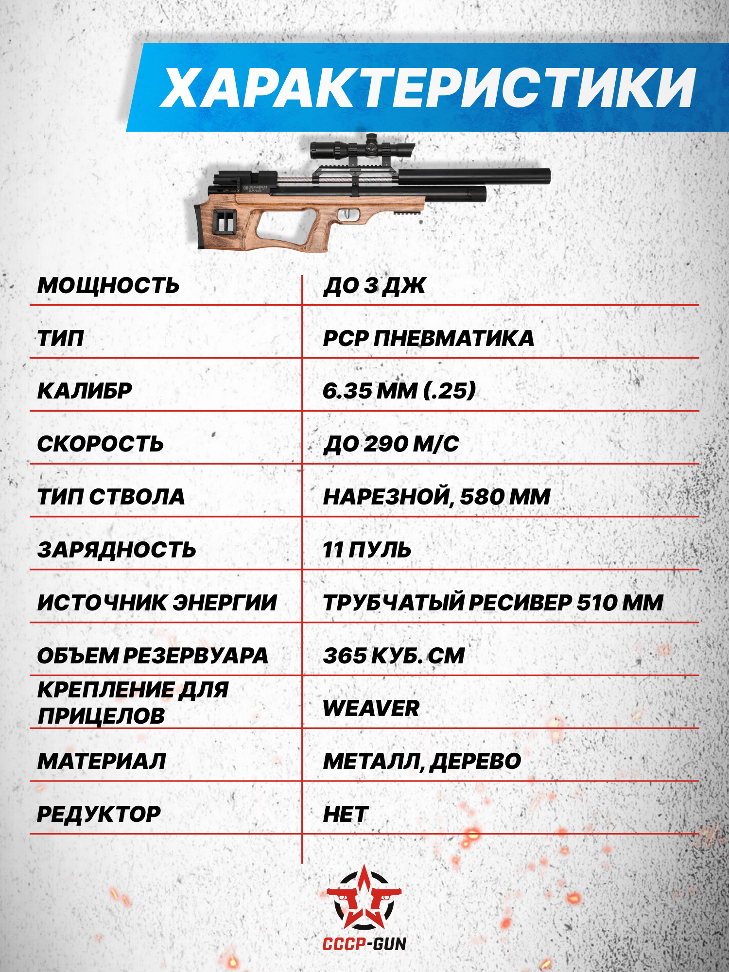 Классифицируется представленная модель пневматической винтовки как PCP оружие, использующее для выстрела энергию расширения газообразной массы, которая в сжатом под давлением состоянии содержится в специальном подствольном баллоне. Штатный резервуар цилиндрического типа способен вмещать до 365 кубических сантиметров воздуха, закачиваемого посредством электрических компрессоров или ручных насосных станций.