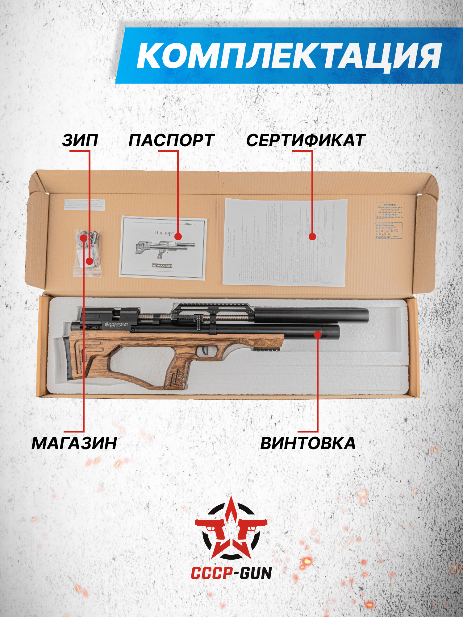 Среди ассортимента компании выделяется серия пневматических винтовок Снайпер в буллпап компоновке. Эти винтовки изготавливаются в большом количестве всевозможных комплектаций, что дает каждому пользователю среди представленного ассортимента подобрать винтовку Крюгера под конкретные задачи.