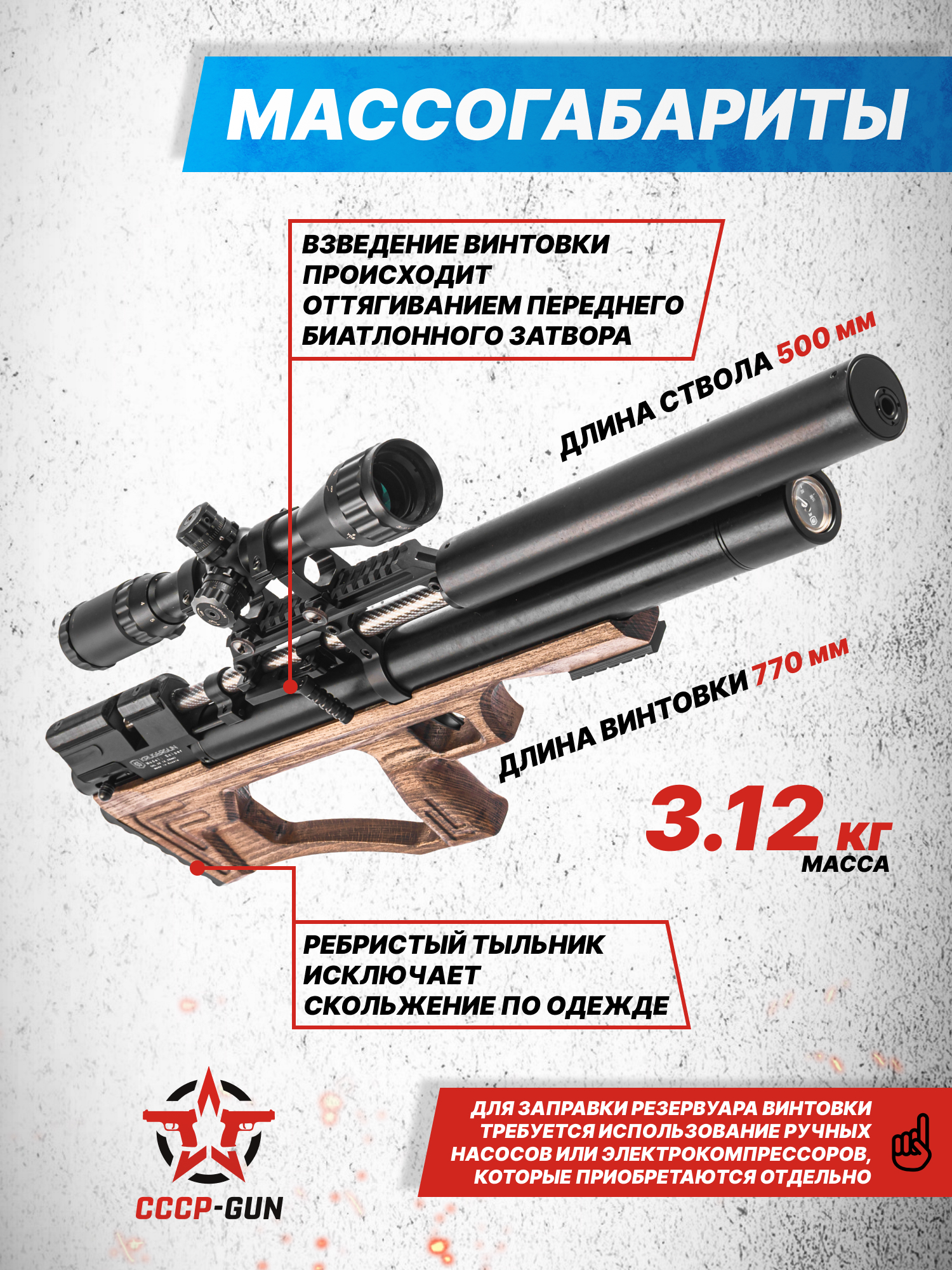 Внимание! Данная модель поставляется в разрешенной мощности для свободного приобретения на территории Российской Федерации. При этом в модели имеется возможность увеличения мощности путем замены части деталей или настройки конструкции, однако не стоит забывать о Федеральном законе «Об оружии» № 150 - ФЗ. В случае необходимости, опираясь на данный закон и руководствуясь им, возможно, потребуется получить разрешение от ЛЛР ГУ МВД России после вмешательства в конструкцию.