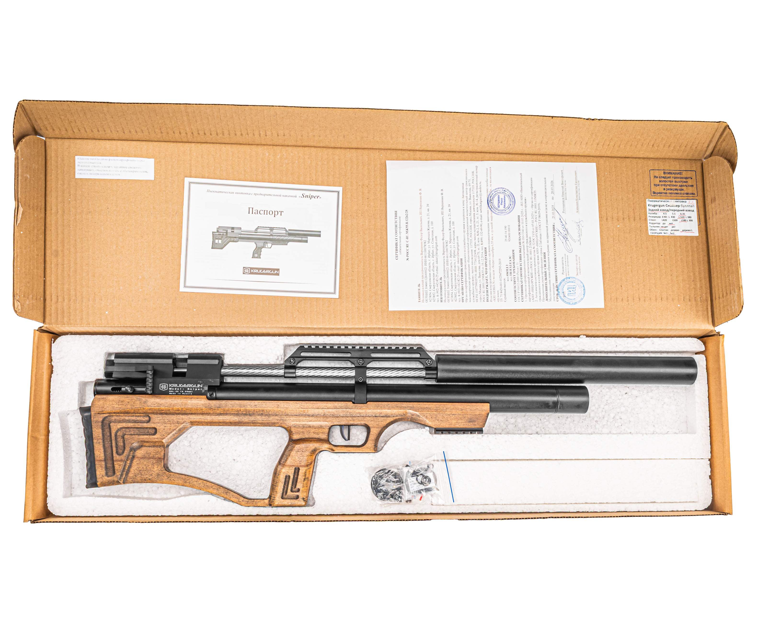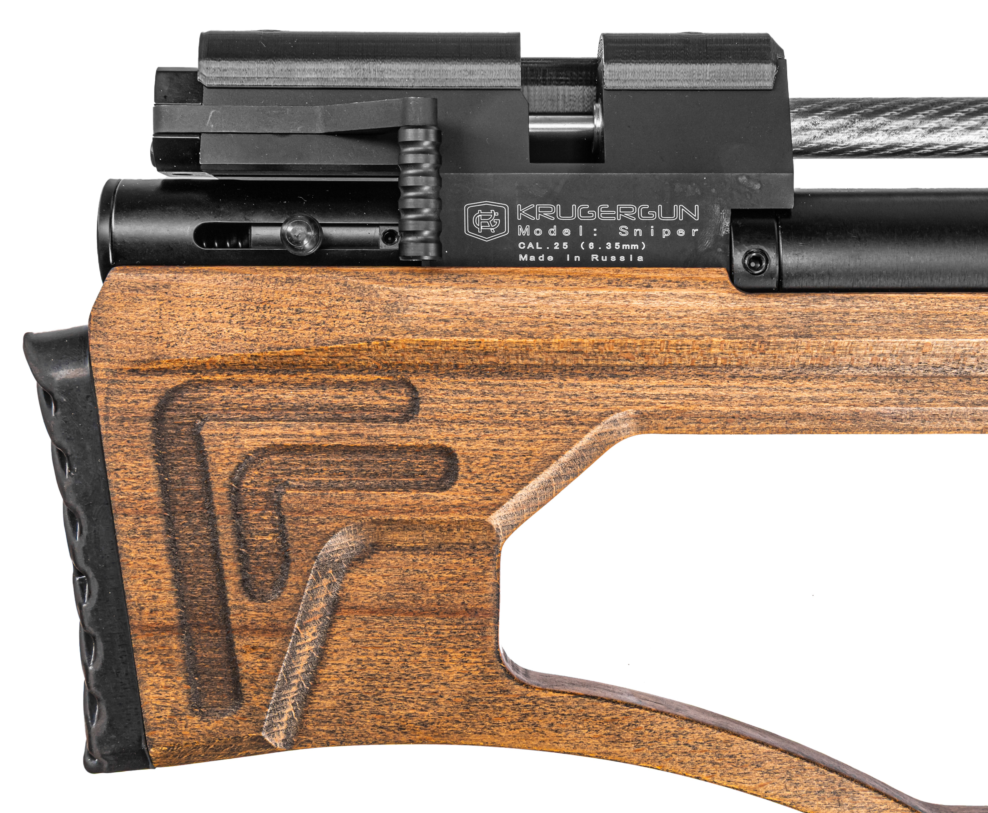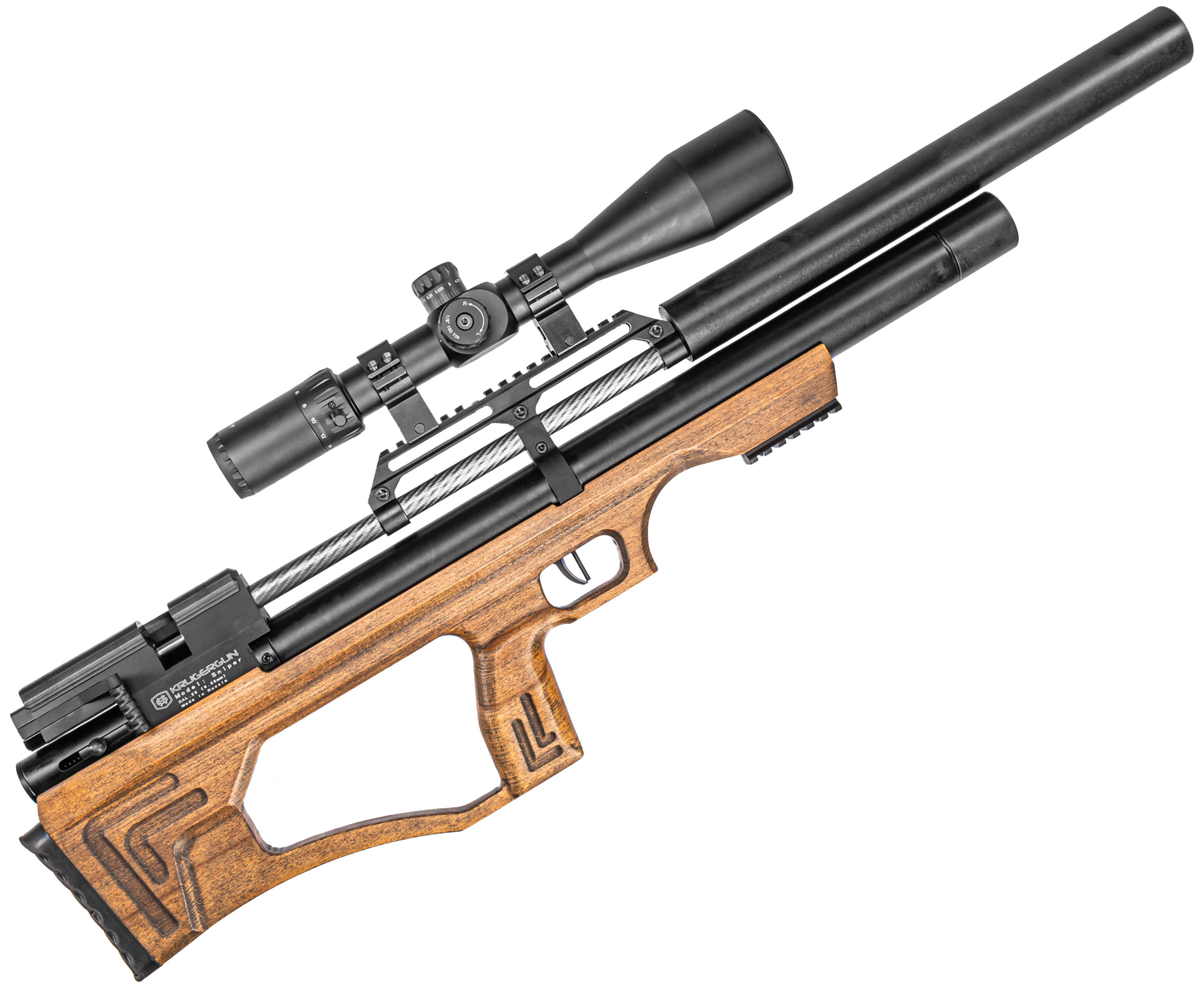 Производством пневматического оружия для гражданского рынка занимается множество зарубежных, а также отечественных брендов, представляющих богатую коллекцию пистолетов и винтовок под любые задачи. К перечню именитых компаний из России относится фирма KrugerGun, которая заработала репутацию производителя мощных и высокоточных образцов PCP «воздушек». Ассортимент продукции изготовителя пополнился новой линейкой длинноствольной пневматики Снайпер в исполнении Bull-Pup.