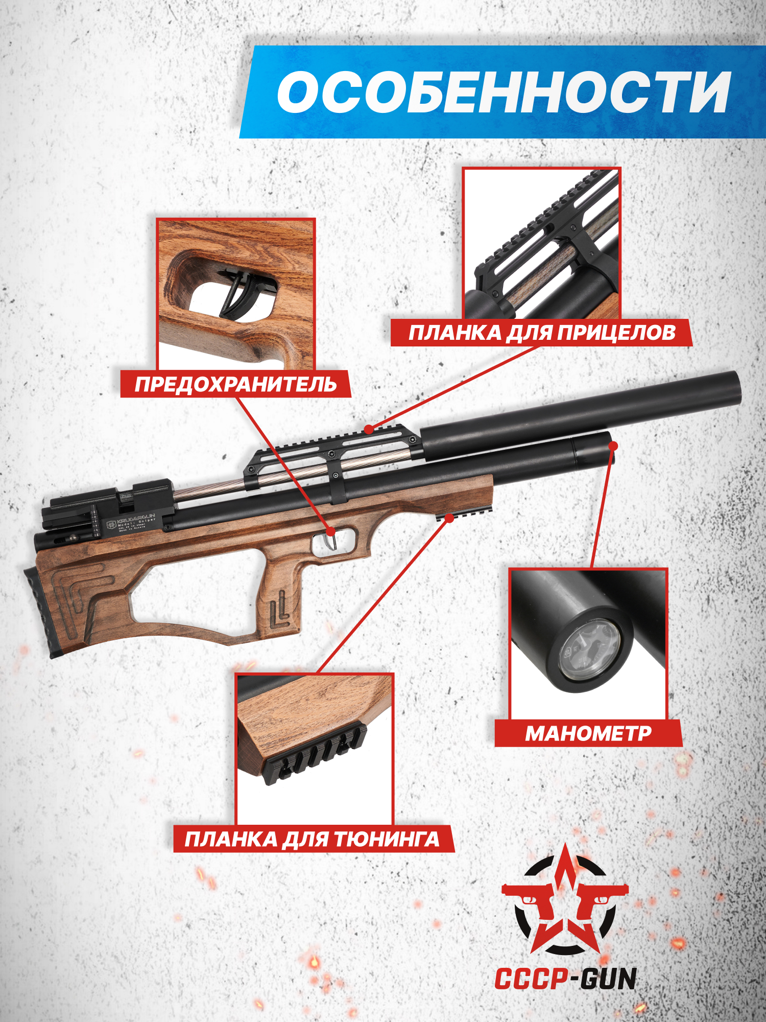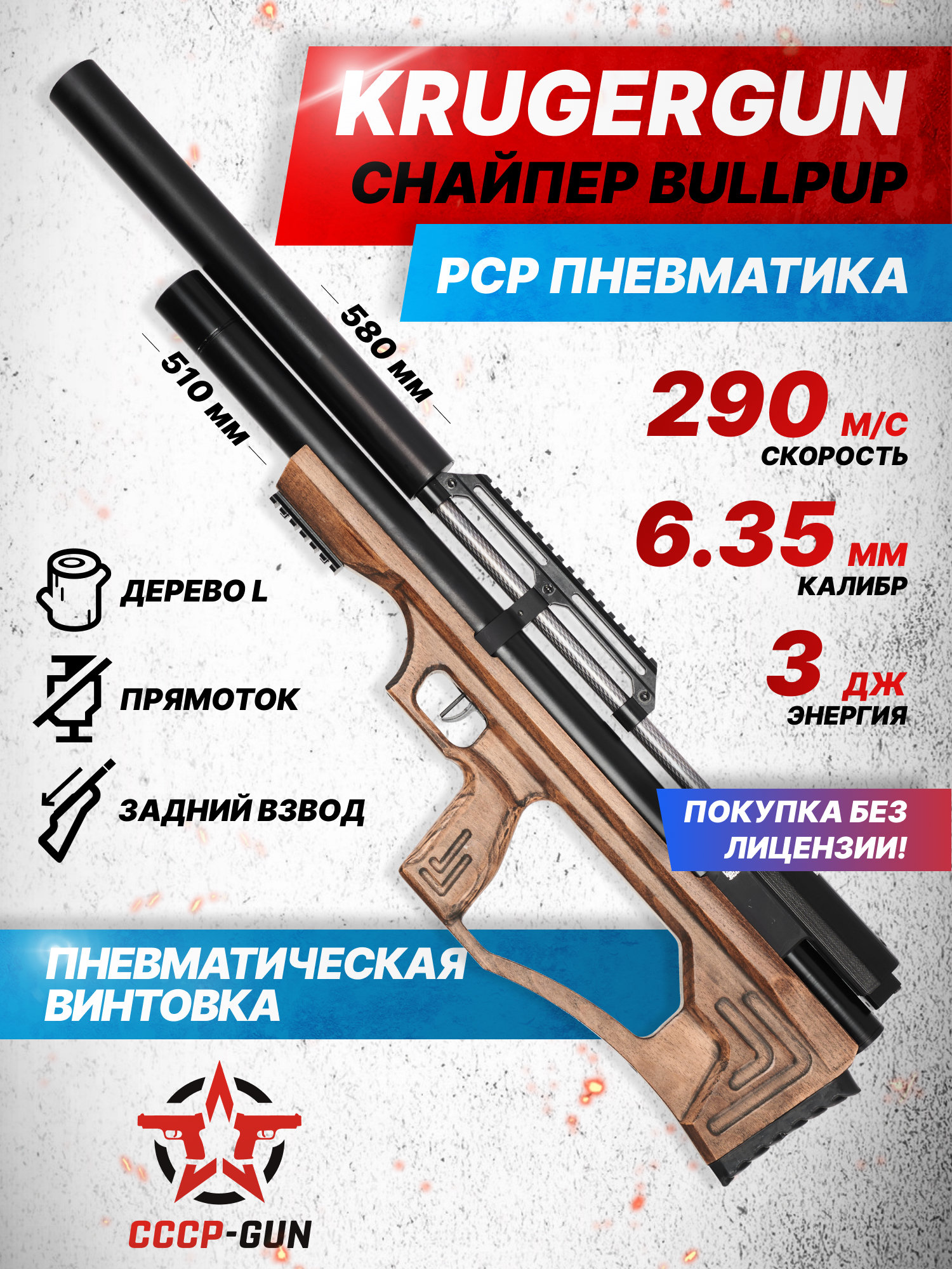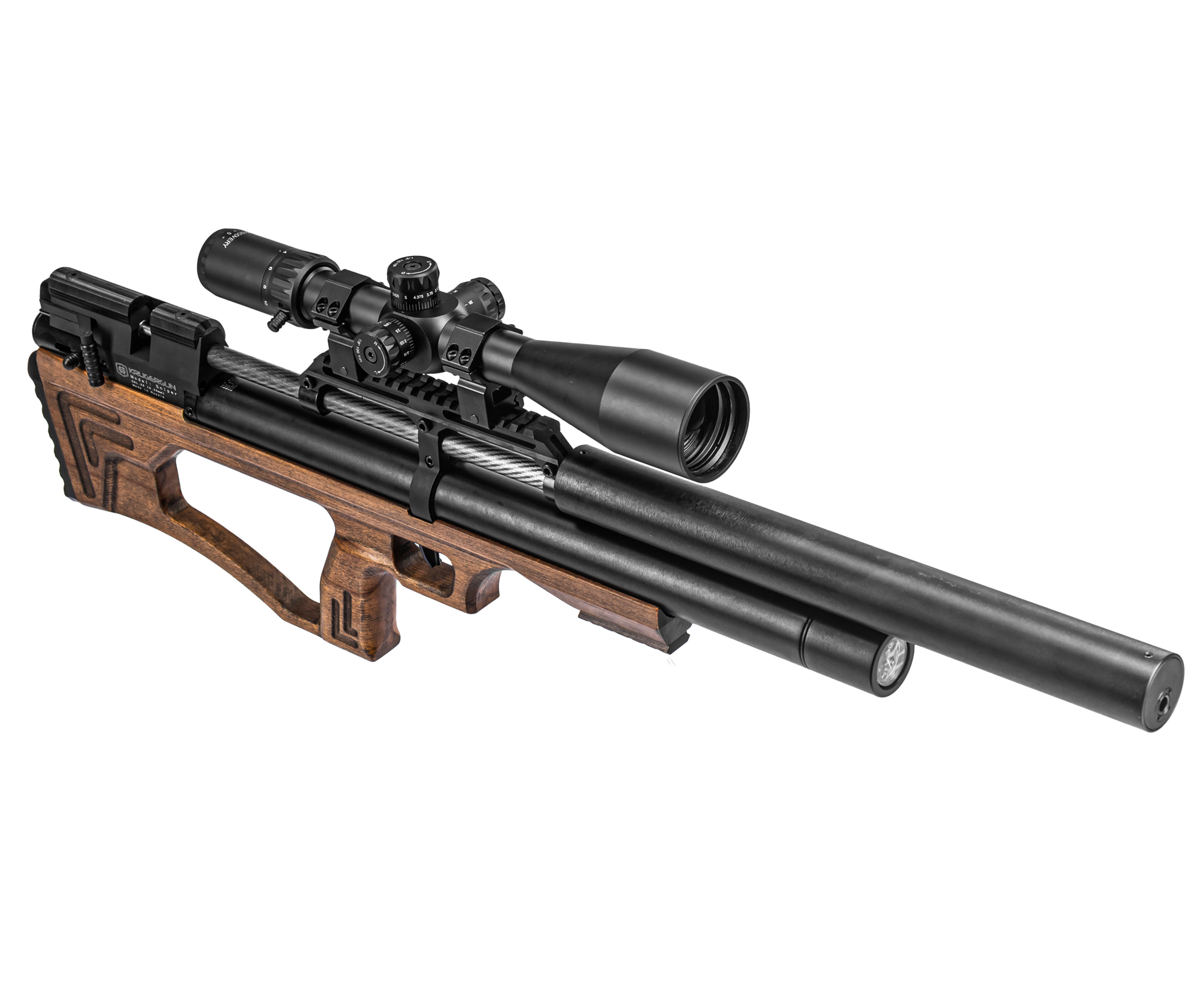 Производством пневматического оружия для гражданского рынка занимается множество зарубежных, а также отечественных брендов, представляющих богатую коллекцию пистолетов и винтовок под любые задачи. К перечню именитых компаний из России относится фирма KrugerGun, которая заработала репутацию производителя мощных и высокоточных образцов PCP «воздушек». Ассортимент продукции изготовителя пополнился новой линейкой длинноствольной пневматики Снайпер в исполнении Bull-Pup.
