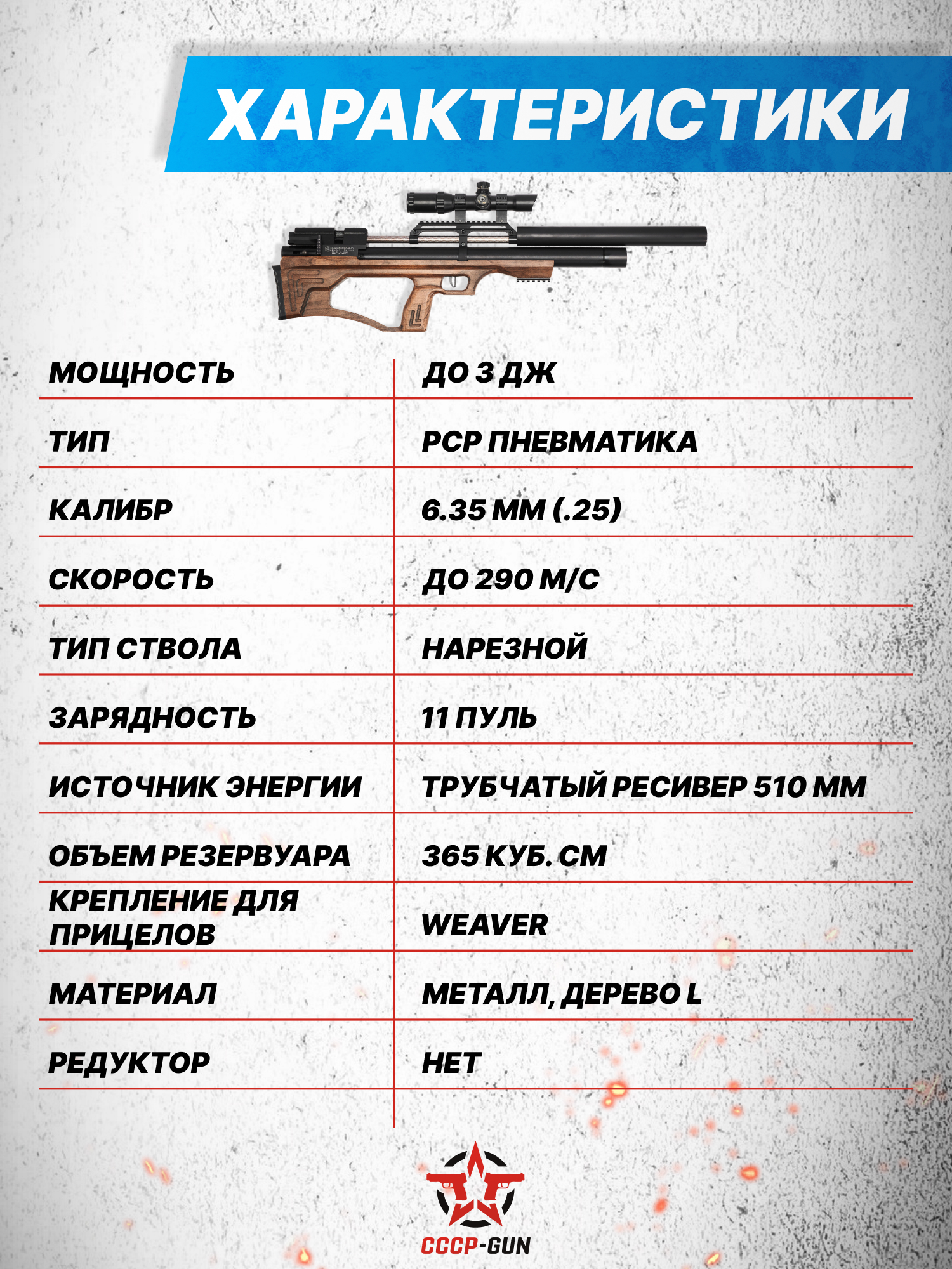 Внимание! Данная модель поставляется в разрешенной мощности для свободного приобретения на территории Российской Федерации. При этом в модели имеется возможность увеличения мощности путем замены части деталей или настройки конструкции, однако не стоит забывать о Федеральном законе «Об оружии» № 150 - ФЗ. В случае необходимости, опираясь на данный закон и руководствуясь им, возможно, потребуется получить разрешение от ЛЛР ГУ МВД России после вмешательства в конструкцию.