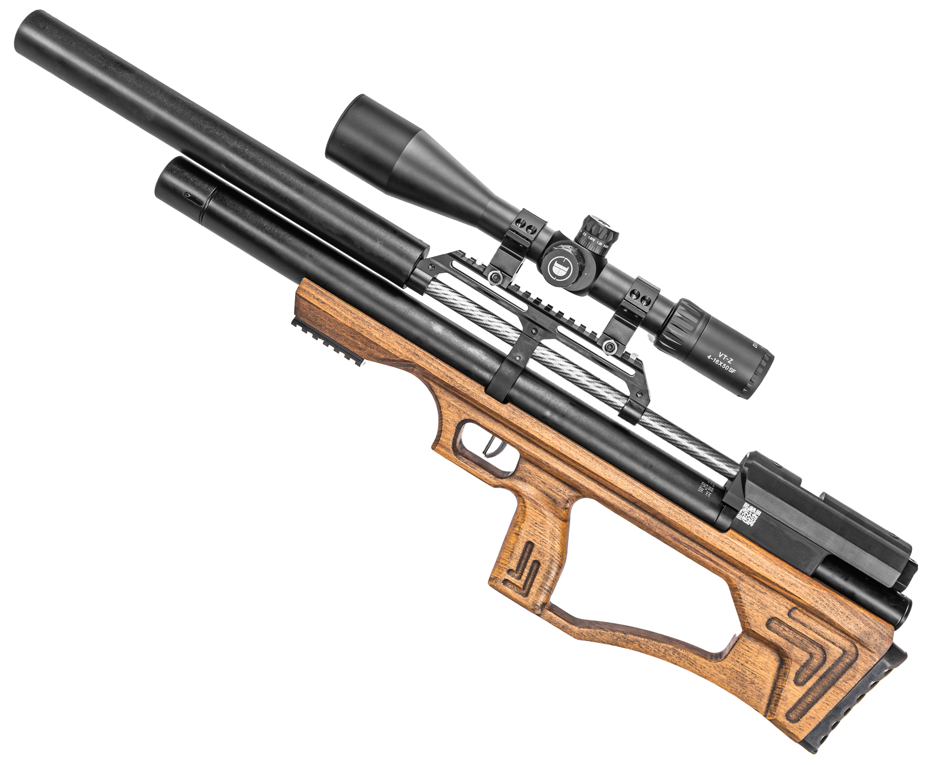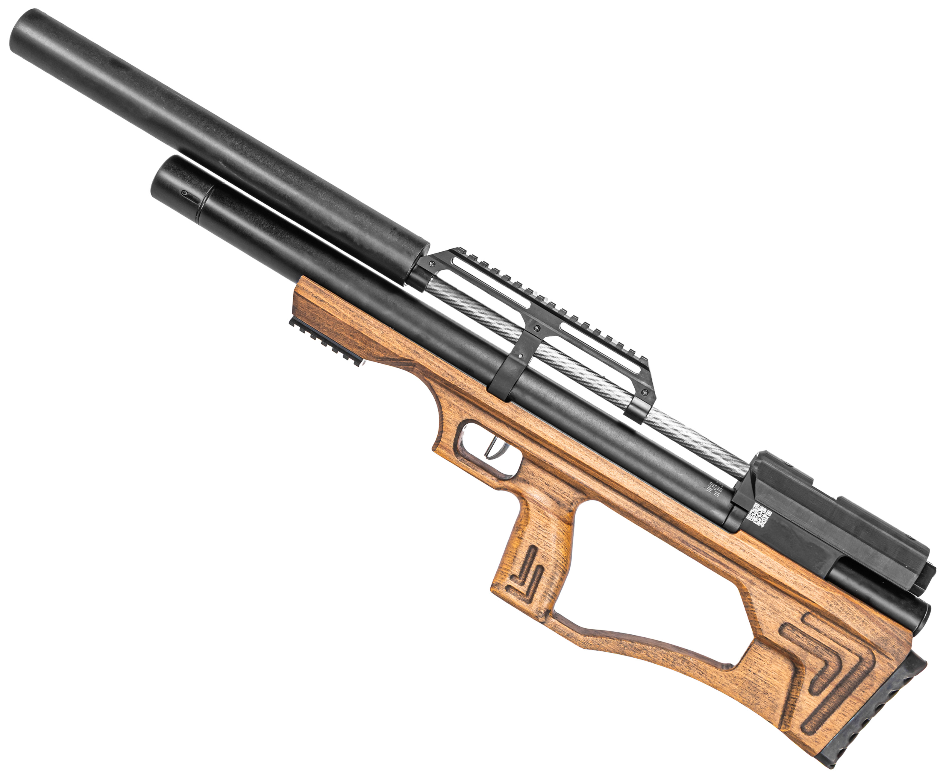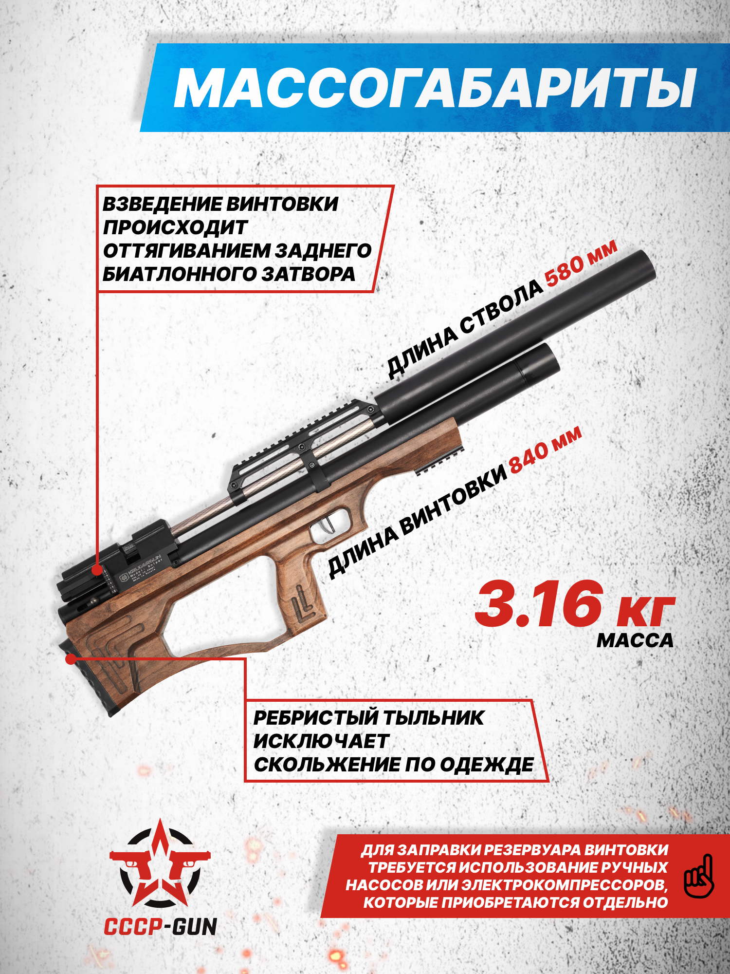 В упомянутую категорию входит рассматриваемая винтовка, габарит бланка которой составляет 580 миллиметров, при этом конструкторам компании удалось сократить длину изделия до 840 миллиметров. Указанная особенность достигается за счет обращения производителя к компоновке конструкции изделия в форм-факторе Булл-Пап, при которой ствольная группа переносится ближе к стрелку на приклад пневматики.