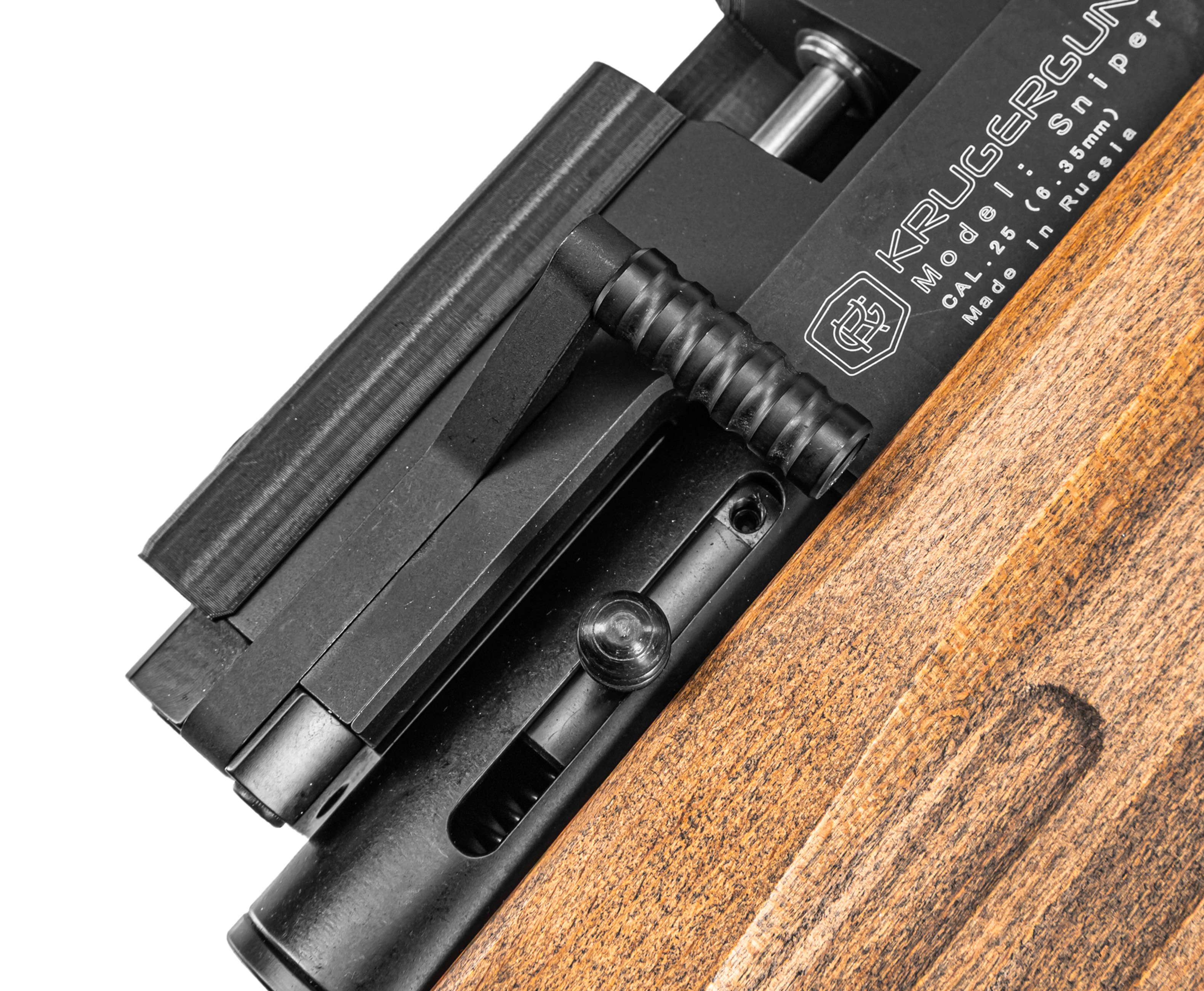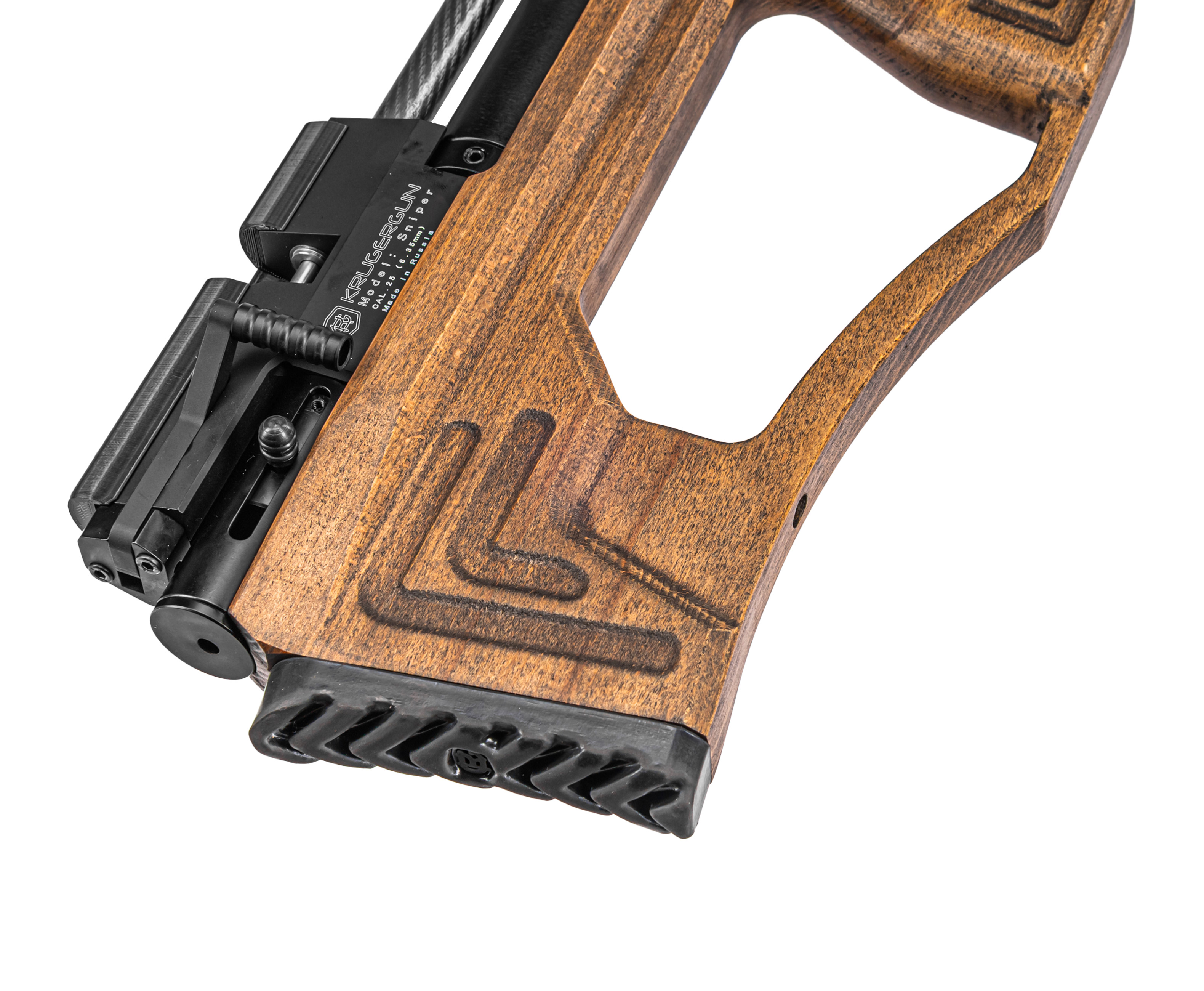 Отдельно требуется отметить, что ложа для KrugerGun Снайпер БуллПап изготавливается из дерева, за счет чего внешний вид винтовки выделяется своей эстетикой, сочетающей гладкие переливы фрезеровки и повышенную эргономику конструкции. На общий уровень удобства обращения с пневматикой положительно влияет наличие ухватистой пистолетной рукояти, а также облегченного приклада с прорезиненным затыльником.