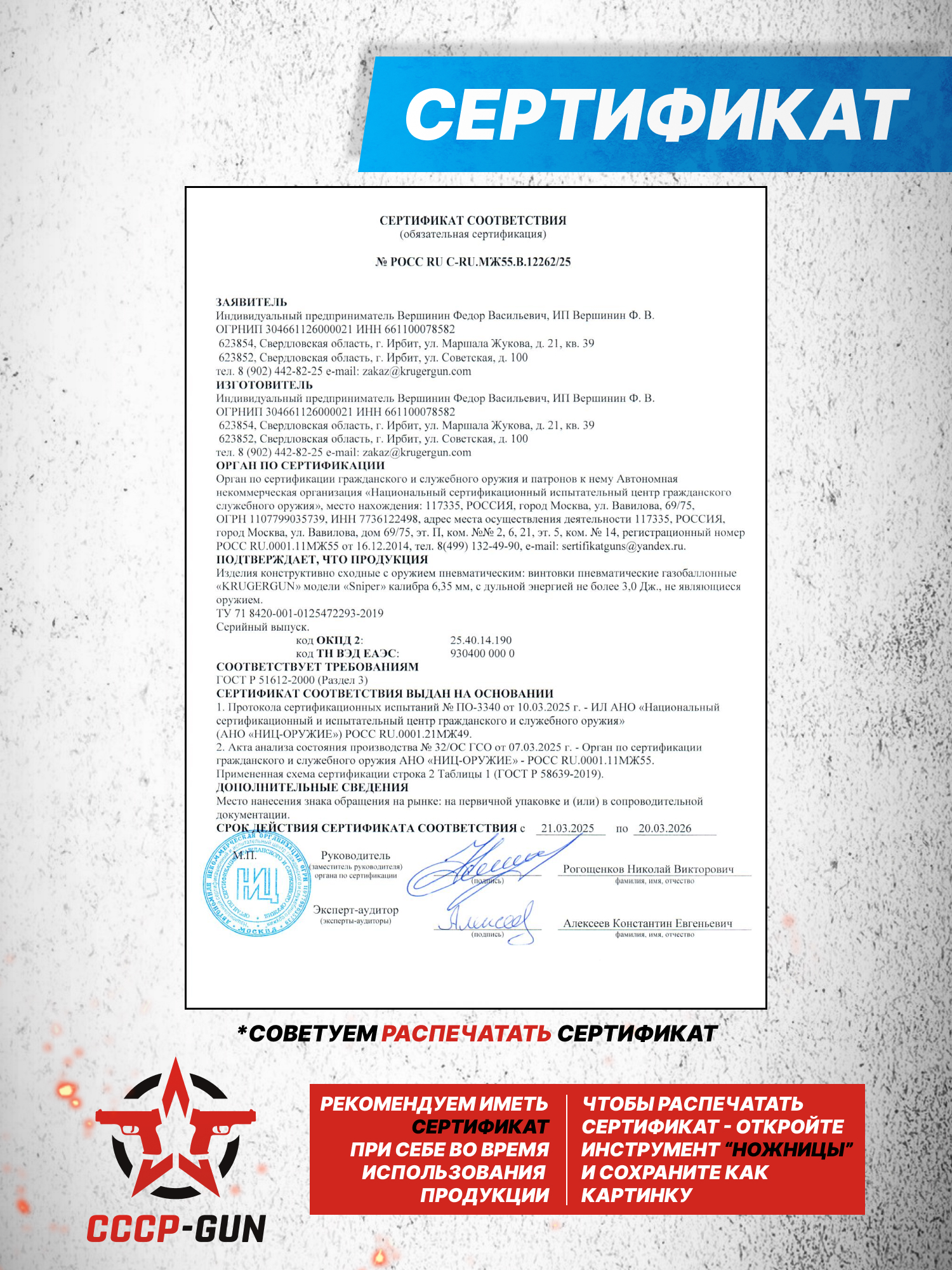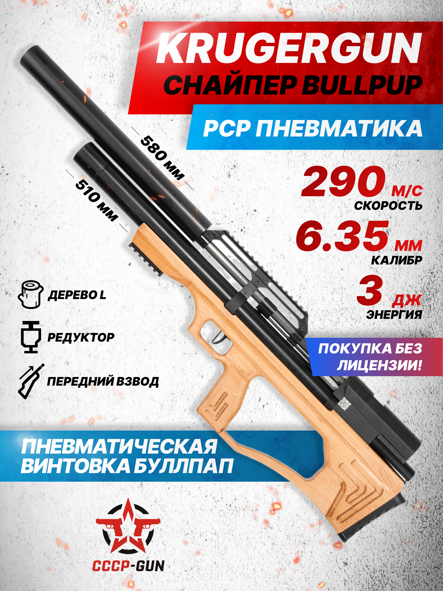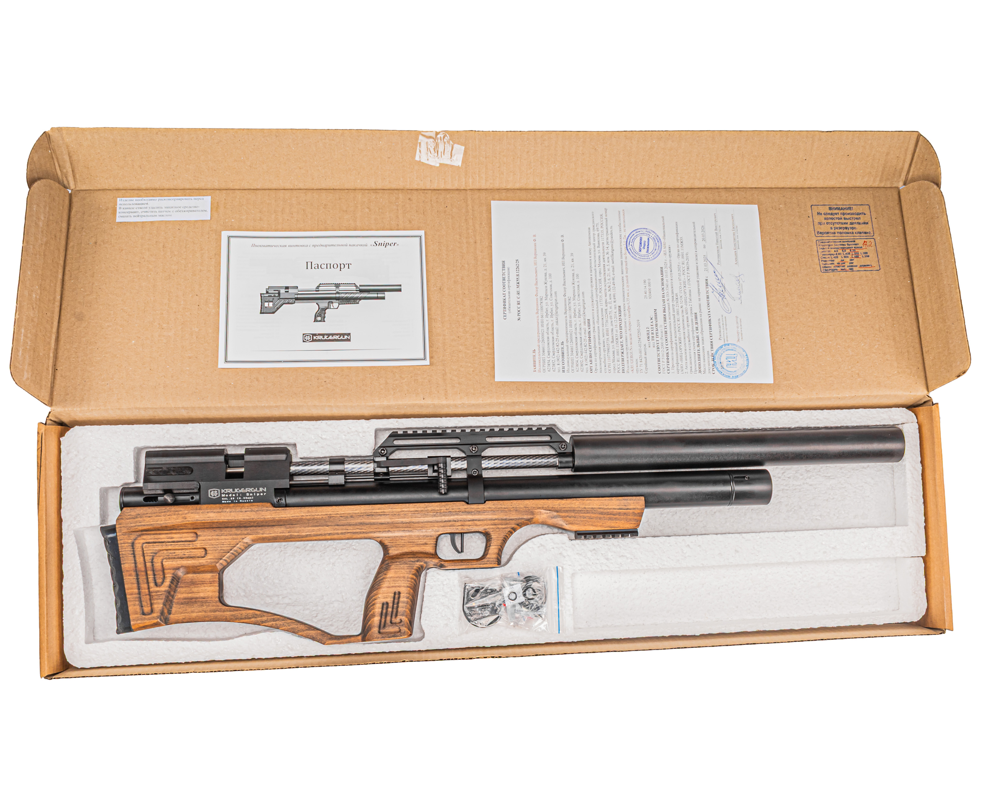 Купить РСР Крюгера Снайпер может каждый стрелок без оформления специализированных лицензий и разрешений, так как мощность воздушки ограничена изготовителем до предела 3 Дж, что сделано для соблюдения действующих в России законов о пневматическом оружии. Винтовки KrugerGun Снайпер 6.35 мм буллпап, которые поступают в руки стрелков США и Европы таких ограничений не имеют и мощность выстрела из воздушки дает разогнать свинцовый снаряд до 290 м/с.