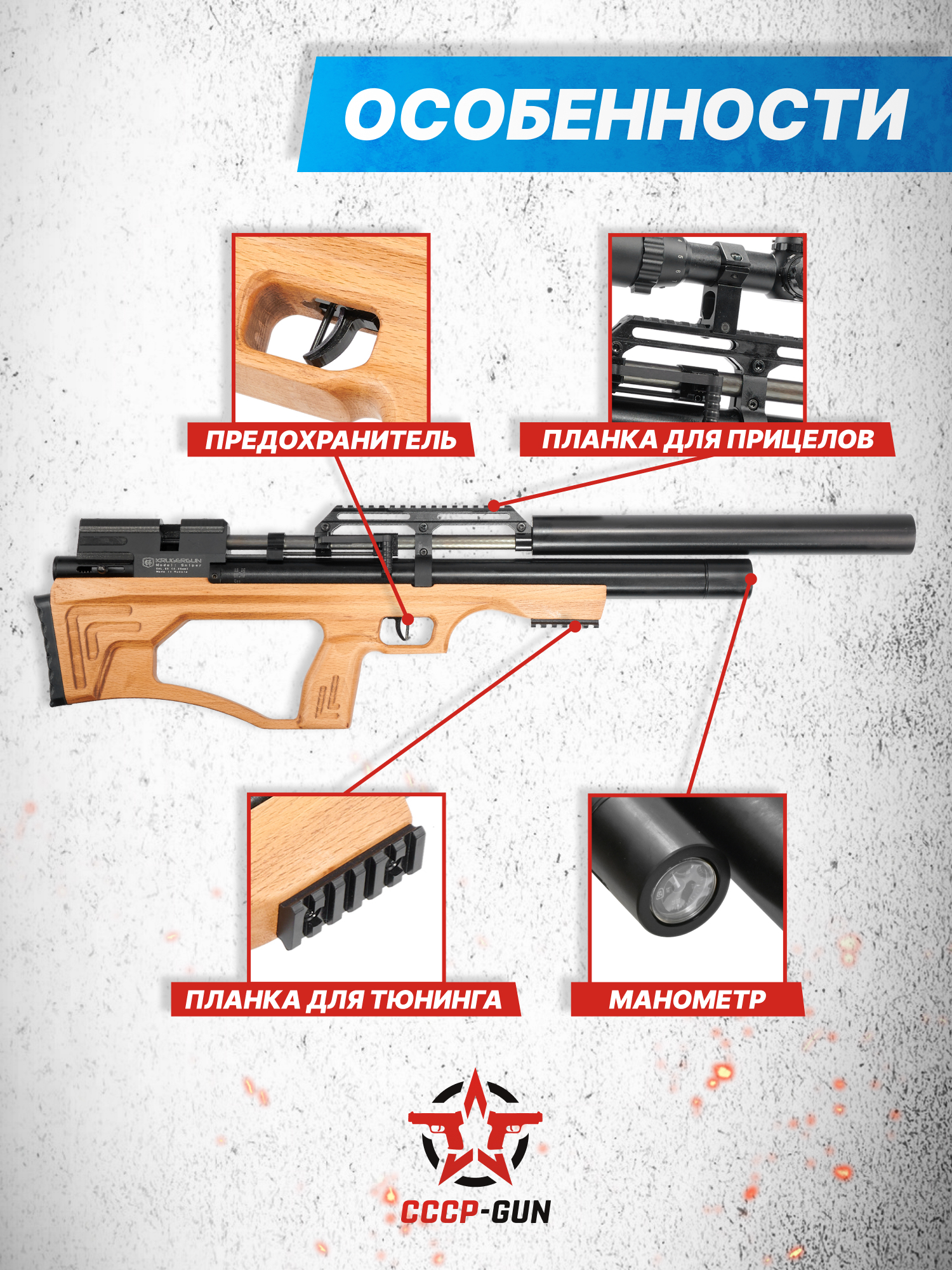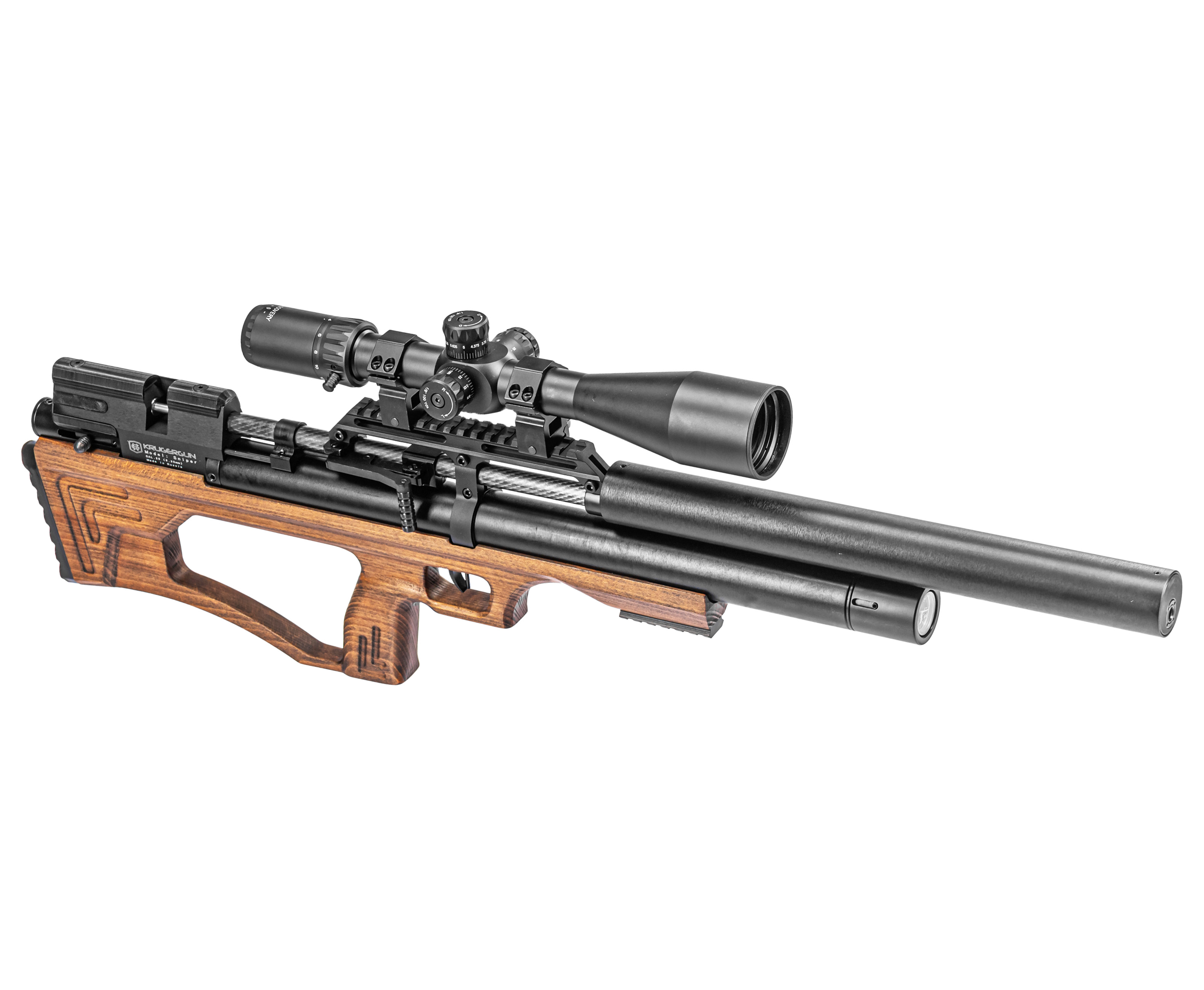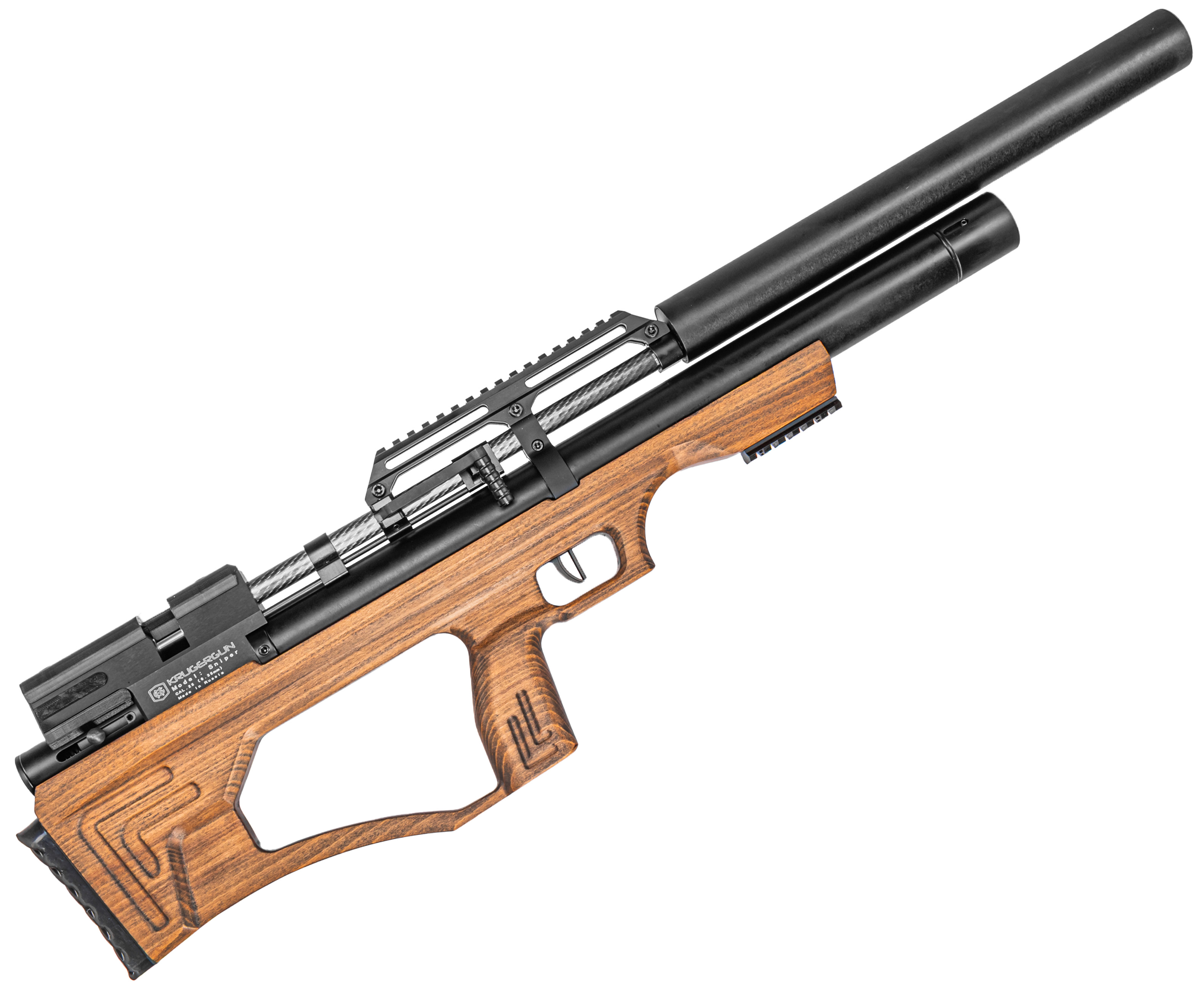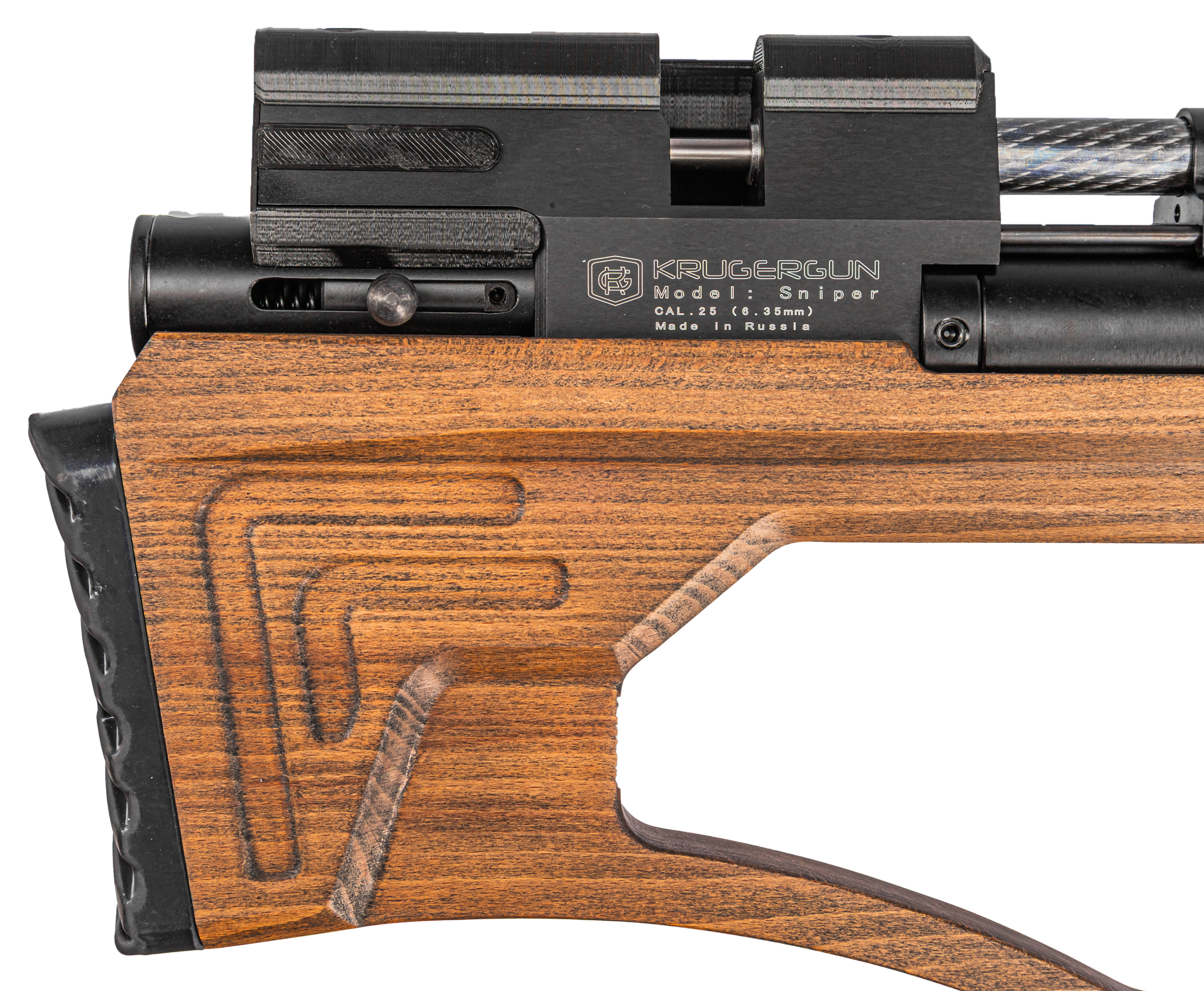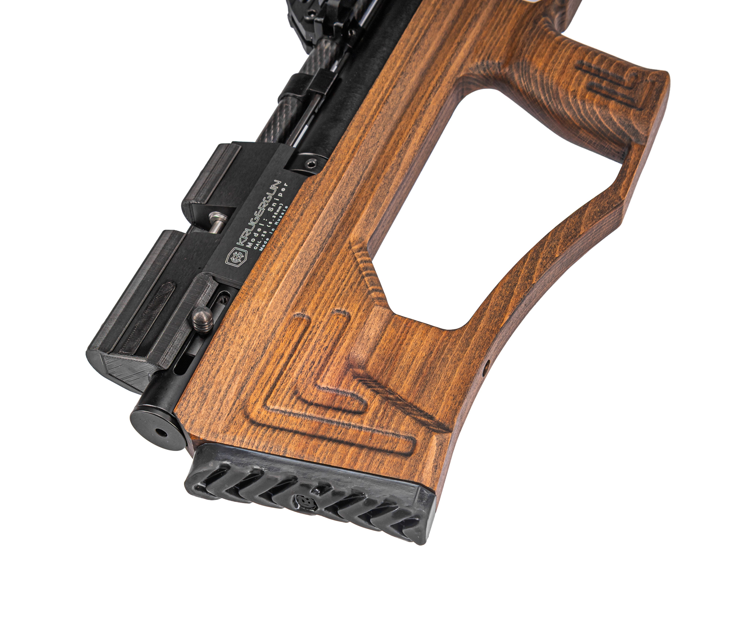 Расширяя серию своей пневматики, компания представила обновленную версию винтовки KrugerGun 6.35 Sniper, которая преобразилась за счет использования новой версии деревянного ложа. Древесина для резного ложа обрабатывается пропиткой, придающей изделию ореховый цвет.