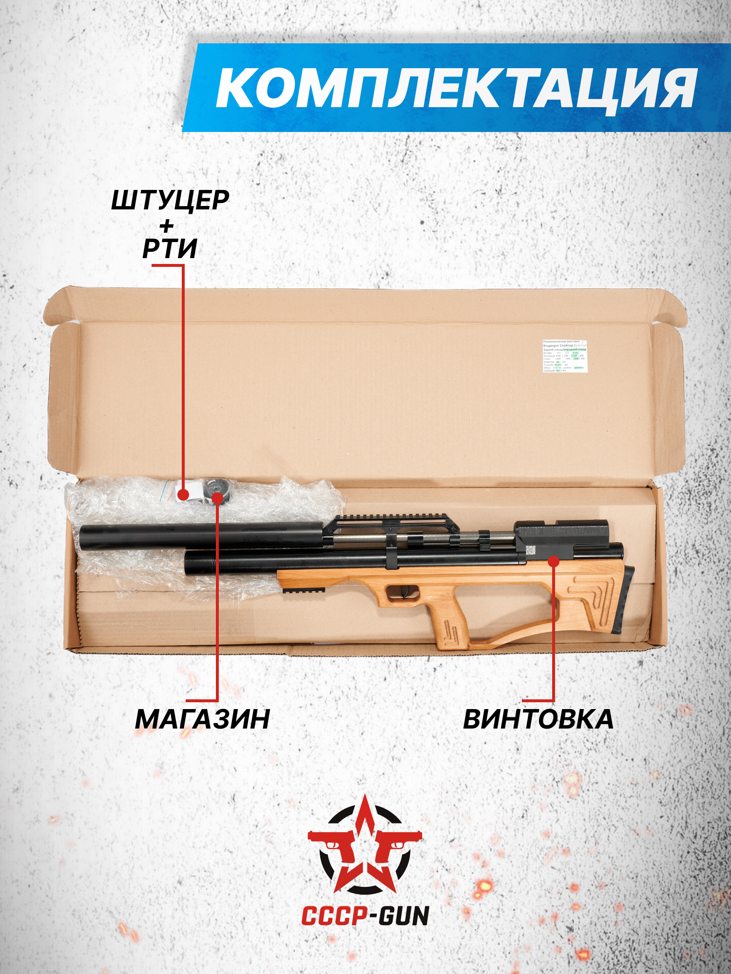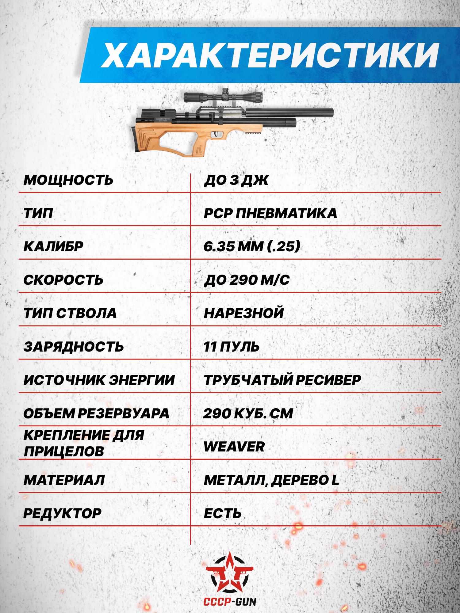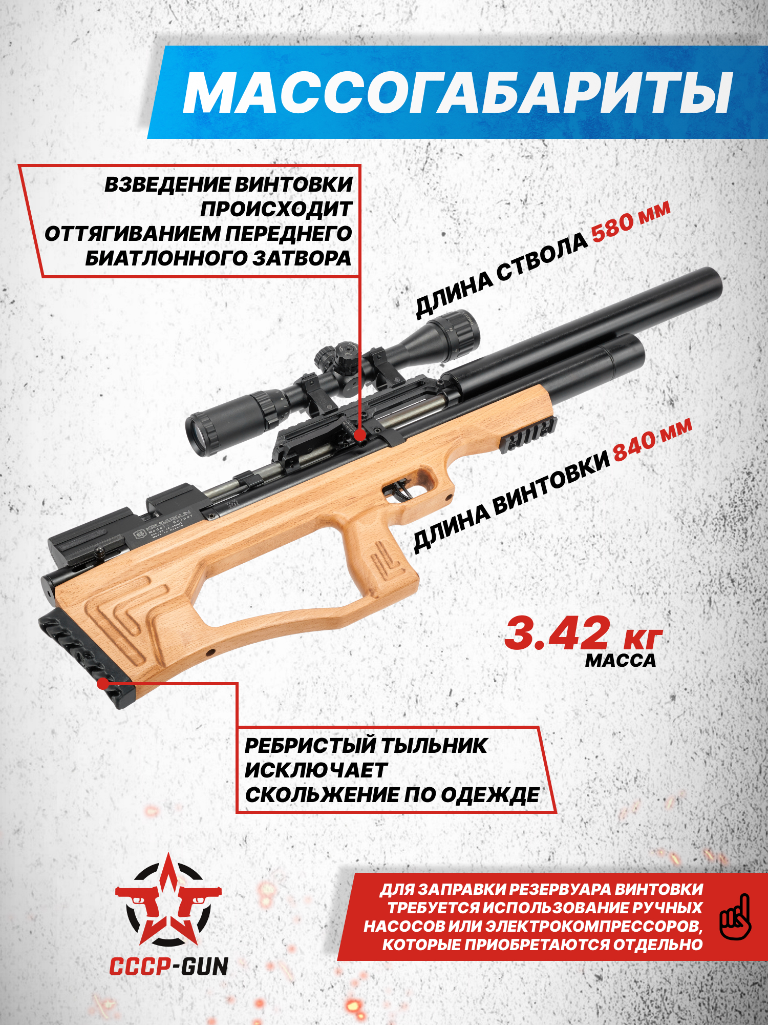 Внимание! Данная модель поставляется в разрешенной мощности для свободного приобретения на территории Российской Федерации. При этом в модели имеется возможность увеличения мощности путем замены части деталей или настройки конструкции, однако не стоит забывать о Федеральном законе «Об оружии» № 150 - ФЗ. В случае необходимости, опираясь на данный закон и руководствуясь им, возможно, потребуется получить разрешение от ЛЛР ГУ МВД России после вмешательства в конструкцию.