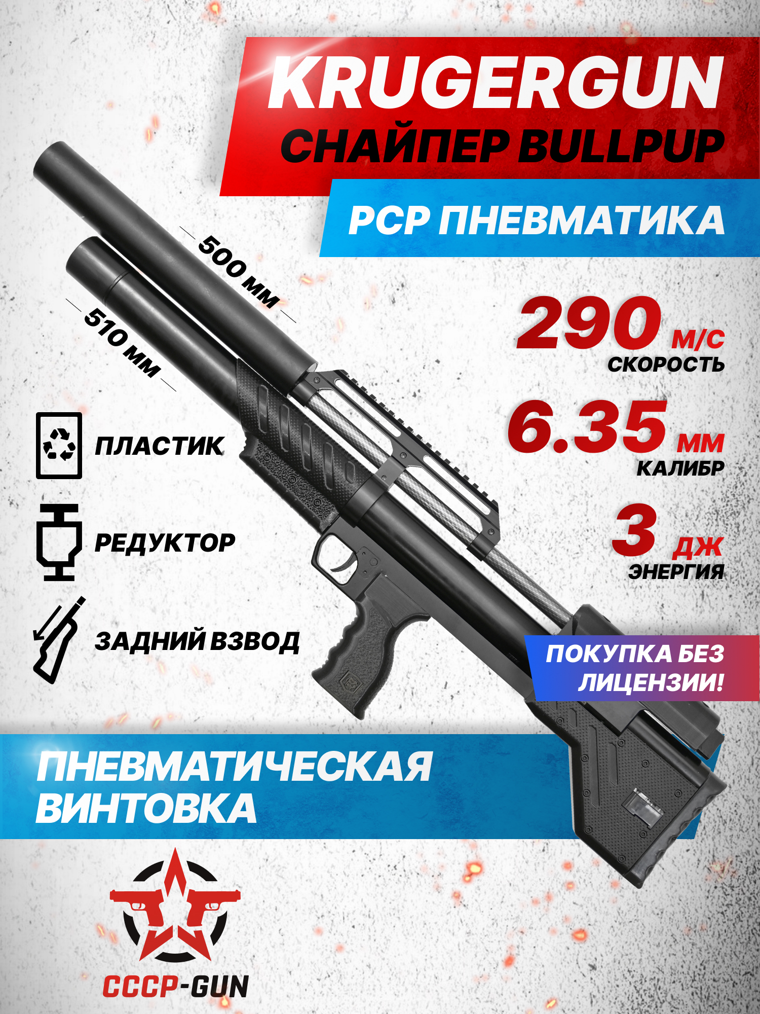 Российская компания KrugerGun выпускает пневматическое оружие, рассчитанное на пользователей, которым важны надежность, простота устройства и должная баллистика метаемых снарядов. Модель Снайпер BullPup 6.35 мм представляет собой PCP-комплекс с редукторной схемой и буллпап-компоновкой. Винтовка подходит как для тира, так и для практики на открытом воздухе.