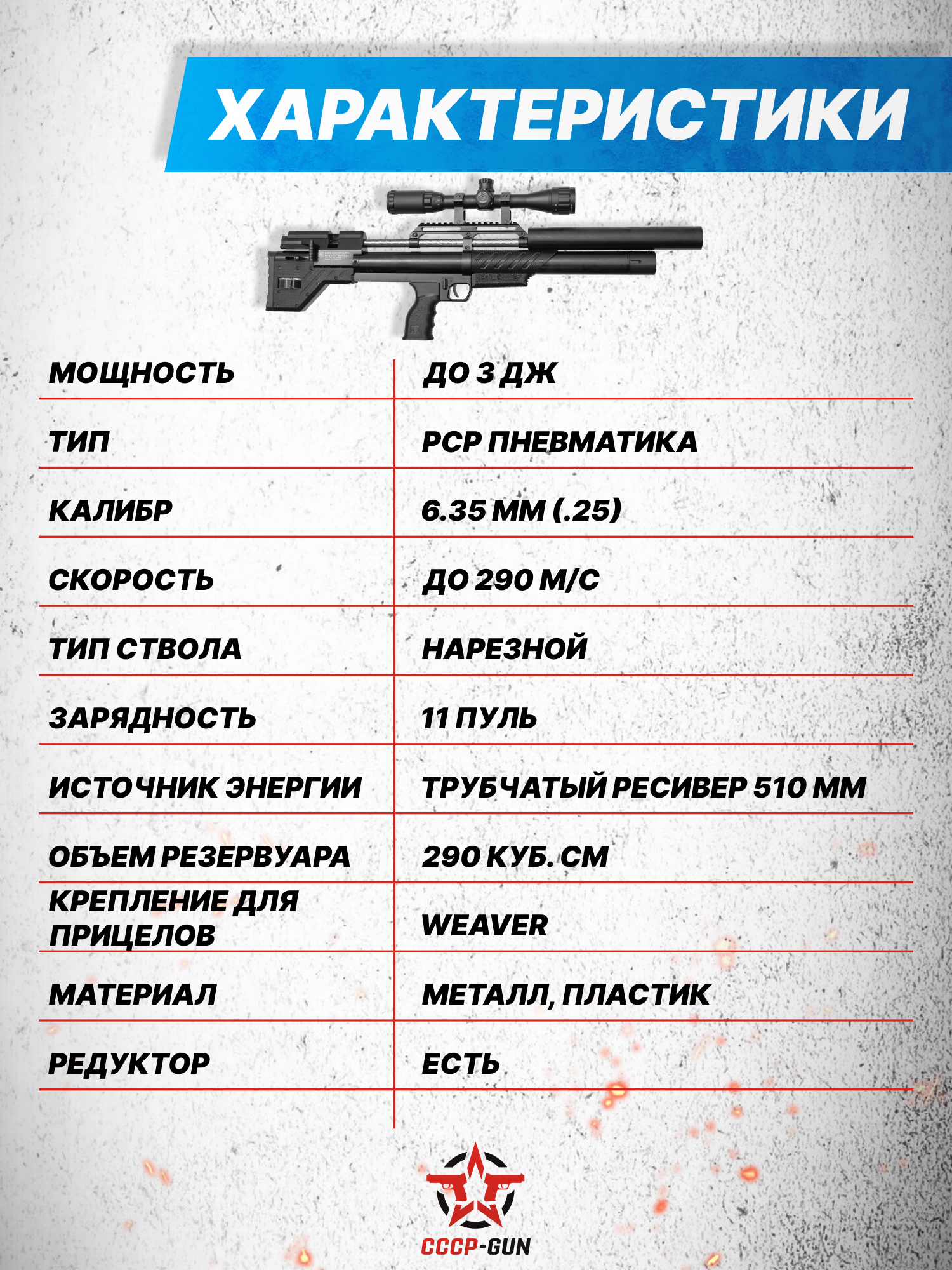 В базовой конфигурации модель сертифицирована под мощность до 3 Джоулей, что упрощает приобретение и хранение. При соответствующей настройке изделие позволяет разгонять пулю до 290 метров в секунду. Эта скорость обеспечивает стабильность траектории и пробивную способность, необходимую при стрельбе на средних дистанциях.