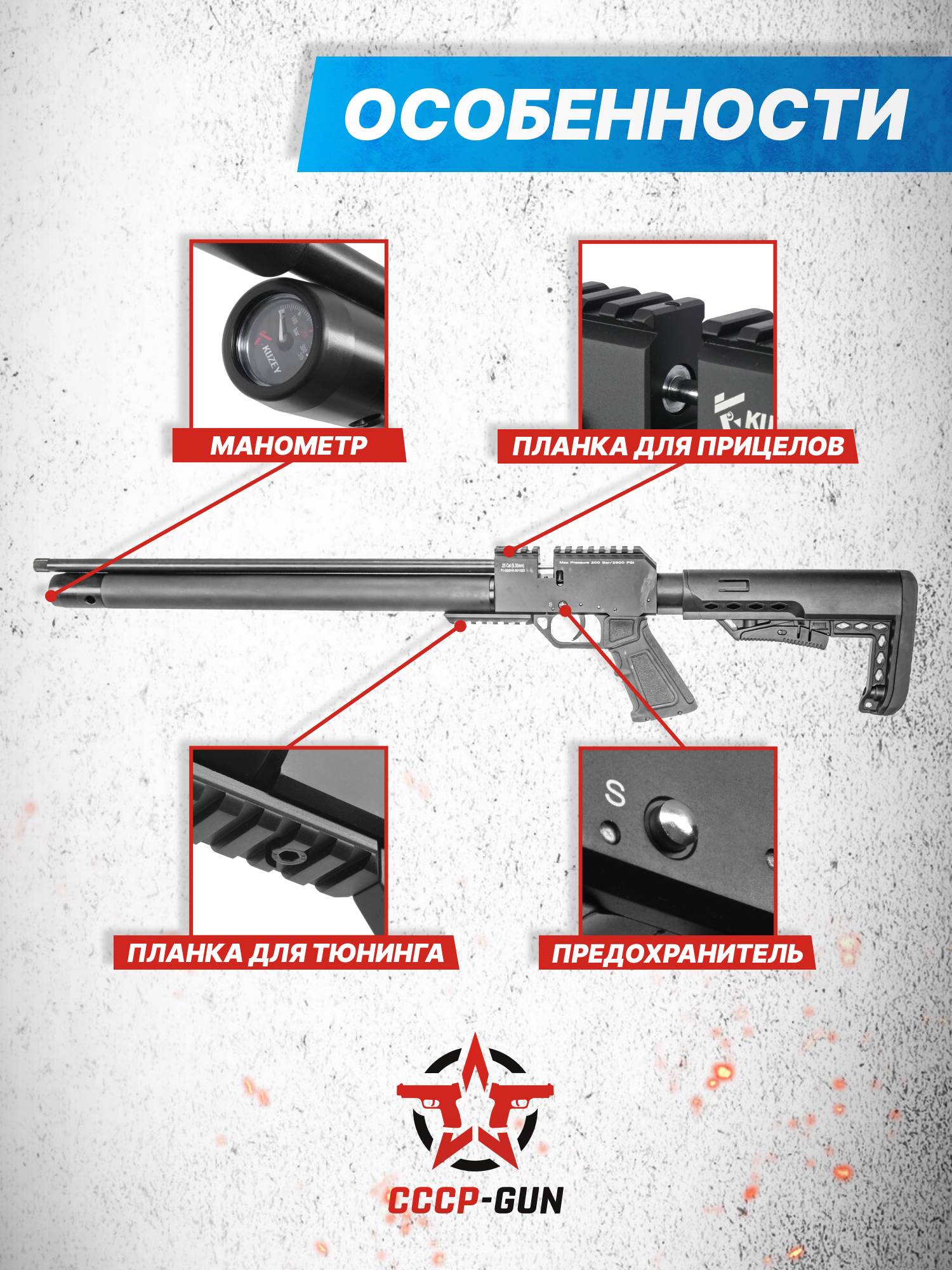 С целью достижения точного попадания в цель рекомендуется дополнительно приобрести оптический прицел - для его крепления в верхней секции винтовка пневматическая Kuzey предусматривает рельсовую направляющую стандарта Вивер 22 мм. Аналогичная планка находится в нижней части перед спусковой скобой - эта платформа служит для установки дополнительного тактического оборудования, например сошек или ЛЦУ.