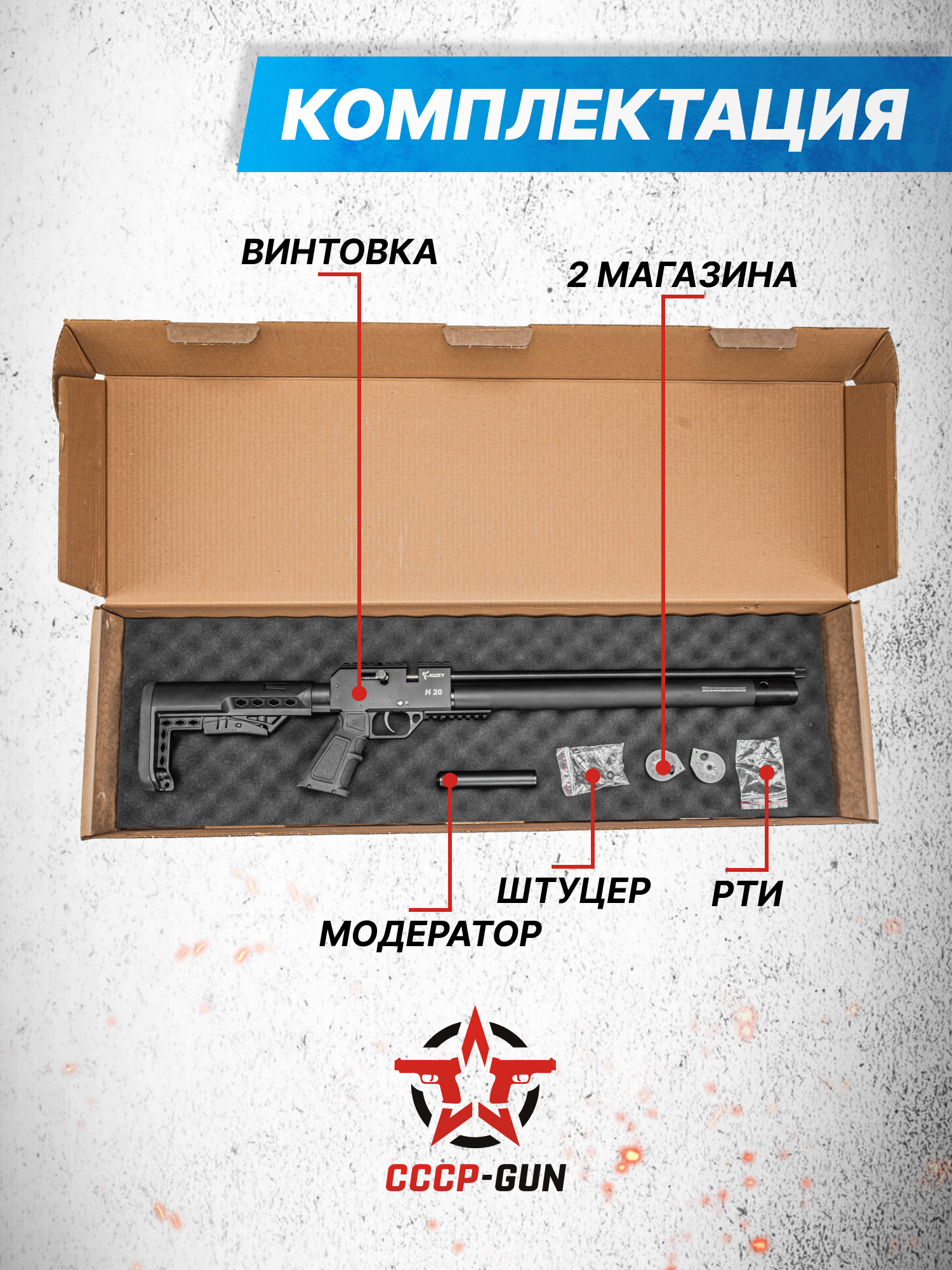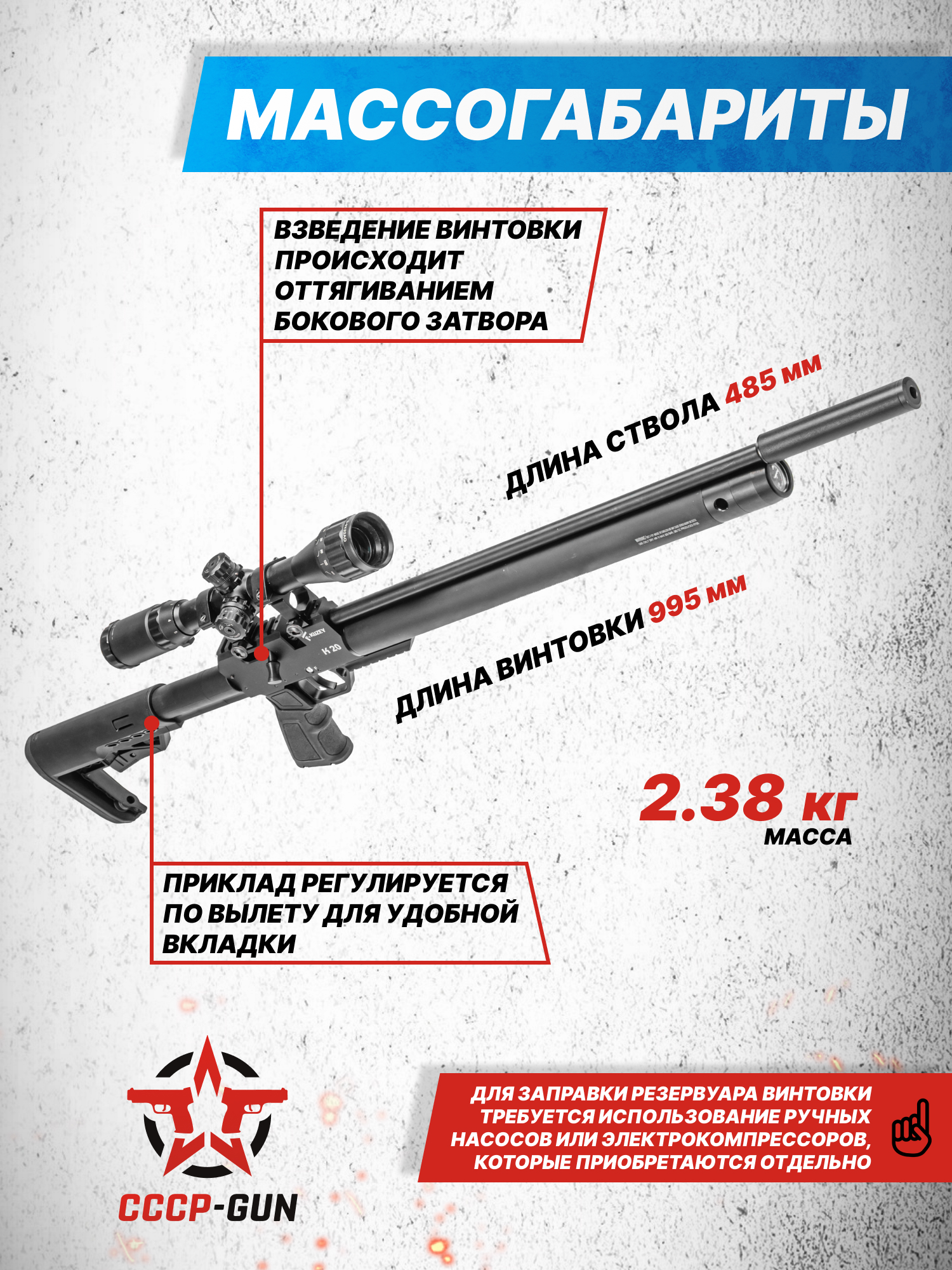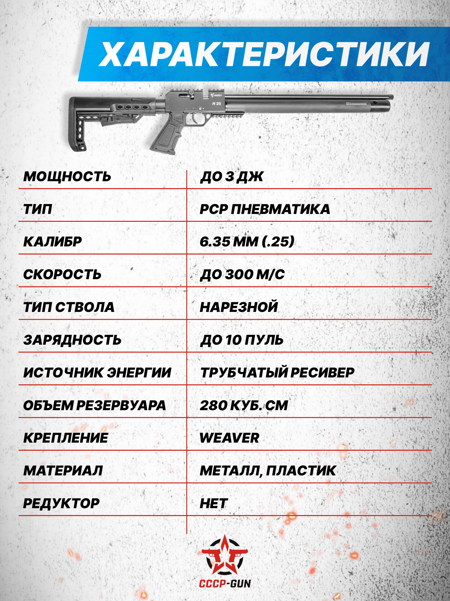 Внимание! Данная модель поставляется в разрешенной мощности для свободного приобретения на территории Российской Федерации. При этом в модели имеется возможность увеличения мощности путем замены части деталей или настройки конструкции, однако не стоит забывать о Федеральном законе «Об оружии» № 150 - ФЗ. В случае необходимости, опираясь на данный закон и руководствуясь им, возможно, потребуется получить разрешение от ЛЛР ГУ МВД России после вмешательства в конструкцию.