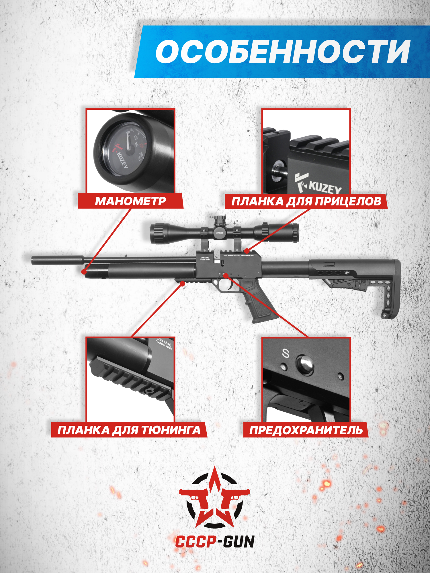 Кузей пневматическая винтовка рассчитана на эксплуатационное давление в пределах до 200 Бар и работает по прямой схеме подачи воздуха. Для заполнения резервуара потребуется насосное оборудование высокого давления ручного или электрического принципа действия, которое докупается самостоятельно. Уровень наполнения баллона возможно контролировать по наглядной шкале встроенного измерительного прибора в виде стрелочного манометра.