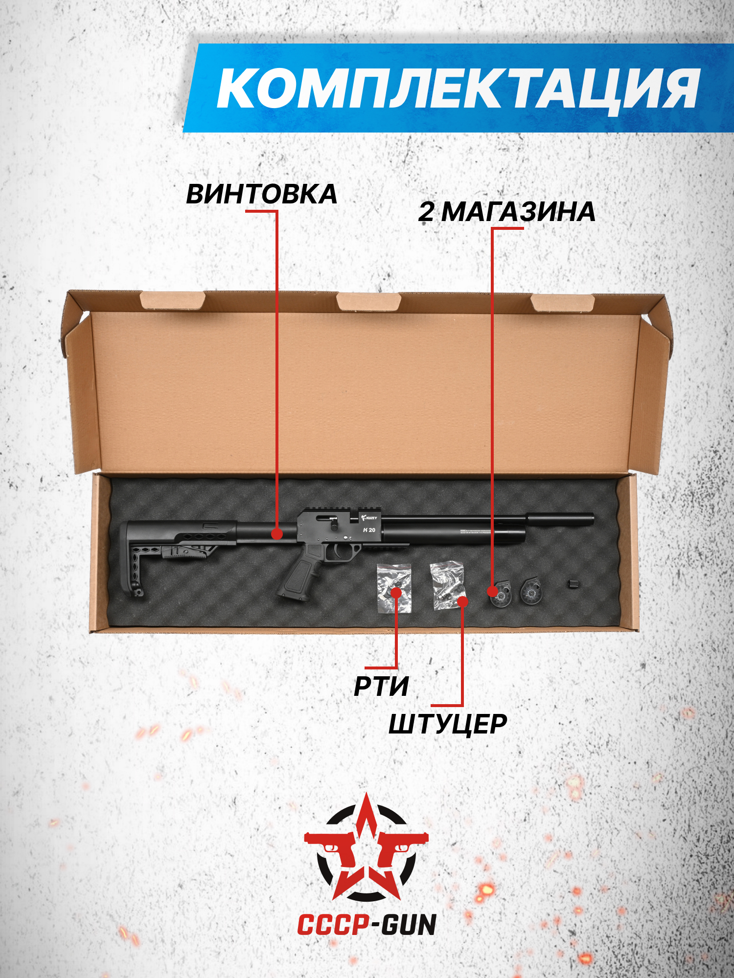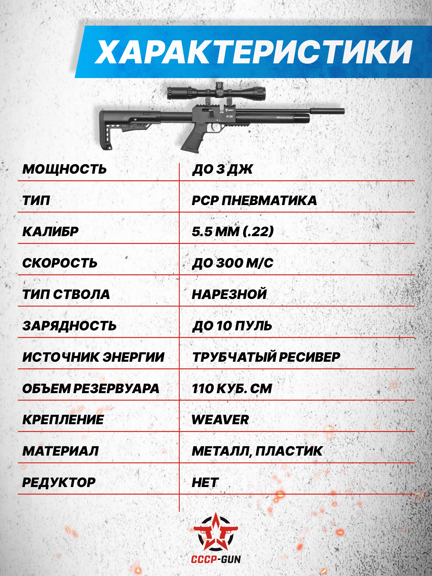 Внимание! Данная модель поставляется в разрешенной мощности для свободного приобретения на территории Российской Федерации. При этом в модели имеется возможность увеличения мощности путем замены части деталей или настройки конструкции, однако не стоит забывать о Федеральном законе «Об оружии» № 150 - ФЗ. В случае необходимости, опираясь на данный закон и руководствуясь им, возможно, потребуется получить разрешение от ЛЛР ГУ МВД России после вмешательства в конструкцию.