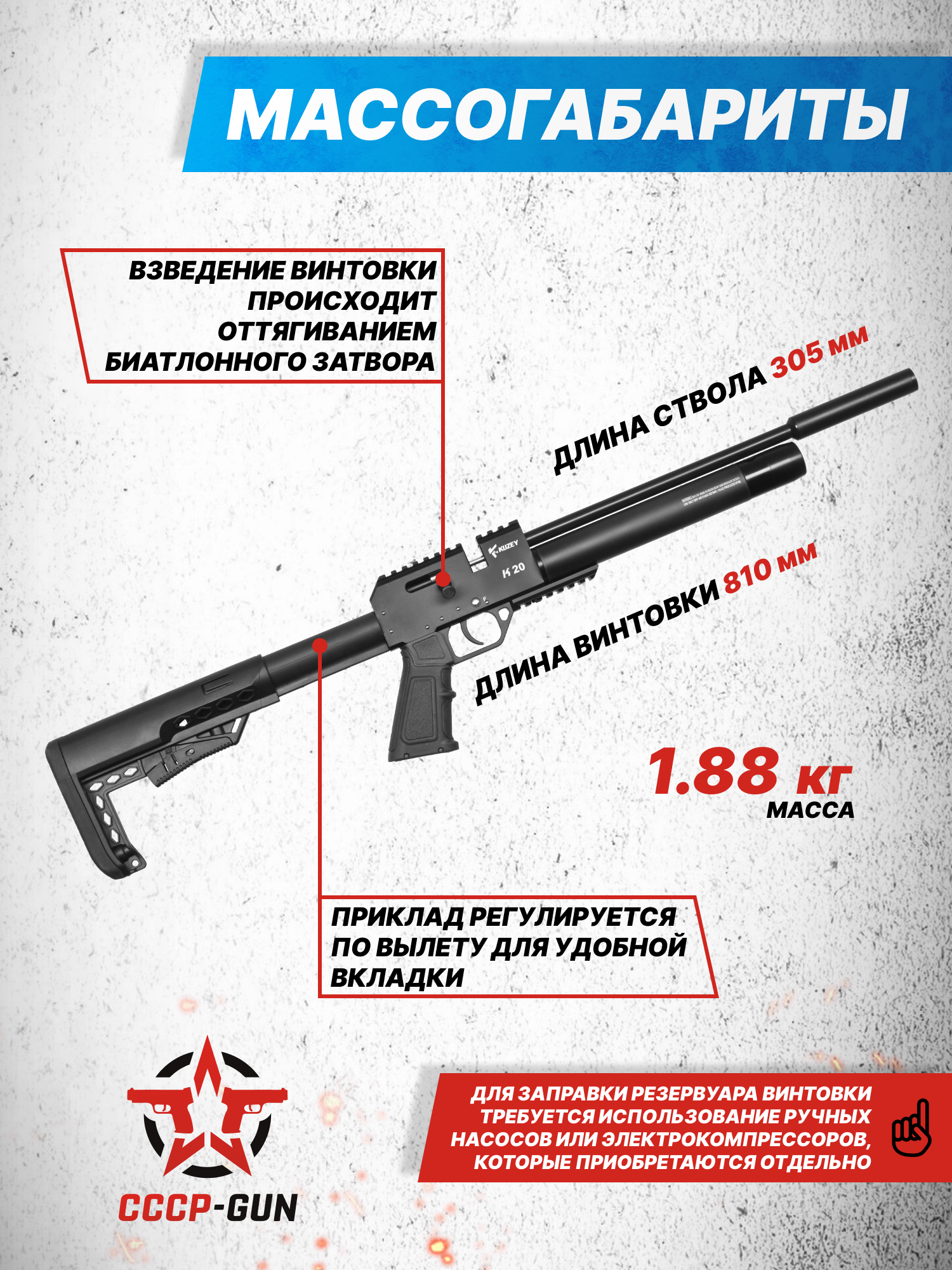 Благодаря малым размерам и весу 1.88 кг образец демонстрирует хорошую балансировку и легко транспортируется до места стрельбы, практически не утомляя владельца. Поскольку конкретная модификация относится к классу с предварительной накачкой, перед началом применения модель требуется заблаговременно наполнить сжатым воздухом - последний закачивается в цилиндрический резервуар вместимостью до 110 куб. см.