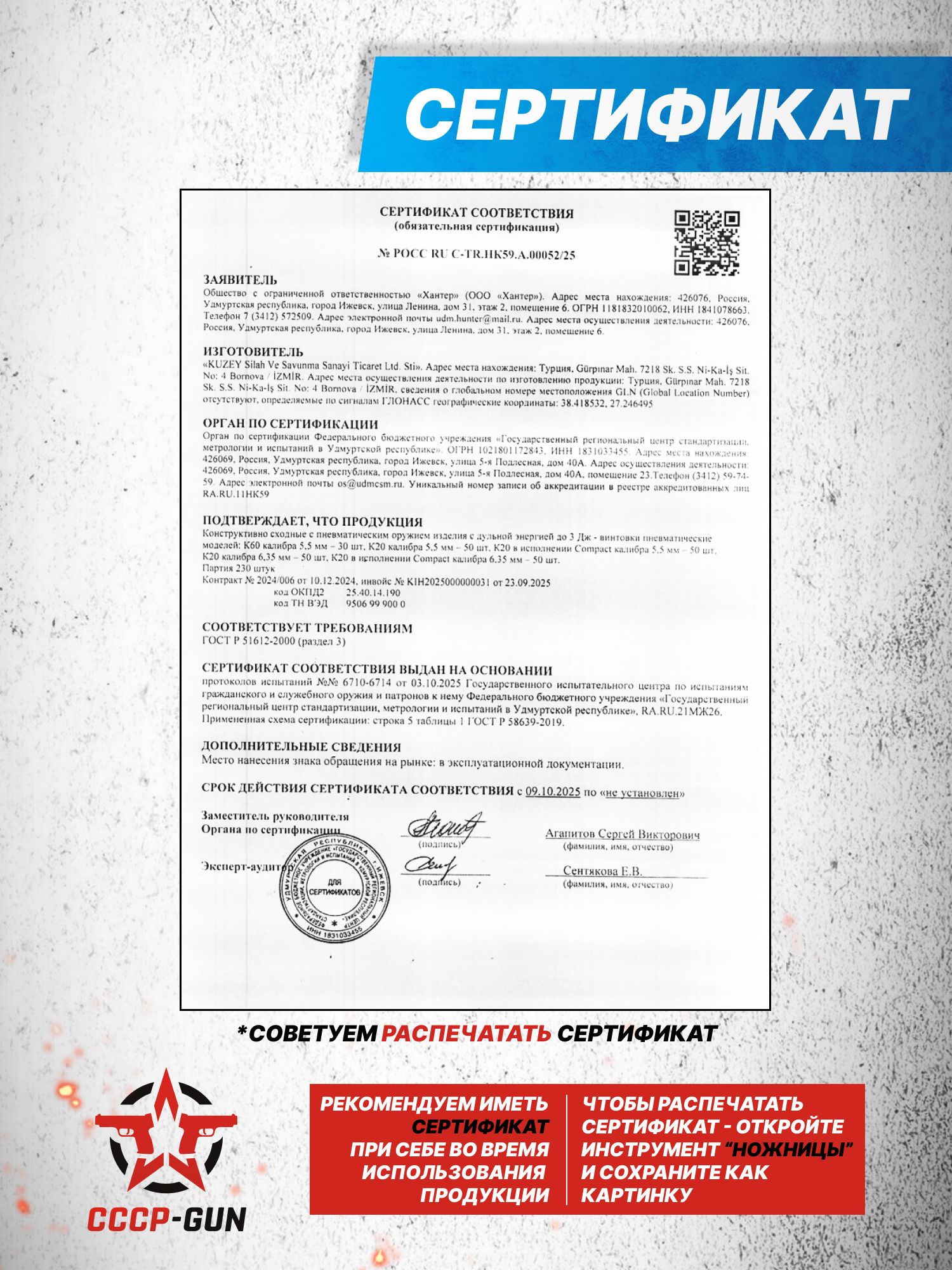 Внимание! Данная модель поставляется в разрешенной мощности для свободного приобретения на территории Российской Федерации. При этом в модели имеется возможность увеличения мощности путем замены части деталей или настройки конструкции, однако не стоит забывать о Федеральном законе «Об оружии» № 150 - ФЗ. В случае необходимости, опираясь на данный закон и руководствуясь им, возможно, потребуется получить разрешение от ЛЛР ГУ МВД России после вмешательства в конструкцию.