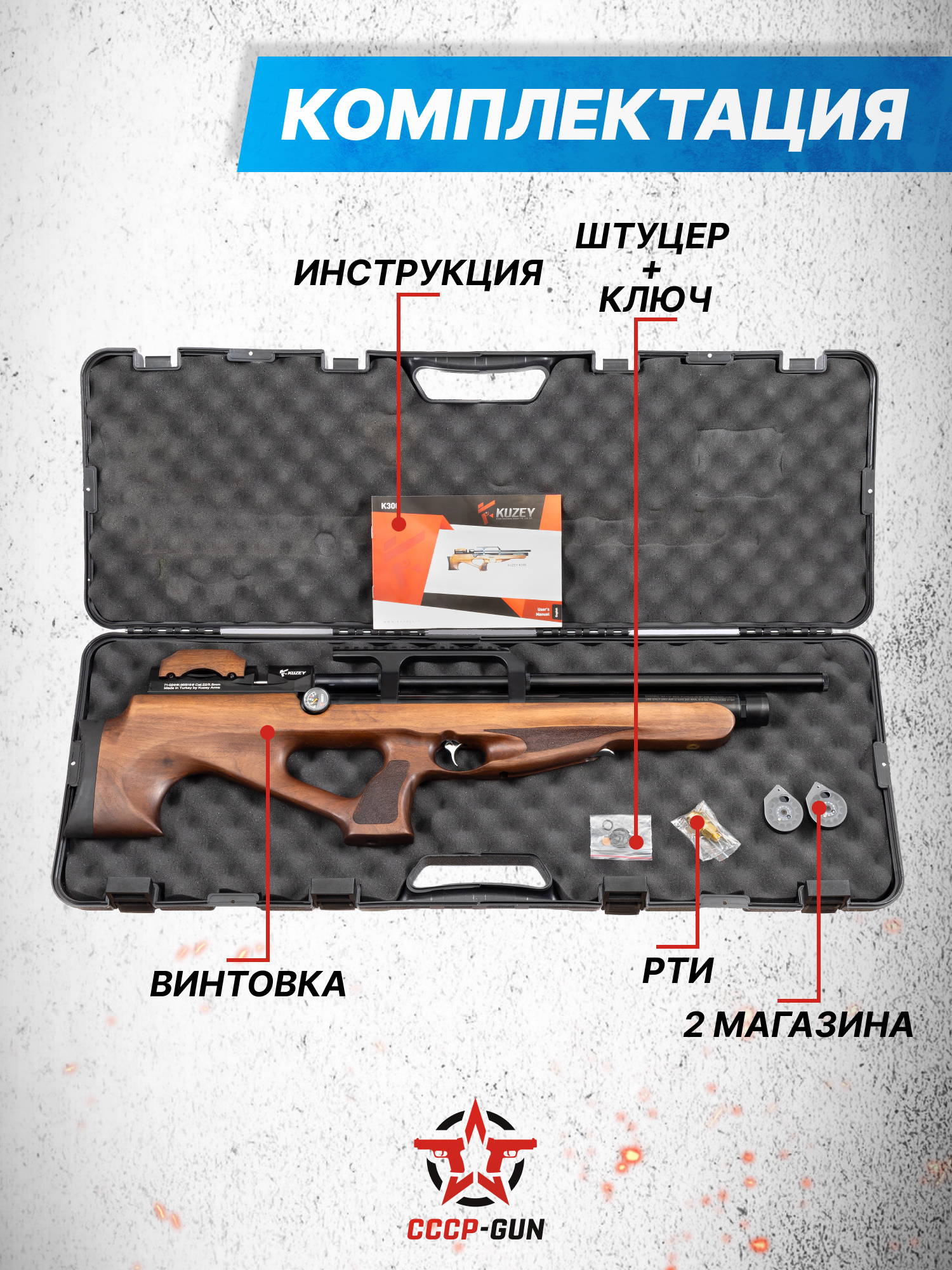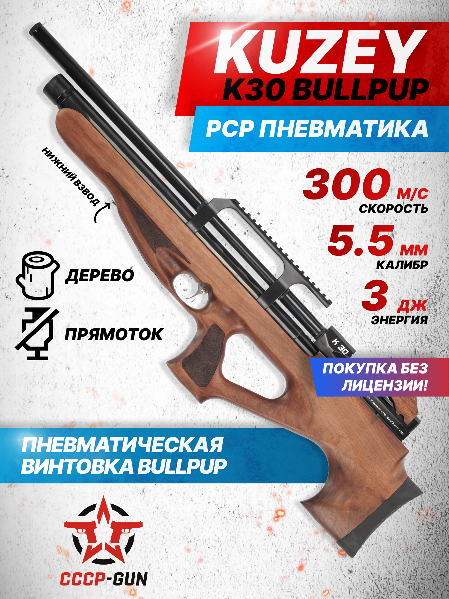 Винтовка Kuzey K30 5.5 выпускается в деревянном ложе из орешника, при этом конструкторам удалось совместить традиционный дизайн с прогрессивной компоновкой типа Bull-Pup, что позволило снизить вес модели до 3.54 кг. Габариты изделия составляют 720x48x210 мм, поэтому обозреваемая пневматика характеризуется компактными размерами, что помогает проще хранить и транспортировать ее. Для улучшения комфорта стрелка в винтовке реализованы пистолетная рукоять, ухватистое цевье, объемный подщечник и упругий противоскользящий затыльник.