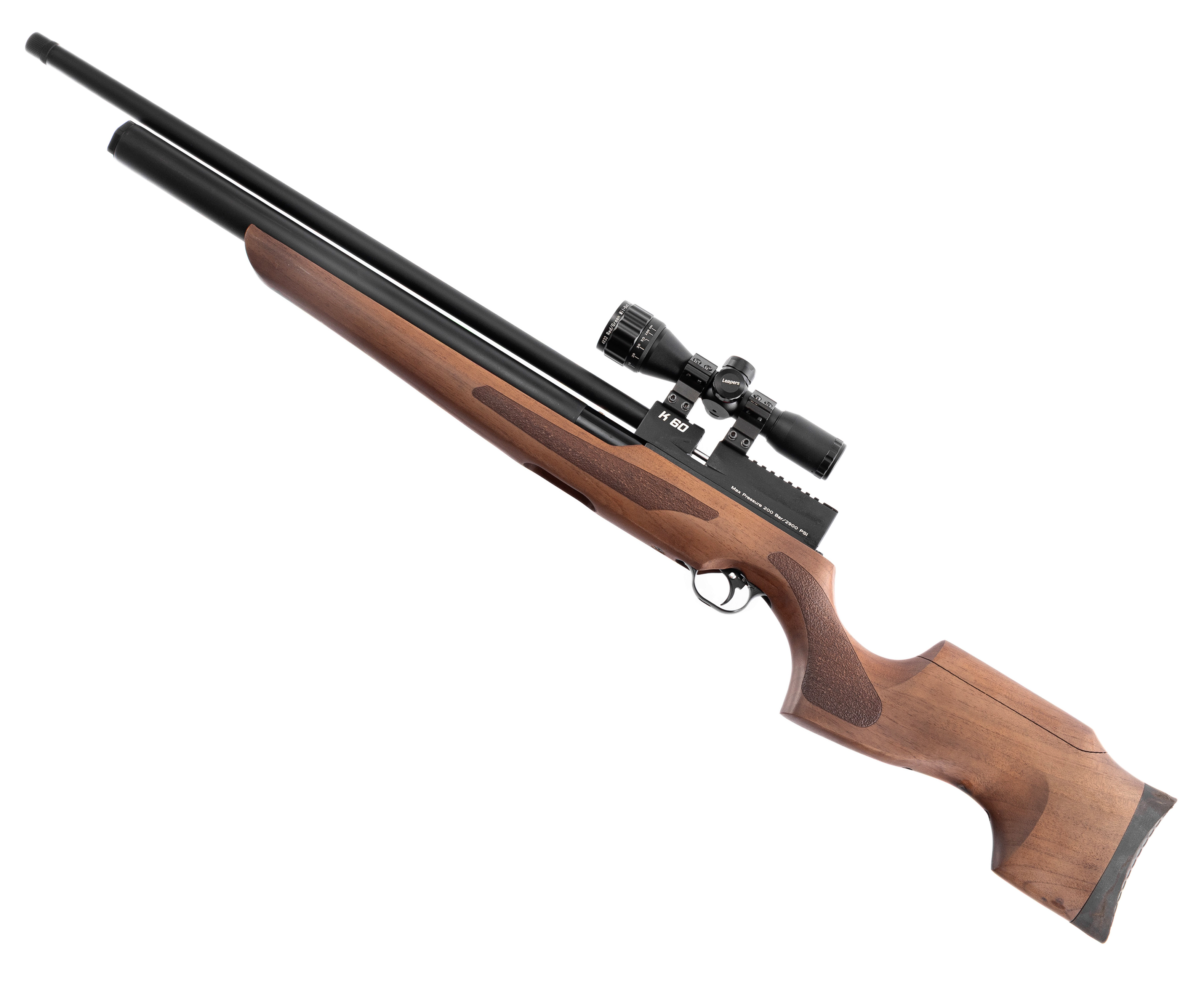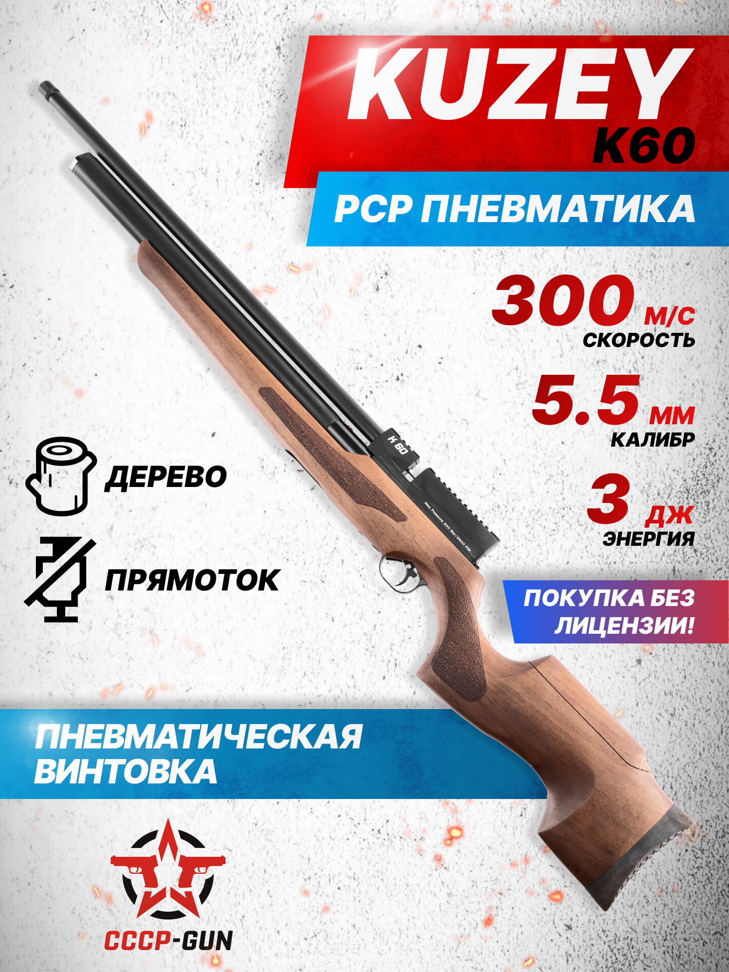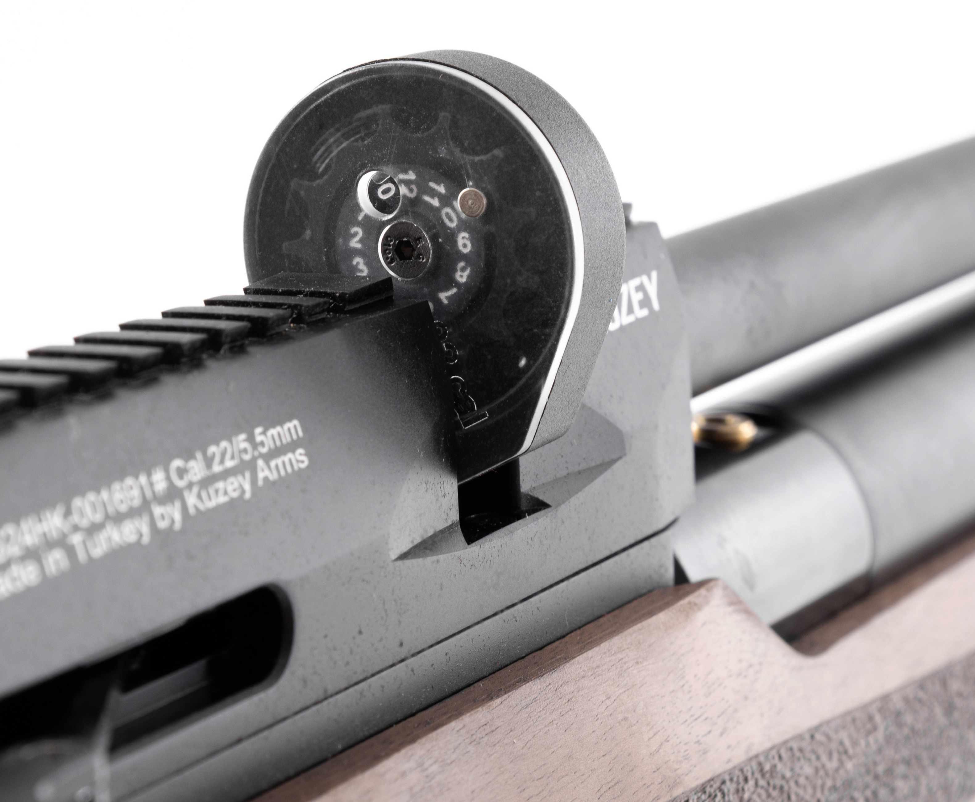 Обозреваемый образец Kuzey K60 5.5 мм сочетает в себе современные элементы оружия с классической ложей из дерева. Текстура орешника помогает ощутить в руках традиционную винтовку, длинна которой равна 106 сантиметрам, а масса 3.87 кг. Для повышения комфорта во время вкладки приклад оборудован регулируемым подщечником и упругим тыльником, помогая сделать соприкосновение с плечом при стрельбе более мягким.
