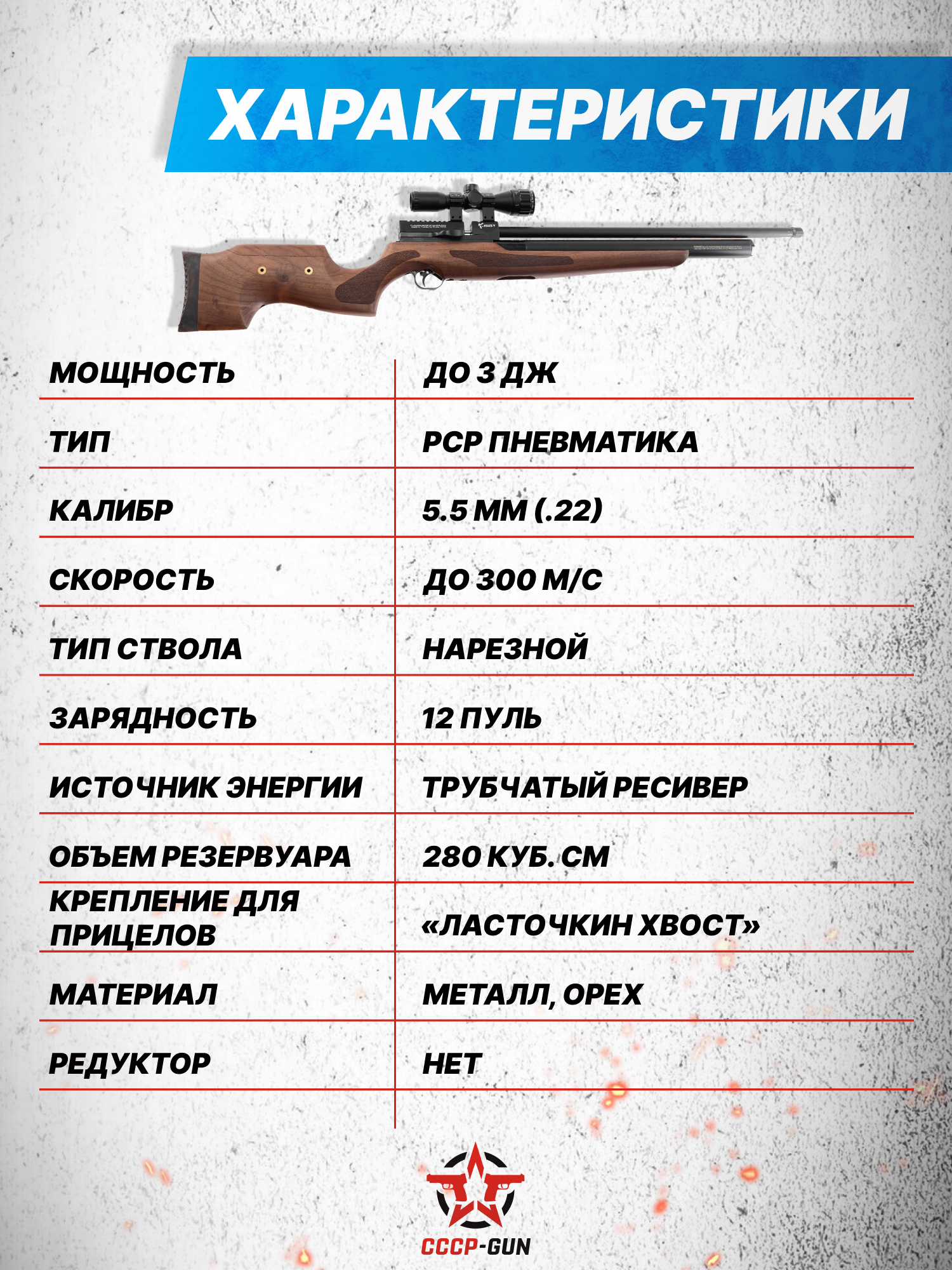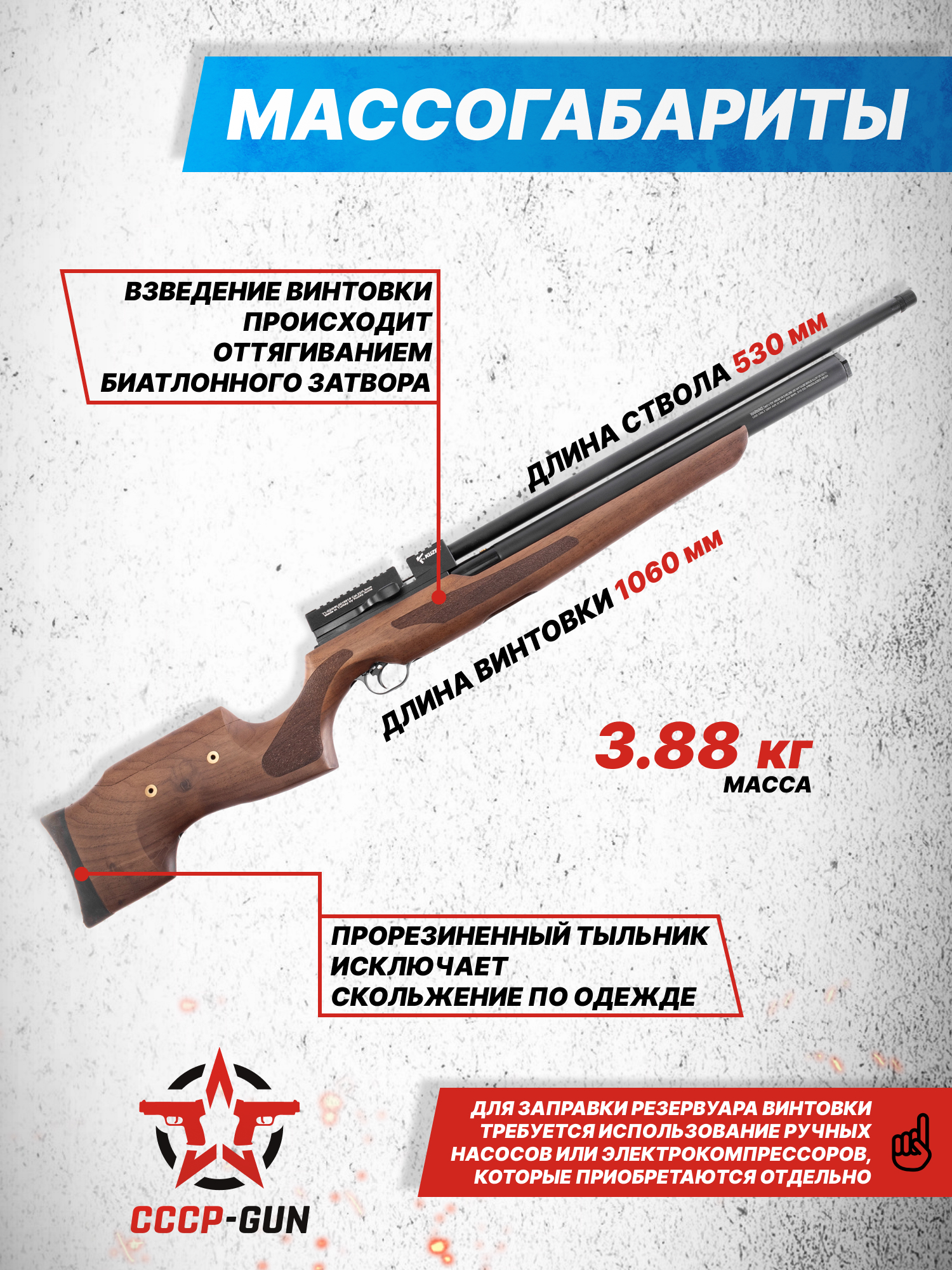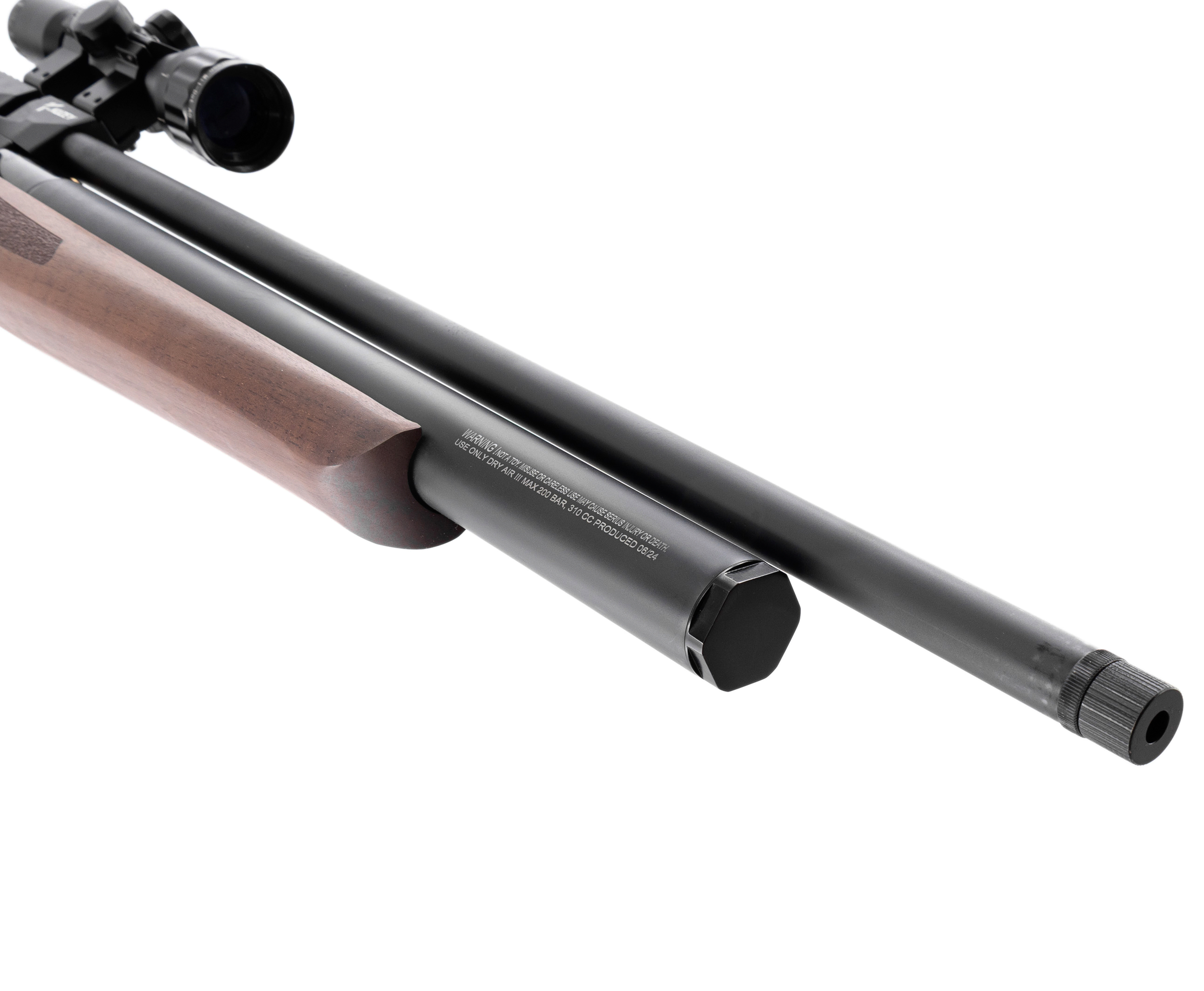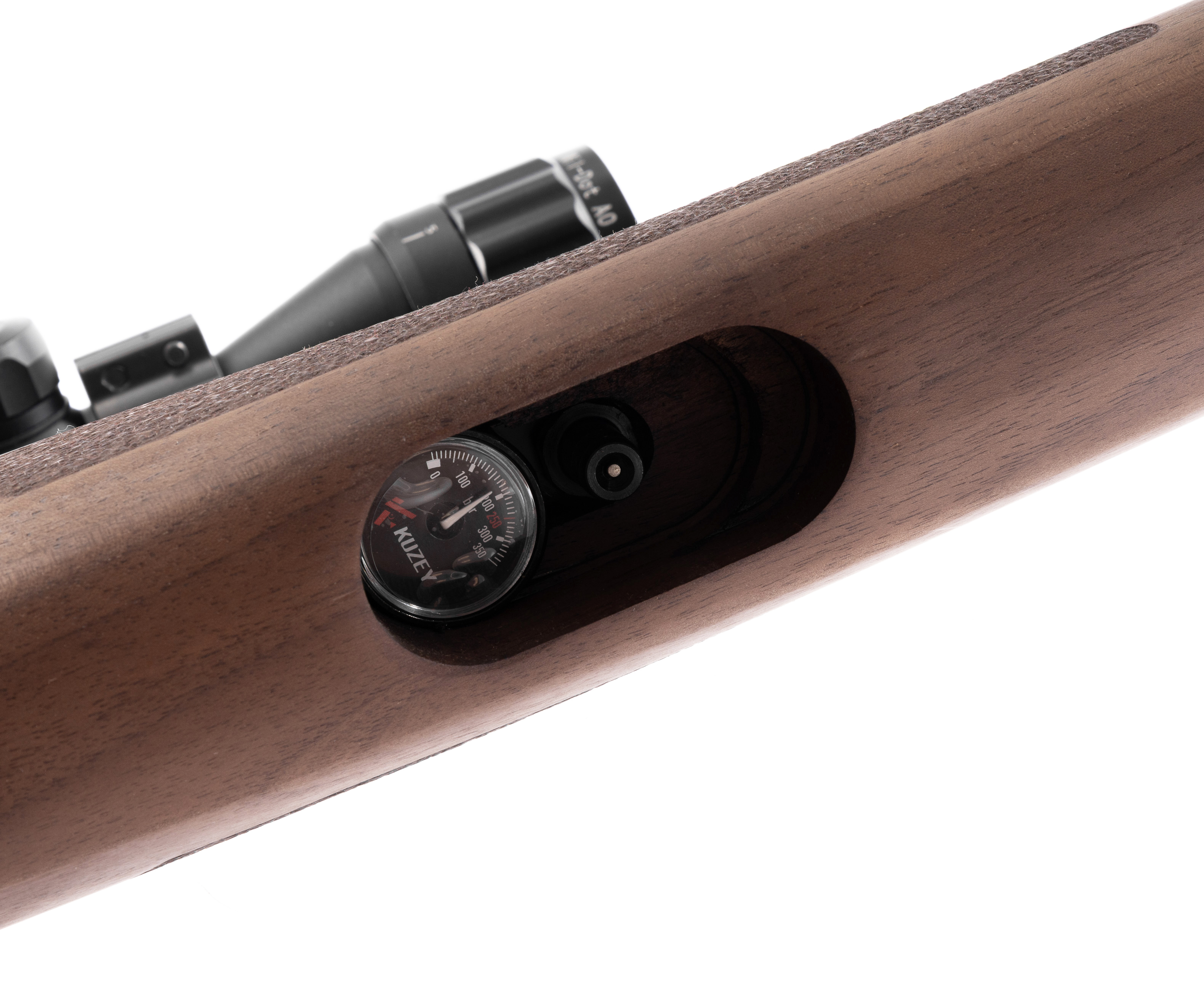 Так как представленная модель относится к PCP пневматике, оружие оборудовано ресивером в форме продолговатого цилиндра с объемом 280 кубических сантиметров. Заправляя винтовку воздухом через насос или компрессор, не стоит превышать отметку давления в 200 Бар, поскольку это может привести к быстрому износу прямоточного механизма, который при нажатии на спуск дозированно высвобождает газ для выталкивания пули.