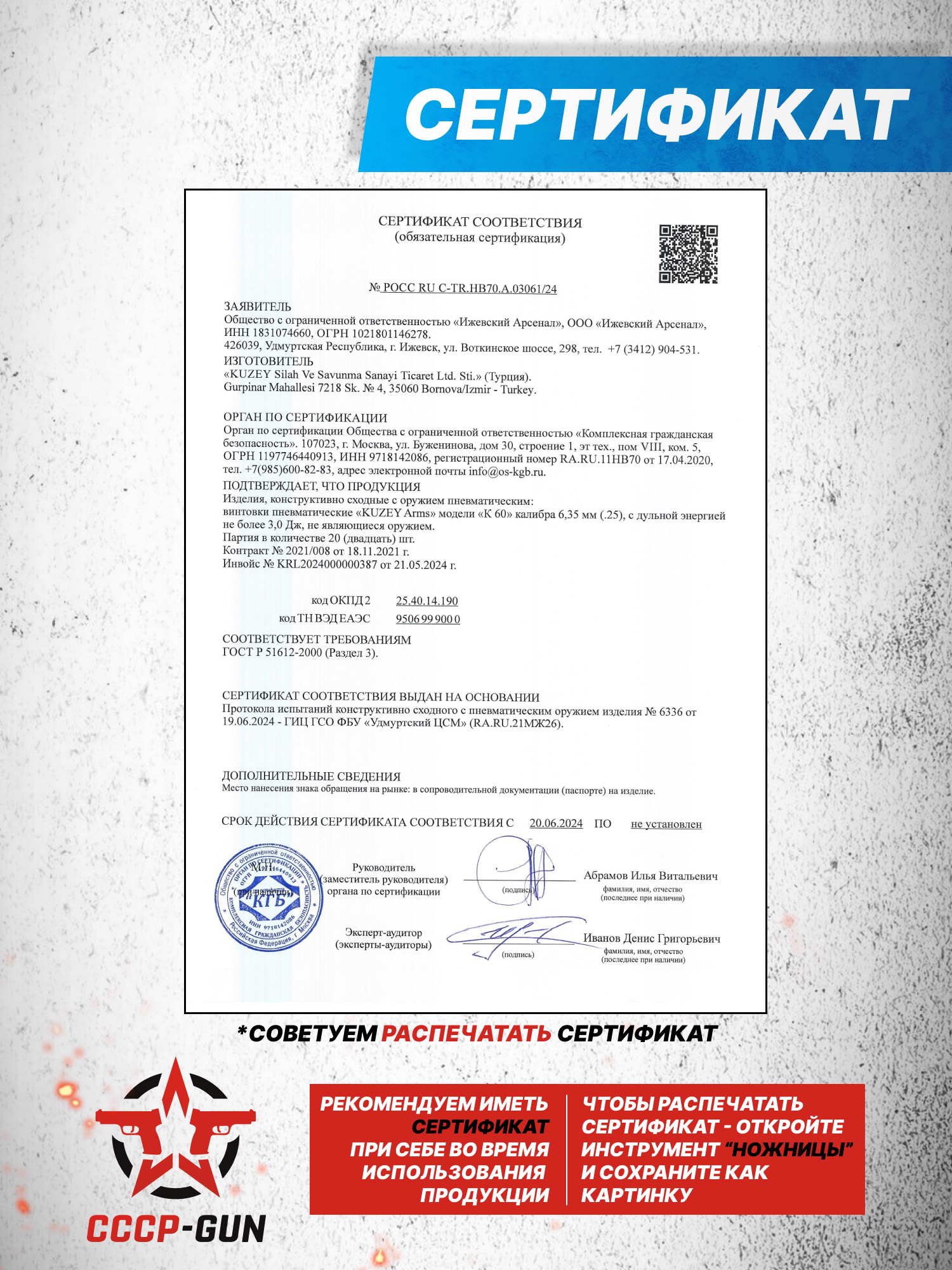Внимание! Данная модель поставляется в разрешенной мощности для свободного приобретения на территории Российской Федерации. При этом в модели имеется возможность увеличения мощности путем замены части деталей или настройки конструкции, однако не стоит забывать о Федеральном законе «Об оружии» № 150 - ФЗ. В случае необходимости, опираясь на данный закон и руководствуясь им, возможно, потребуется получить разрешение от ЛЛР ГУ МВД России после вмешательства в конструкцию.