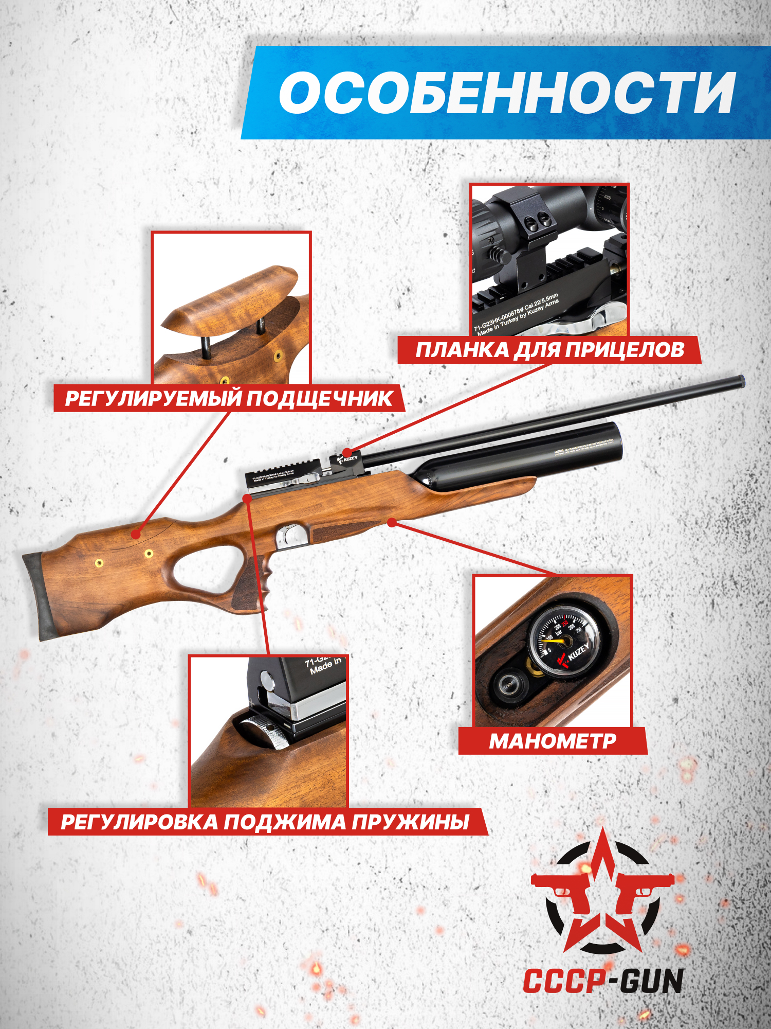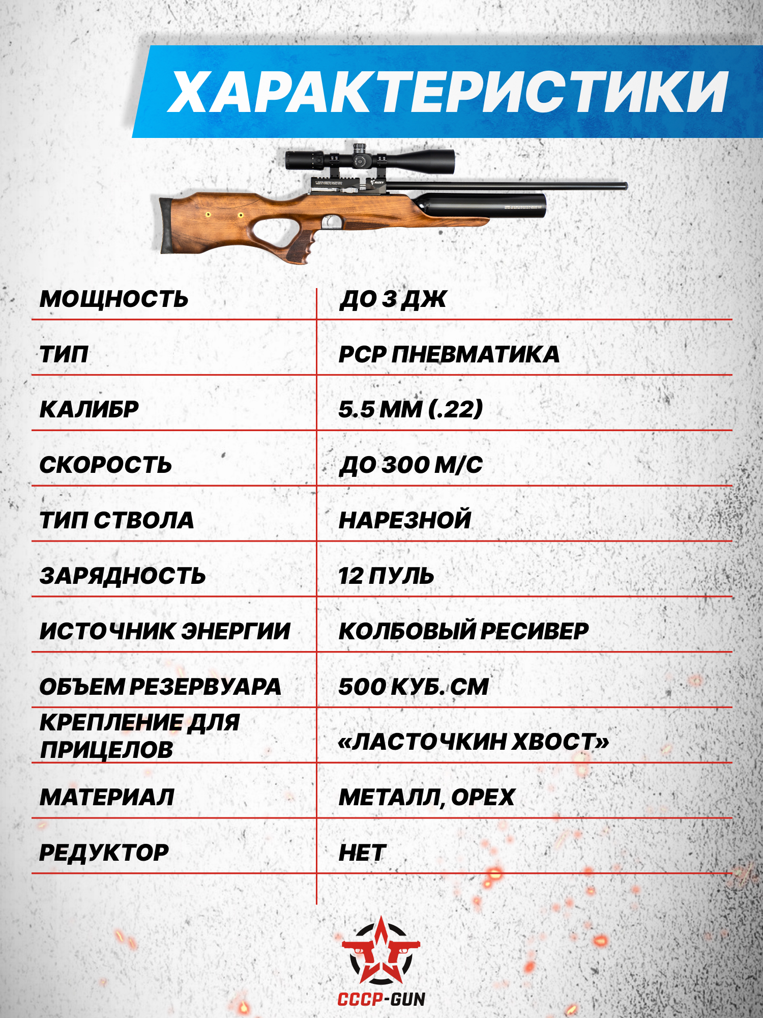 Под нарезным 5.5 мм ствольным бланком длиной 53 см спроектирована колба, используемая для предварительной накачки воздуха при помощи электрокомпрессора. Рекомендуемая отметка давления на встроенном манометре винтовки при заправке не должна превышать 250 Бар. Функционирует пневматика по типу прямотока, поэтому на полностью заправленном резервуаре объемом 500 кубических сантиметров, получится добиться высоких результатов мощности.