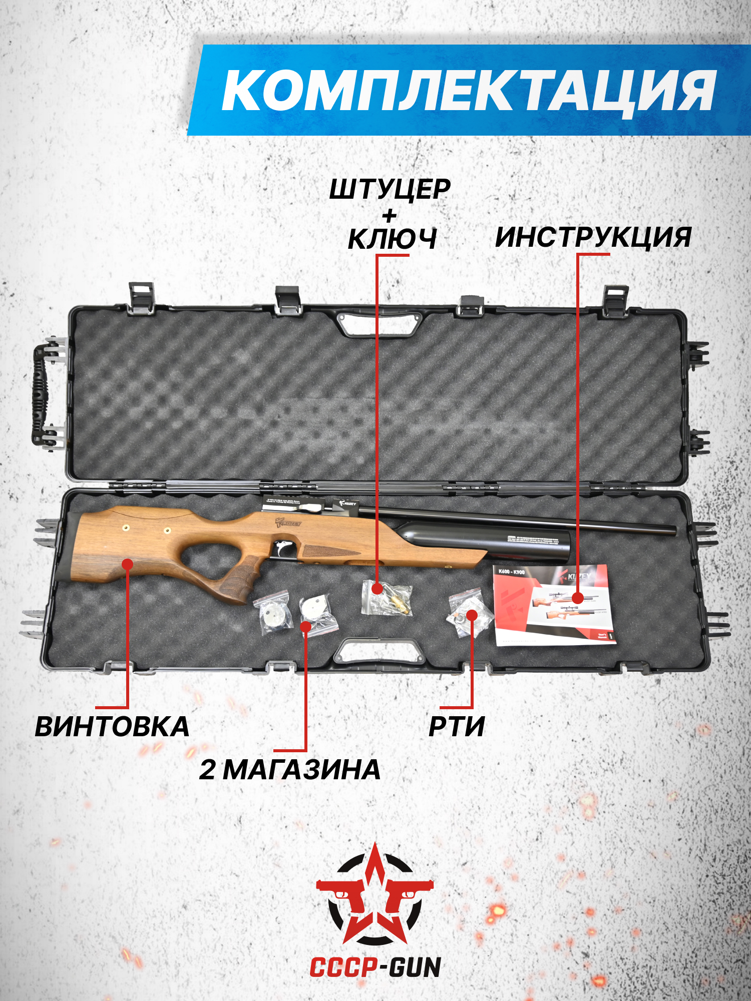 Обозреваемая модель K90 отличается винтажной деревянной ложей, изготовленной из премиального турецкого ореха. Корпус выполнен из металла с антикоррозийным покрытием, при этом инженерам Kuzey удалось создать винтовку с габаритами 1060 мм, вес которой не превышает 3.82 кг. Таким образом, работать с пневматикой легко, а для повышения комфорта пользователя дополнительно реализована пистолетная рукоять и ортопедический приклад с упругим затыльником и настраиваемой по высоте «щекой».