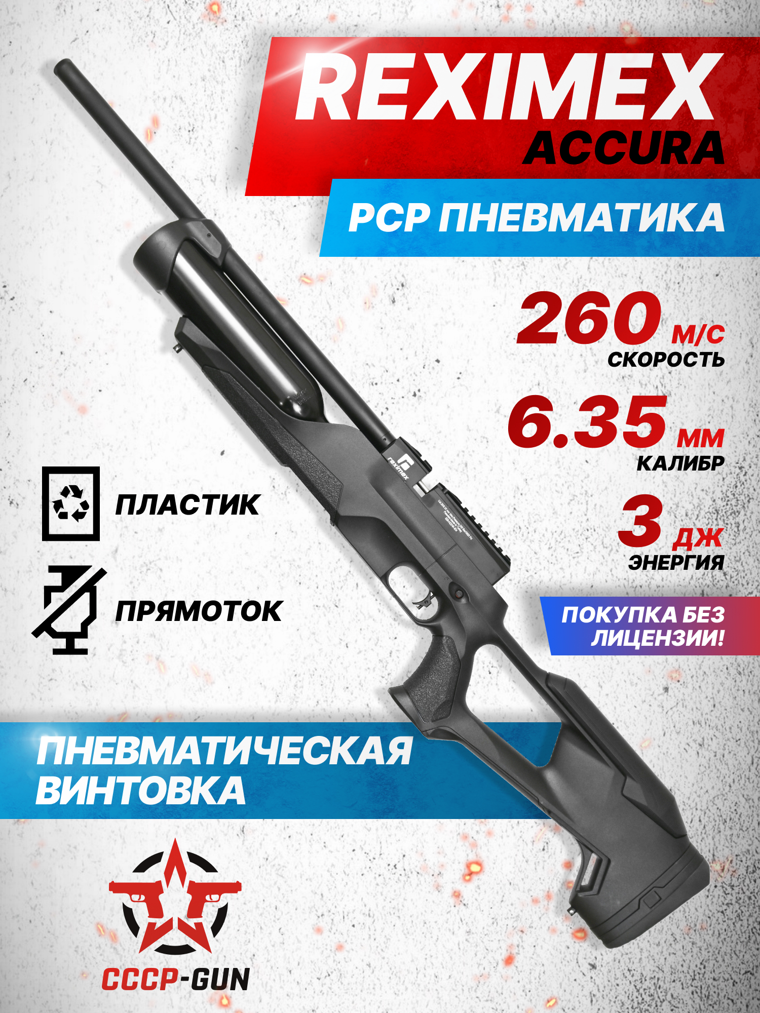В России винтовка не требует оружейной лицензии, потому как на территорию страны модель Accura поставляется с ограниченной до 3 J дульной энергией. Благодаря этому, начинающим стрелкам, спортсменам и любителям развлекательной стрельбы доступно свободное приобретение изделия без обращения в органы Росгвардии, что делает пневматику доступнее. Для повышения уровня безопасности пользователей, инженеры Reximex добавили компактный предохранитель в виде двусторонней утопленной в корпус кнопки.