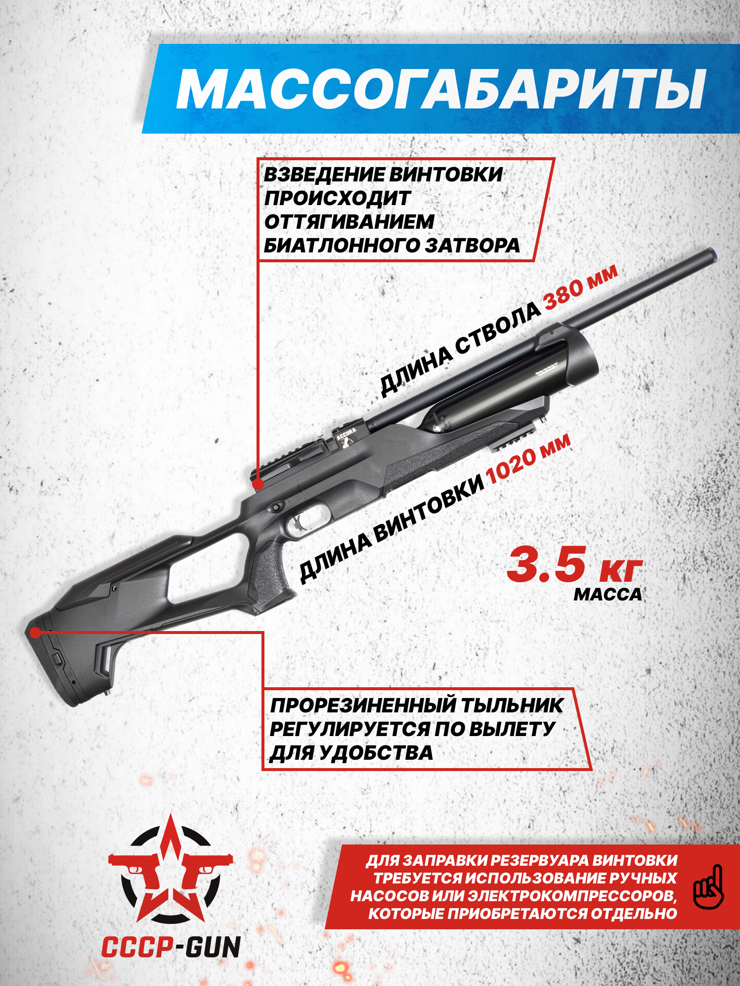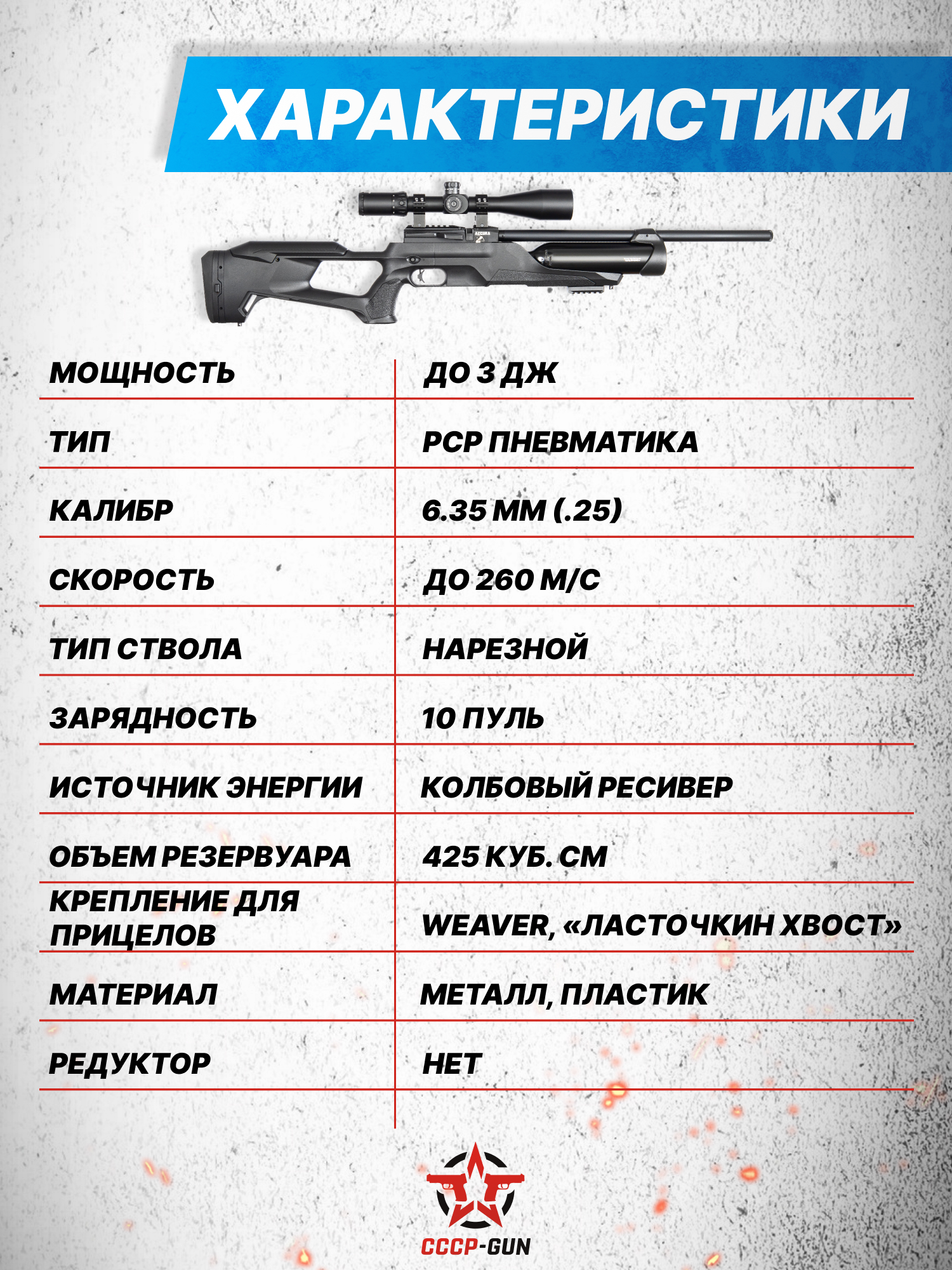 Внимание! Данная модель поставляется в разрешенной мощности для свободного приобретения на территории Российской Федерации. При этом в модели имеется возможность увеличения мощности путем замены части деталей или настройки конструкции, однако не стоит забывать о Федеральном законе «Об оружии» № 150 - ФЗ. В случае необходимости, опираясь на данный закон и руководствуясь им, возможно, потребуется получить разрешение от ЛЛР ГУ МВД России после вмешательства в конструкцию.