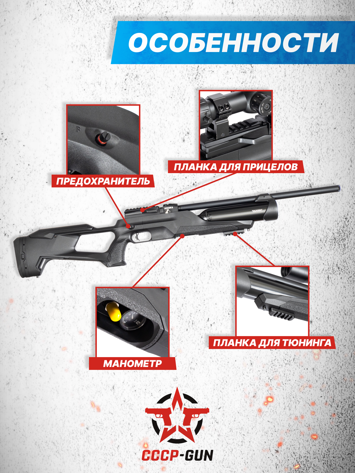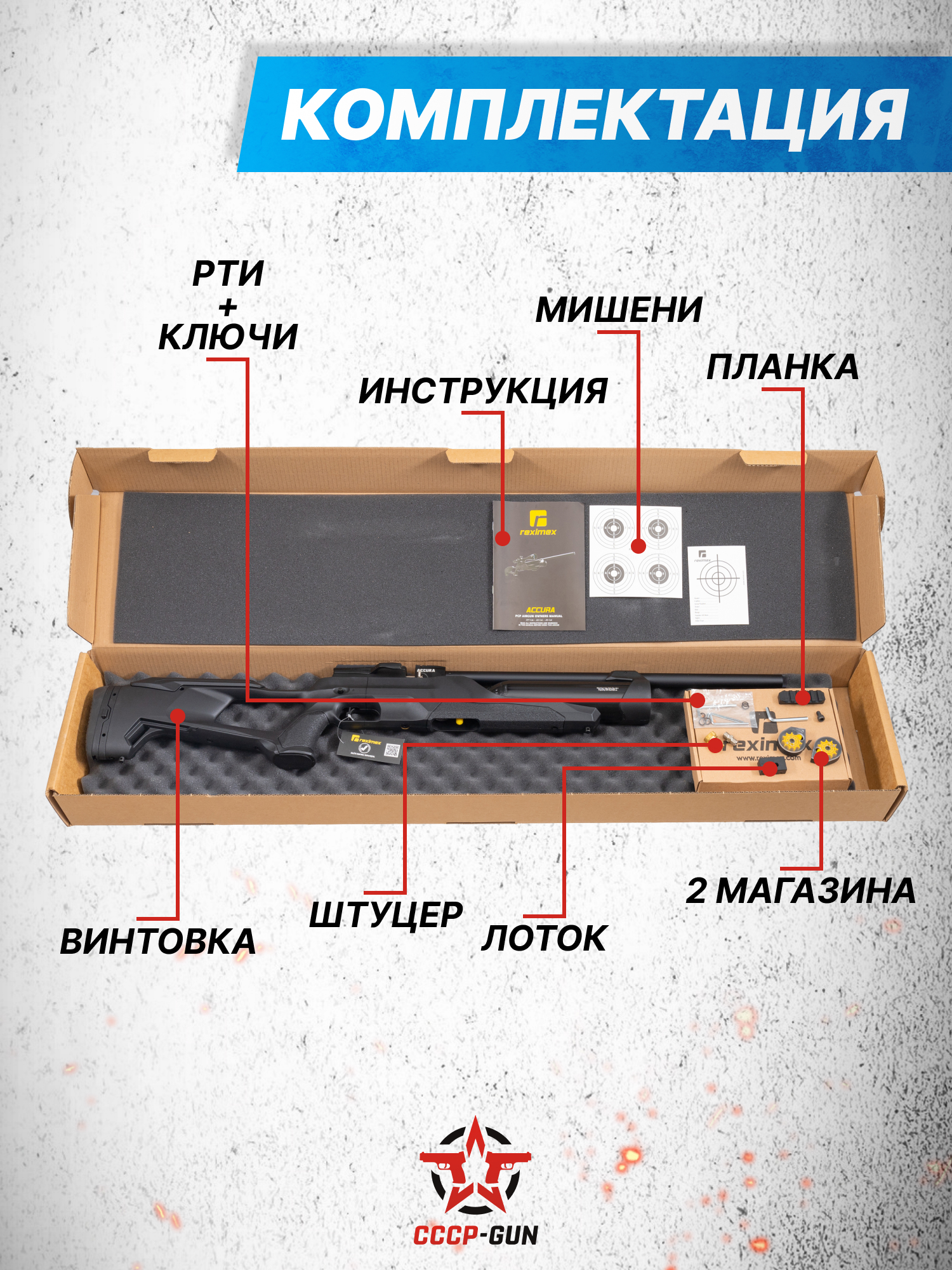 В наборе с пневматикой приложена планка Picatinny, которая закрепляется на резьбовом отверстии под колбой и служит базой для монтажа сошек, рукоятей или специальных приборов. Помимо этого, изделие оснащено комбинированной рельсой Weaver 22 мм и «Ластохвост» 11 мм для того, чтобы стрелок закреплял на винтовке прицельные устройства в виде оптики или коллиматоров. Комфортно передвигаться с Reximex Accura помогут спроектированные на ложе антабки, на которых фиксируется отдельно приобретаемый ремень.