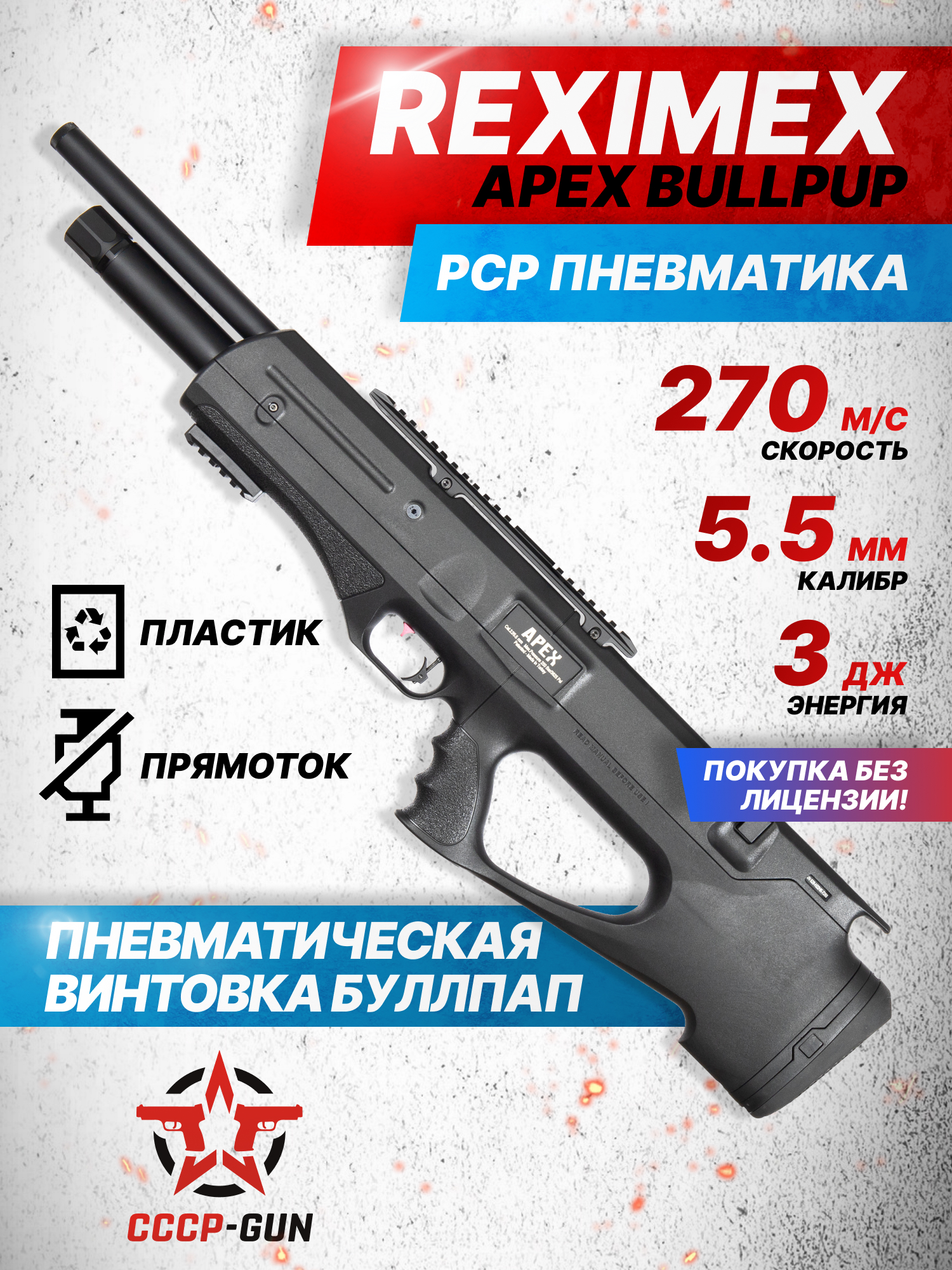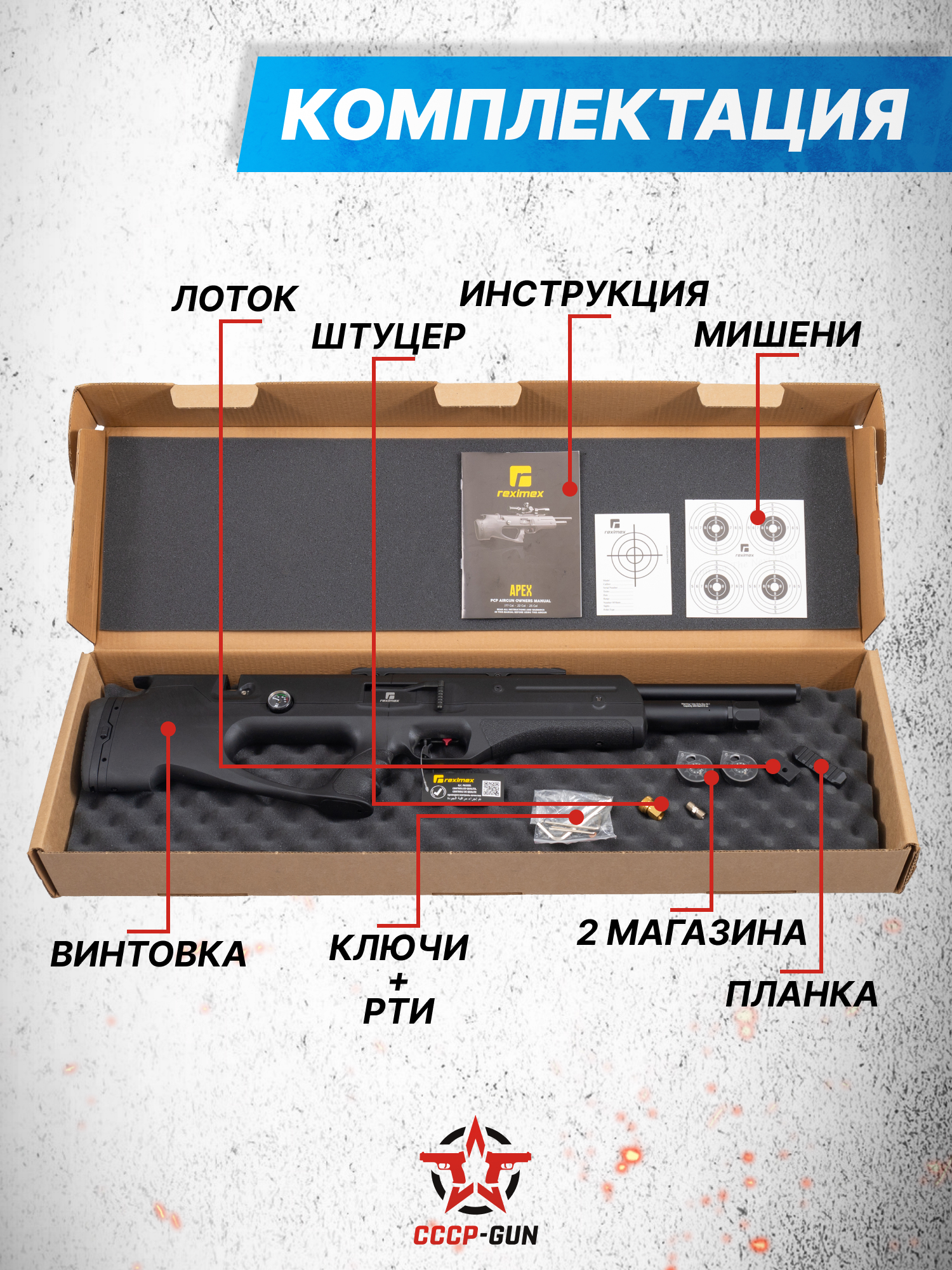 Для стрельбы из Reximex Apex в представленной вариации используются воланчиковые пули калибра 5.5 мм, заряжаемые в 12-местные магазины. Функционирует винтовка в одиночном режиме, а для увеличения комфорта рычаг взвода перемещен вперед, что также помогает ускорить темп. Опытным пользователям придется по душе предусмотренные в конструкции изделия регулировка спускового крючка и настройка мощности.