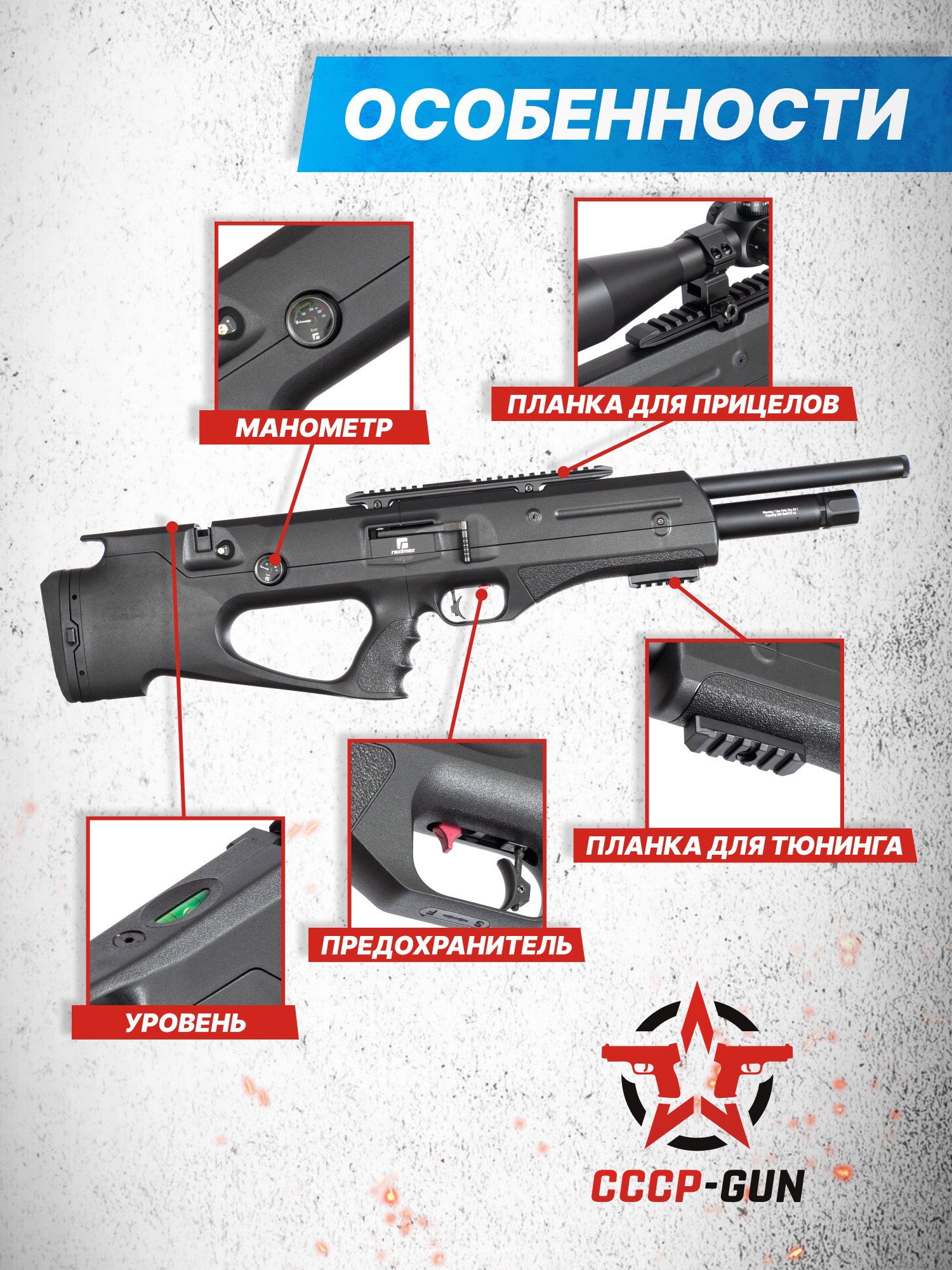 На корпусе обозреваемой пневматики добавлена направляющая Weaver 22 миллиметра, используемая для установки прицельных приспособлений в виде оптики или коллиматоров, которые приобретаются отдельно. В комплекте с винтовкой поставляется компактная планка формата Picatinny, фиксирующаяся на цевье и выполняющая роль крепежа для сошек, тактических рукоятей или специальных приборов.