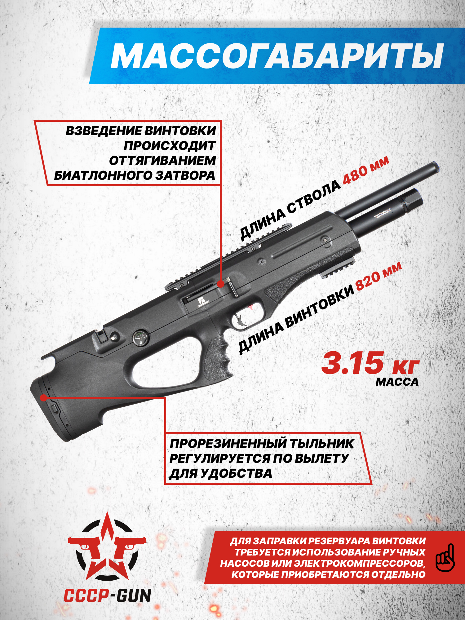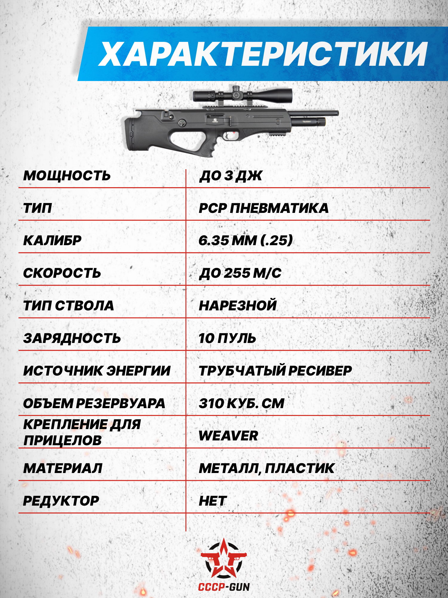 Внимание! Данная модель поставляется в разрешенной мощности для свободного приобретения на территории Российской Федерации. При этом в модели имеется возможность увеличения мощности путем замены части деталей или настройки конструкции, однако не стоит забывать о Федеральном законе «Об оружии» № 150 - ФЗ. В случае необходимости, опираясь на данный закон и руководствуясь им, возможно, потребуется получить разрешение от ЛЛР ГУ МВД России после вмешательства в конструкцию.