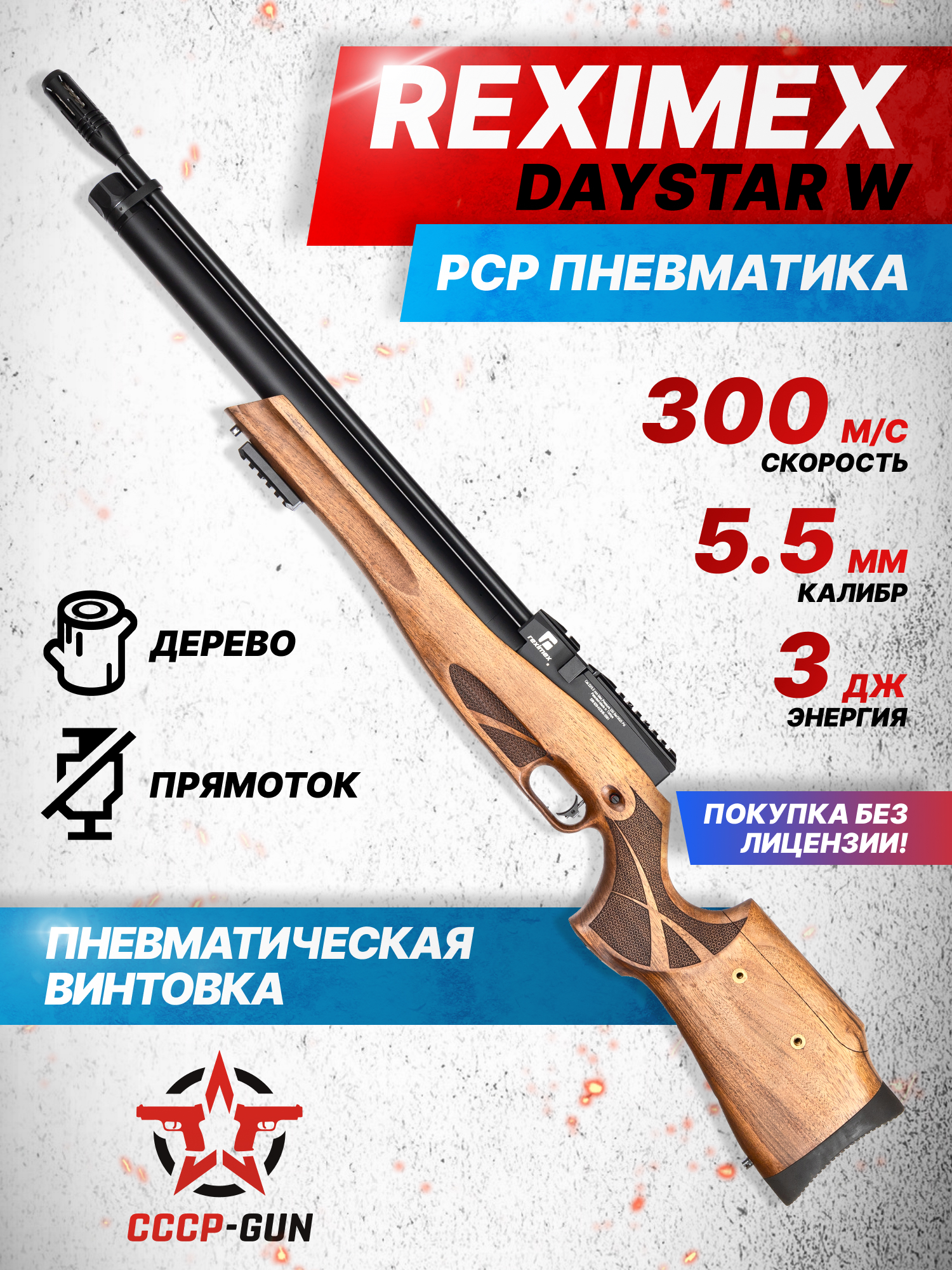 Главной особенностью представленного образца пневматического оружия является его повышенная мощность, дающая разгонять пулевой снаряд при выстреле до скорости больше 300 метров в секунду. С целью сохранить возможность свободного приобретения на российском гражданском рынке, винтовка Reximex Daystar W намеренно ослабляется по показателю дульной энергии, не превышающему предельную отметку в три Джоуля, что подтверждается сертификатом.