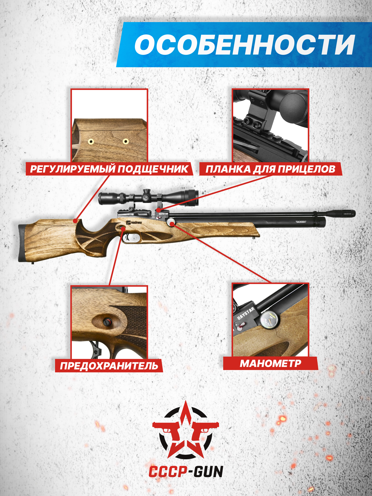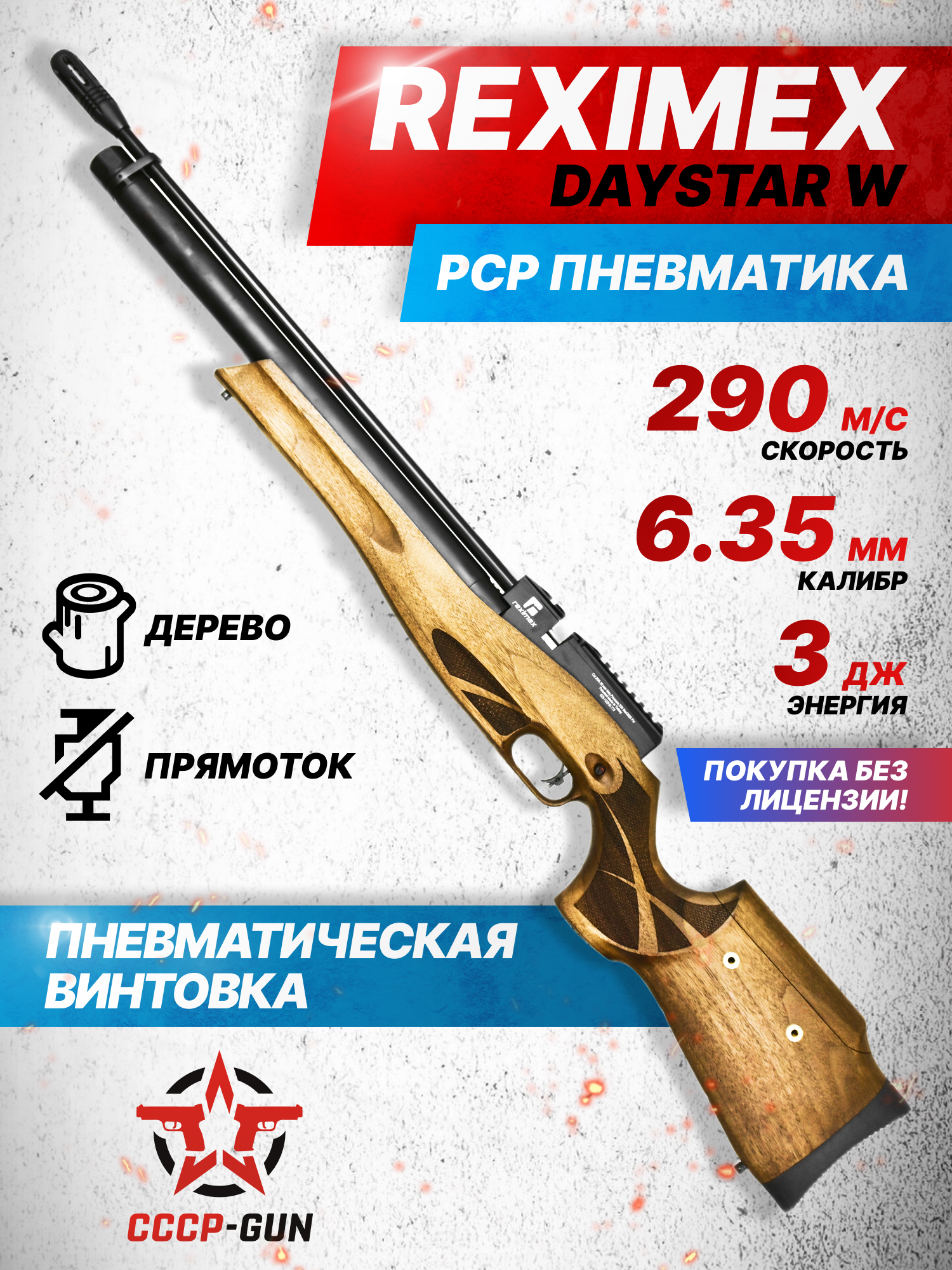 Daystar W 6.35 мм - модель стандартной компоновки, стилизованная под классическую винтовку. Оружие оснастили деревянной ложей - геометрия фурнитуры не только комфортна, но и притягательна с точки зрения дизайна за счет выдержанности геометрии. Помимо резинового затыльника в конструкции приклада присутствует настраиваемый подщечник, а на одну из антабок можно смонтировать планку под дополнительные приборы.
