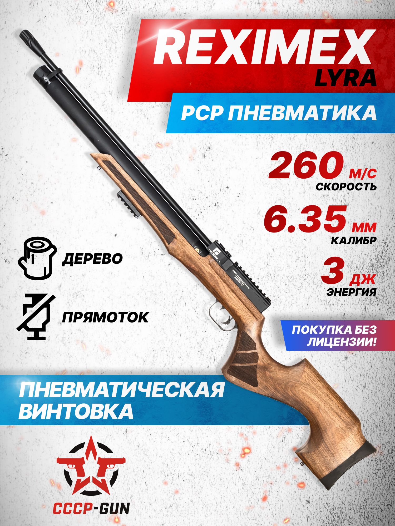 На территории Российской Федерации Reximex Lyra 6.35 орех продается без требования наличия лицензии, поэтому покупателям доступно свободное приобретение винтовки при предъявлении паспорта. Все потому, что производитель поставляет в страну изделия с разрешенной в пределах 3 Джоулей дульной энергией. С помощью модернизации и установки усиленных деталей скорость полета свинцовых снарядов может увеличииться до 260 метров в секунду.