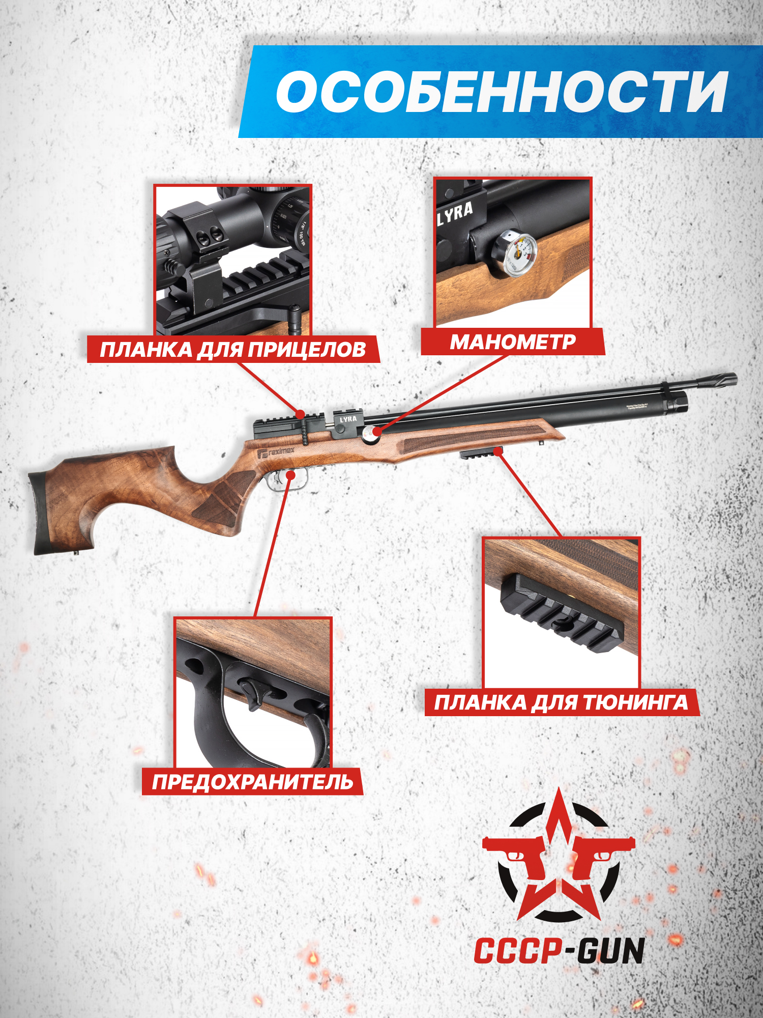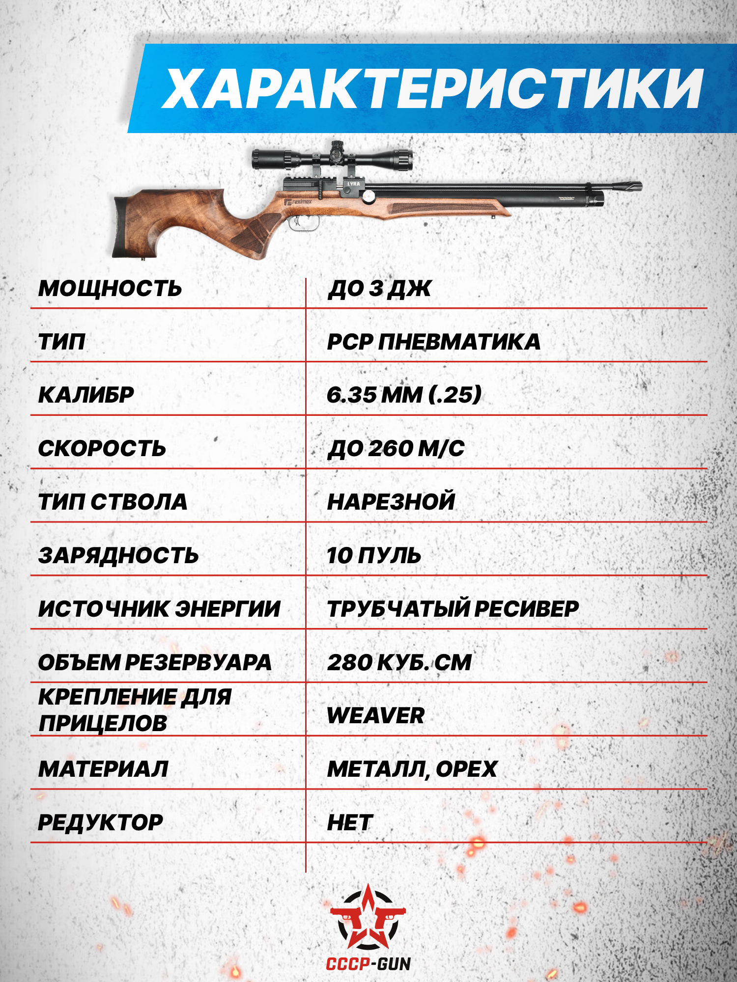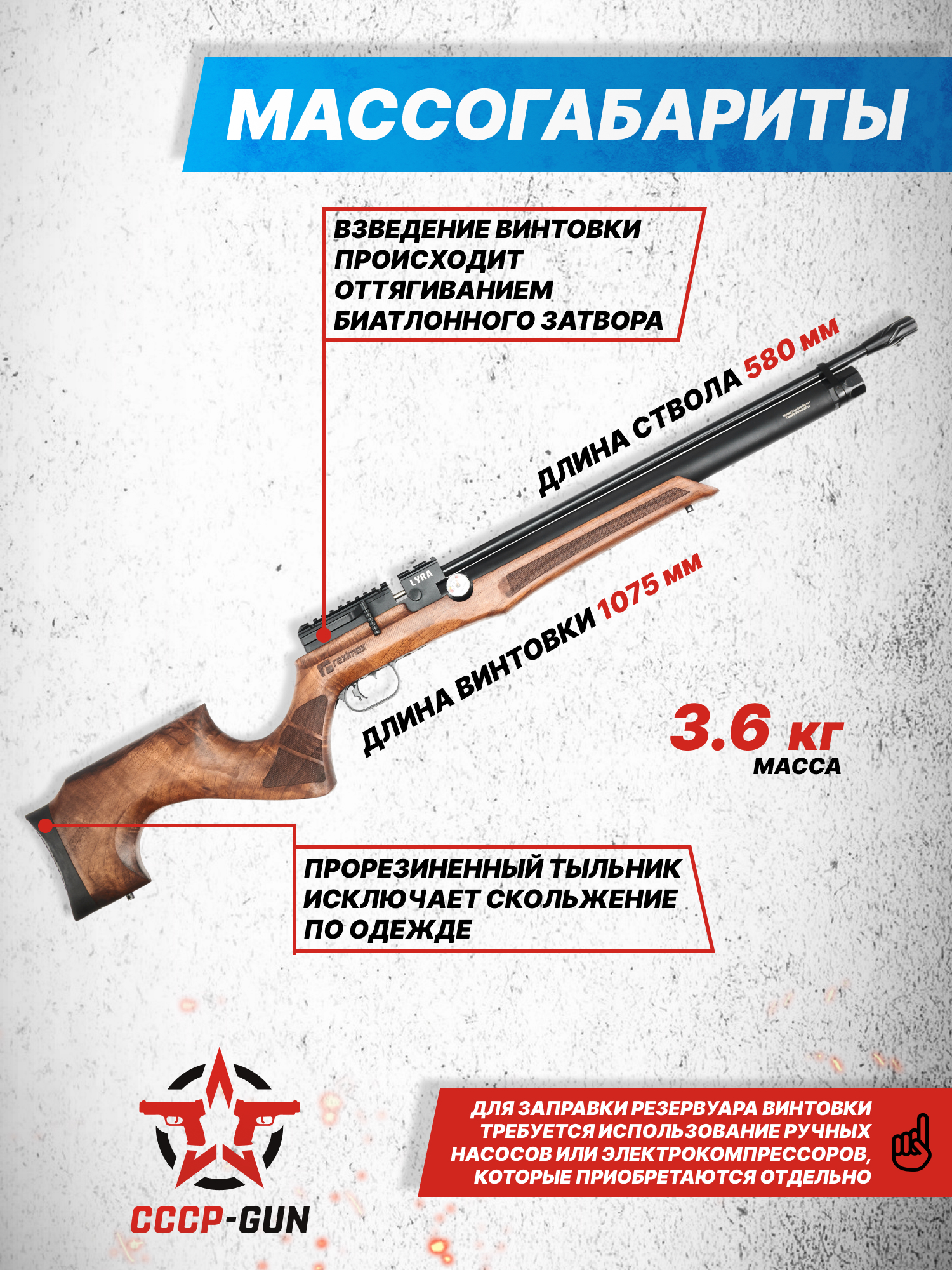Внимание! Данная модель поставляется в разрешенной мощности для свободного приобретения на территории Российской Федерации. При этом в модели имеется возможность увеличения мощности путем замены части деталей или настройки конструкции, однако не стоит забывать о Федеральном законе «Об оружии» № 150 - ФЗ. В случае необходимости, опираясь на данный закон и руководствуясь им, возможно, потребуется получить разрешение от ЛЛР ГУ МВД России после вмешательства в конструкцию.