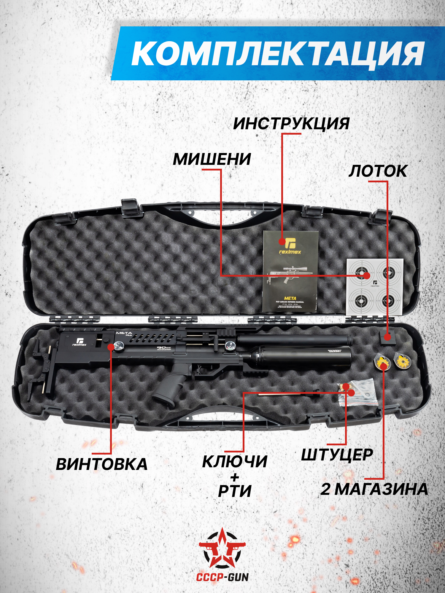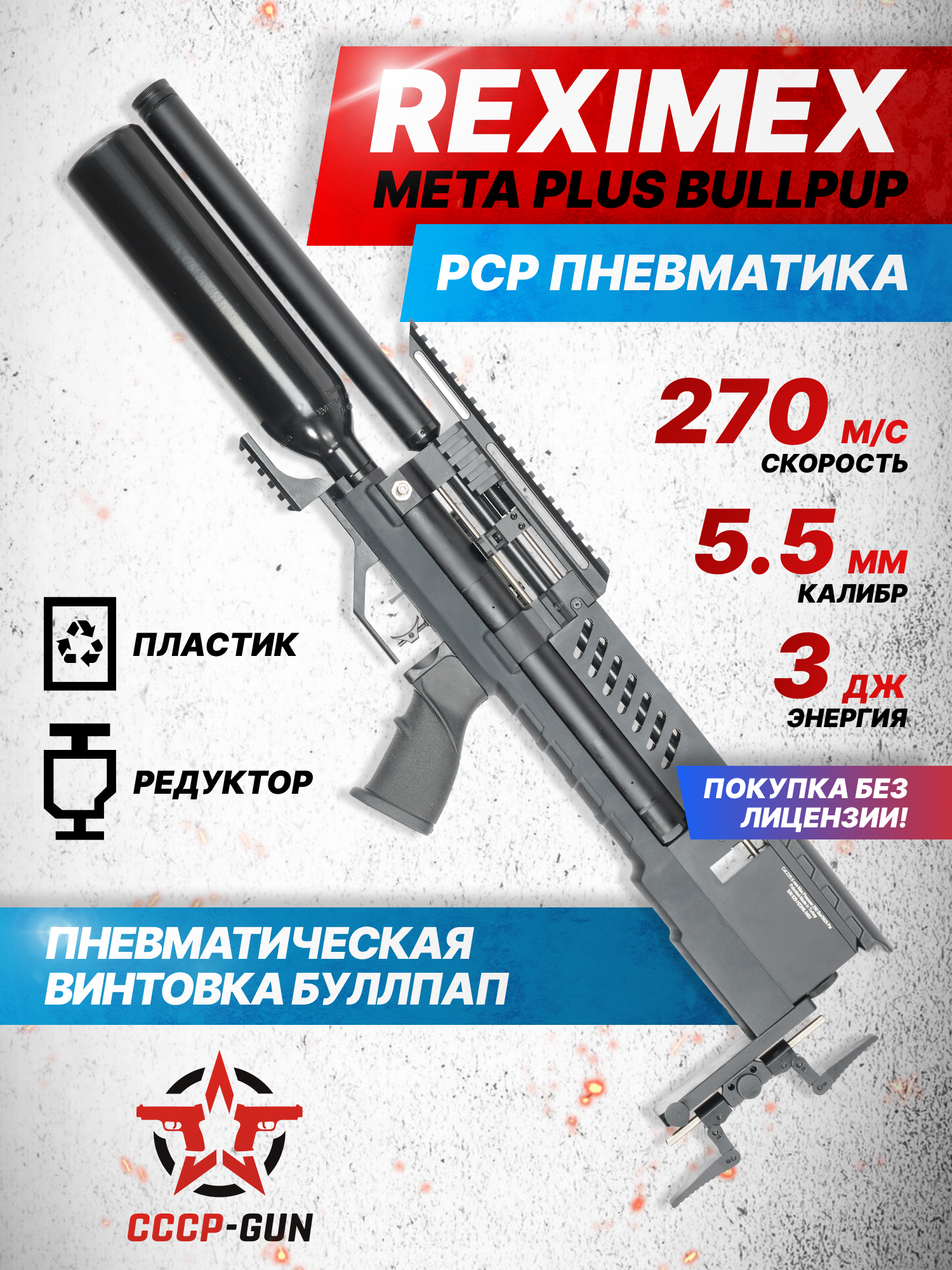 Рексимекс ПСП винтовки модели Мета Плюс в заводском варианте разгоняют свинцовые пули до показателя скорости, равного 270 м/с, однако для соблюдения закона на территорию РФ изделия поступают с ограниченной до 3 Дж дульной энергией. Такая опция дает право приобретать пневматику пользователям, у которых нет специального разрешения от Росгвардии, что делает модель доступной для начинающих спортсменов. Чтобы работать с винтовкой было безопасно конструкторы компании добавили перед спусковым крючком ручной предохранитель.