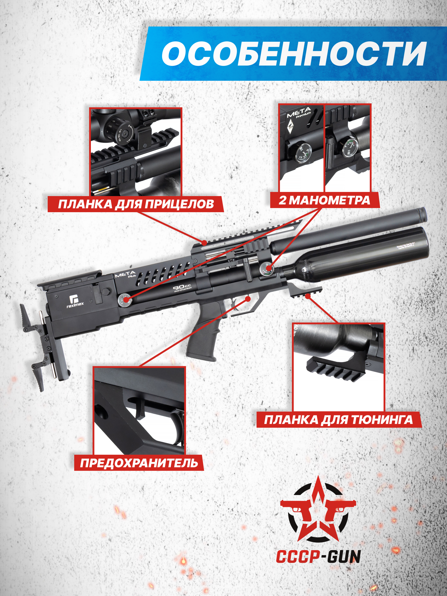Обозреваемая модель относится к редукторной пневматике с встроенной регулировкой мощности, поэтому на одной закачке владельцу удастся сделать больше выстрелов. Также Meta Plus отличается специальной форкамерой с дополнительным колбовым резервуаром, поэтому объем ресивера увеличен до 515 кубических сантиметров. Рабочее давление, рекомендуемое производителем, составляет 250 Бар, а для контроля процесса заправки через компрессор на винтовке добавлено сразу два манометра.