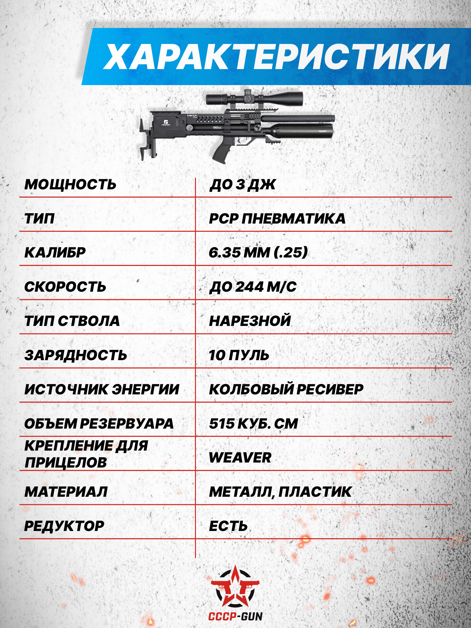 Винтовка Рексимекс Мета Плюс 6.35 оборудована колбовым ресивером и специальной форкамерой, поэтому общий объем резервуара в рассматриваемой версии увеличен до 515 кубических сантиметров. Такая система дополнена сразу двумя манометрами для отслеживания давления во время накачки через компрессор в пределах 250 Бар. Благодаря интегрированному редуктору и регулятору мощности пневматика получилась экономичной, что позволяет выполнять больше выстрелов без дозаправки.