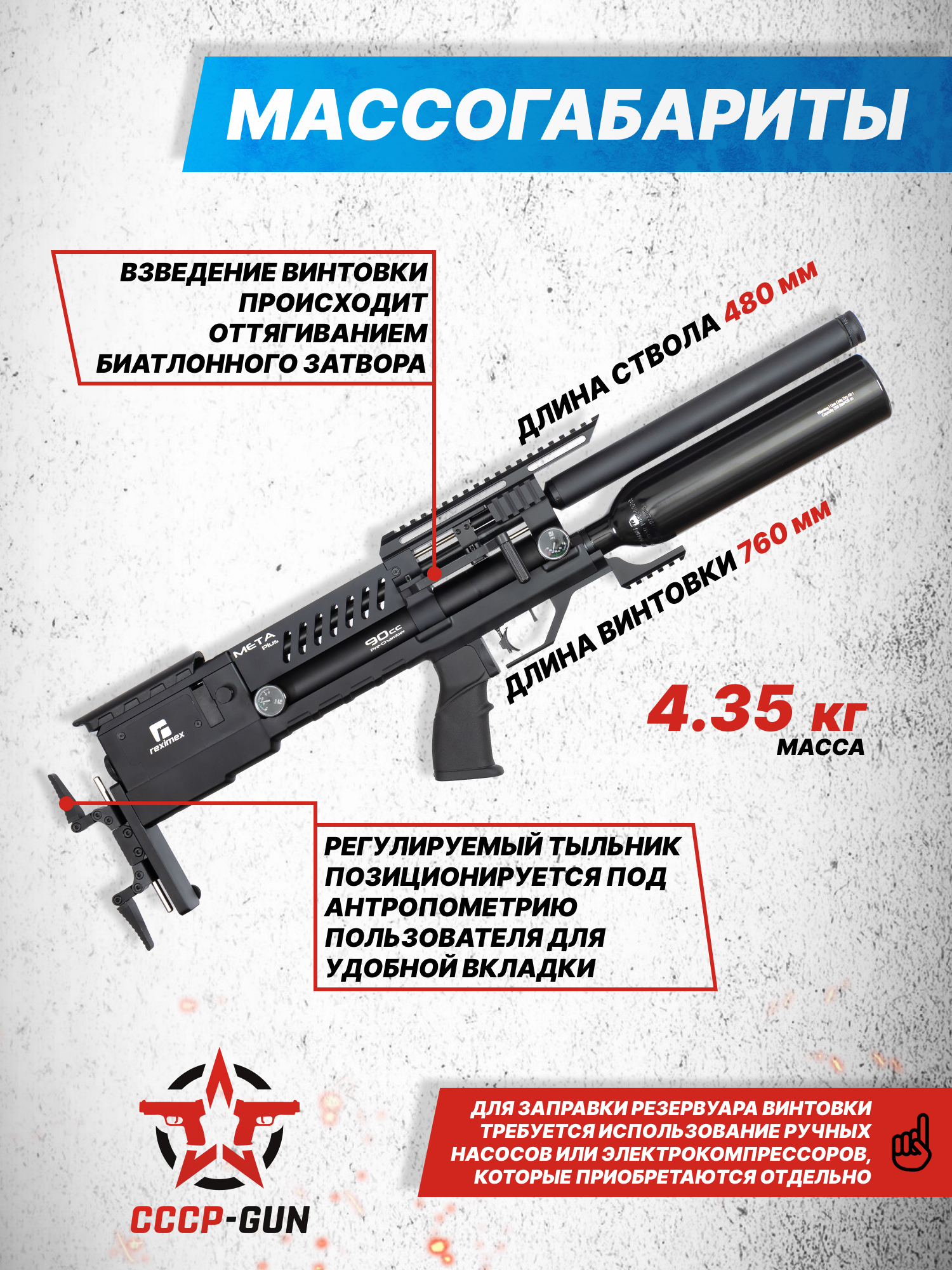 Reximex Meta Plus - это пневматическая винтовка с компоновкой формата Bull-Pup, которая сокращает длину всего изделия до 76 сантиметров. Поскольку корпус оружия металлический, а ложа изготовлена из ударопрочного пластика, масса модели равна 4.35 кг. Производитель позаботился об эргономике и интегрировал в конструкцию винтовки рукоятку типа AR-15 с прорезиненным покрытием и настраиваемой в трех плоскостях насадкой тыльника, которая регулируется с помощью комплектного шестигранника и дополнена съемным моноподом.