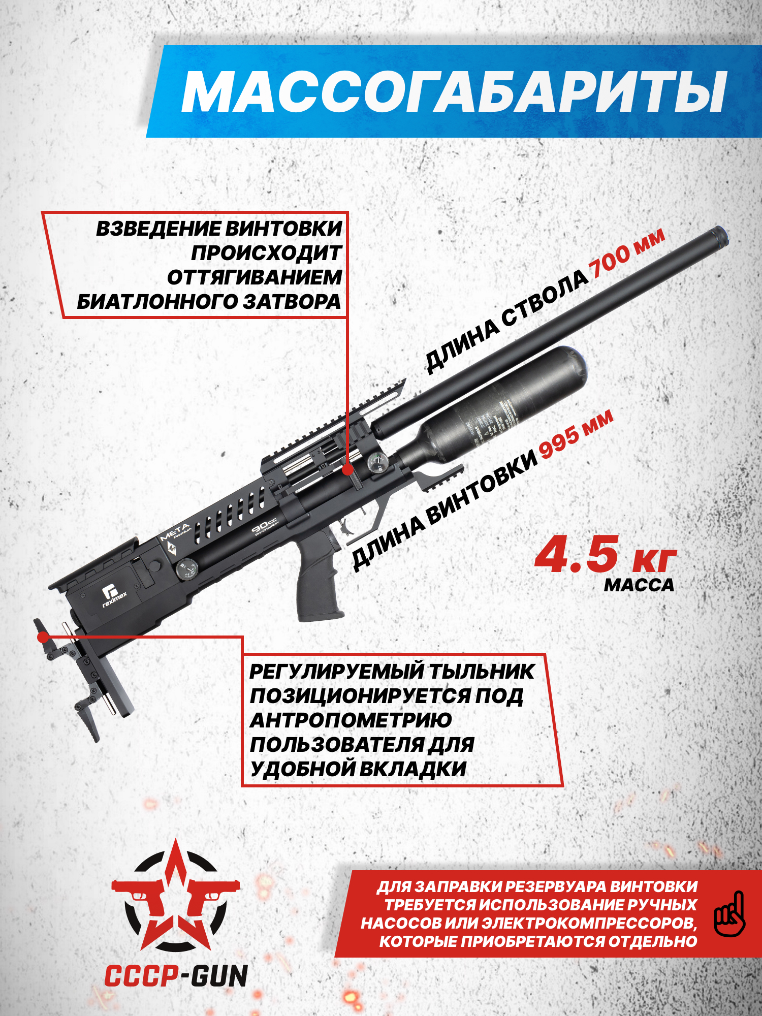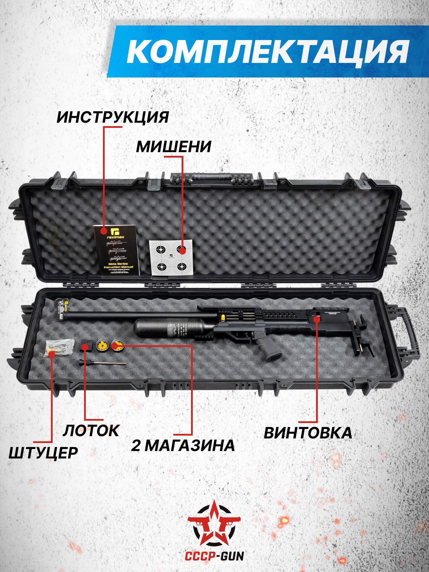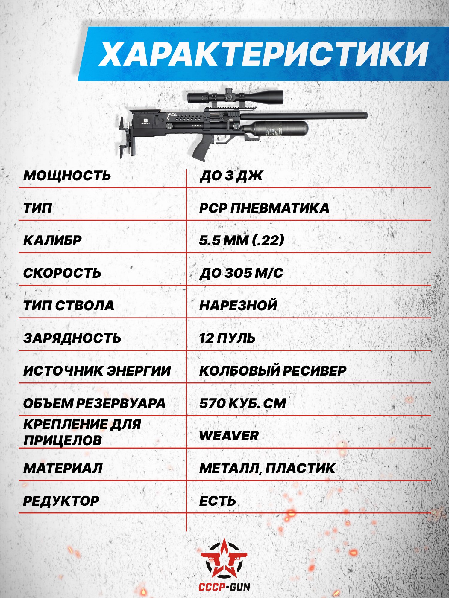 Обозреваемая модель относится к редукторной PCP пневматике с компоновкой Bull-Pup в пластиковой современной ложе. Благодаря этому габариты винтовки, несмотря на удлиненный ствол в 700 мм, составляют всего 100 см, а масса не превышает 4.5 кг. Важно отметить, что указанный стальной бланк с нарезным каналом оборудован модератором звука, позволяющим снизить шум от выстрела, для повышения комфорта пользователя.