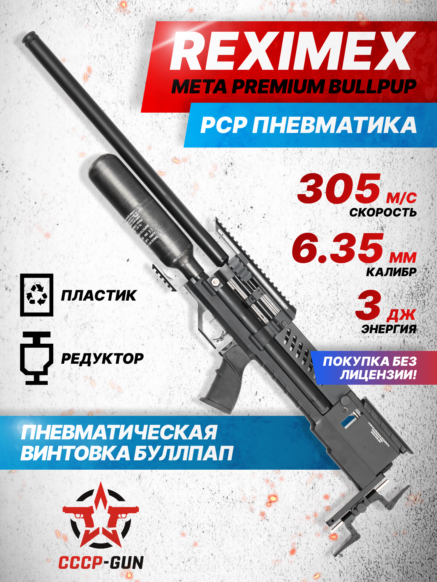 Reximex Meta Premium 6.35 мм отличается удлиненным 70-сантиметровым стволом, под которым установлена толстостенная колба со специальной форкамерой, при этом полный объем системы составляет 570 кубических сантиметров. Винтовка оборудована редуктором и регулятором мощности, помогая выполнить больше выстрелов на одной заправке. Производитель рекомендует отслеживать давление по двум встроенным в корпус манометрам и не переходить за рамки 250 Бар, а для ускорения закачки советуется применять электрический компрессор.