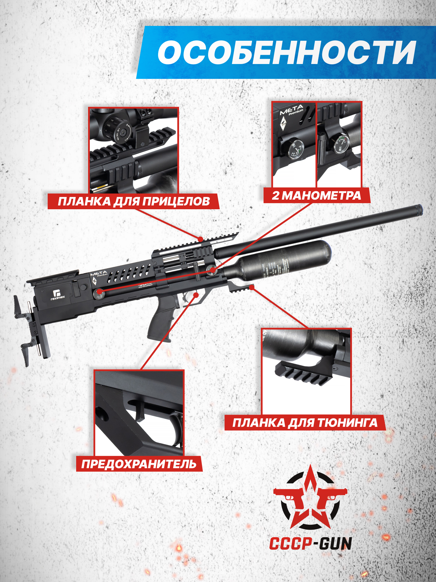 Корпус изделия изготовлен из металла с защитным покрытием от коррозии, при этом материалом ложа выступает ударостойкий полимер. Как и в других вариациях модели Мета, обозреваемая винтовка создана в Bull-Pup компоновке, благодаря чему общая длина снижается до 995 мм, а масса приравнивается к 4.5 кг. Комфортная вкладка обеспечивается за счет прорезиненной пистолетной рукояти и настраиваемого по трем плоскостям каркасного затыльника приклада со съемным моноподом.