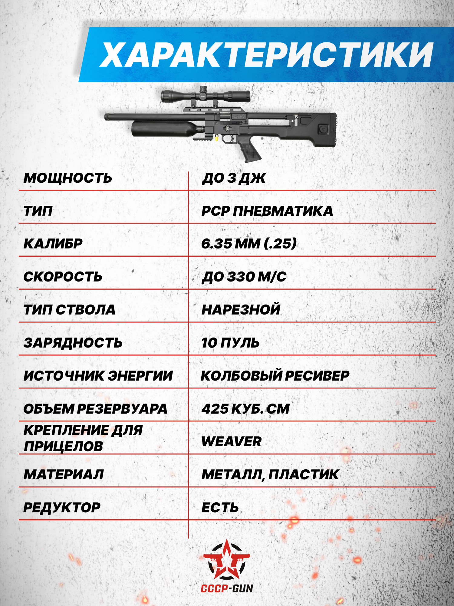 Внимание! Данная модель поставляется в разрешенной мощности для свободного приобретения на территории Российской Федерации. При этом в модели имеется возможность увеличения мощности путем замены части деталей или настройки конструкции, однако не стоит забывать о Федеральном законе «Об оружии» № 150 - ФЗ. В случае необходимости, опираясь на данный закон и руководствуясь им, возможно, потребуется получить разрешение от ЛЛР ГУ МВД России после вмешательства в конструкцию.